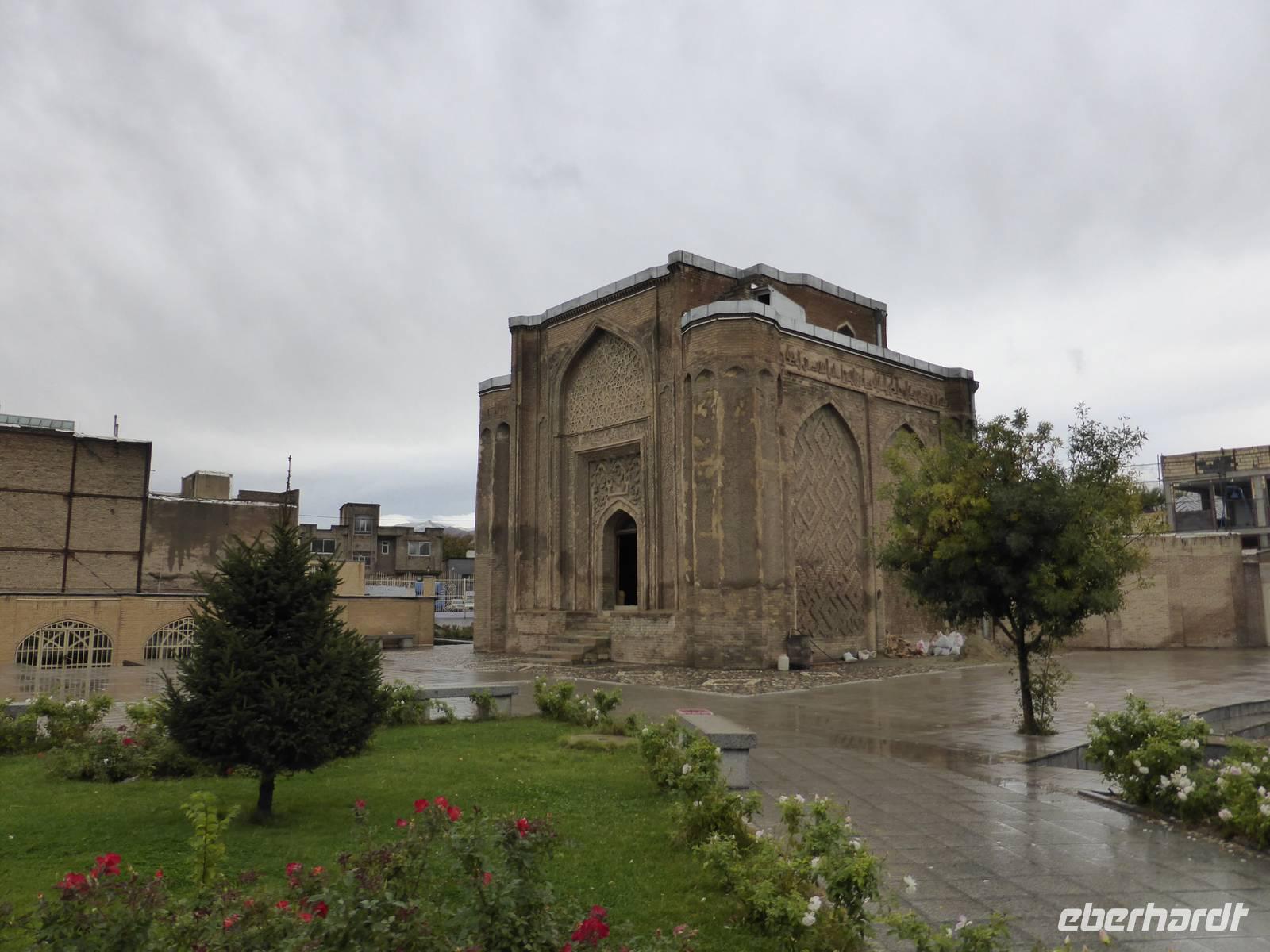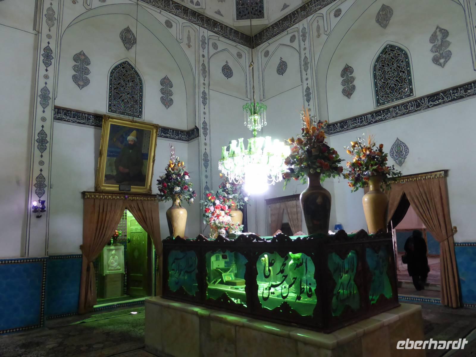 Vom Monument aus fuhren wir in westlicher Richtung nach Qazwin, im 16.Jh. Hauptstadt des safawidischen Reiches. Nach einem Fotostopp am qadjarischen Stadttor, durch welches einst die Karawanen zogen, besichtigten wir das Imamzadeh Hossein, das Mausoleum Hosseins . Er war ein Sohn des 8. Imam Reza und verstarb in Qazwin auf der Durchreise nach Khorasan. Das Mausoleum beeindruckt durch Spiegelmosaike, welche tausendfach das Licht brechen, so dass es überall funkelt und glitzert. Im Inneren steht der Holz-Sarg von Hossein, welcher von einem silbernen Gitter umgeben ist, an dem die Pilger ihre Wünsche äußern können. Das Mausoleum wird wieder verlassen, indem man aus Respekt vor dem Beigesetzten rückwärts zur Tür hinaus geht. Nach dem Besuch der Pilgerstätte fuhren wir zu unserem Hotel in Zanjan. Bereits um 17.30 Uhr begann die Dämmerung und bei unserer Ankunft gegen 19.00 Uhr war es längst dunkel.