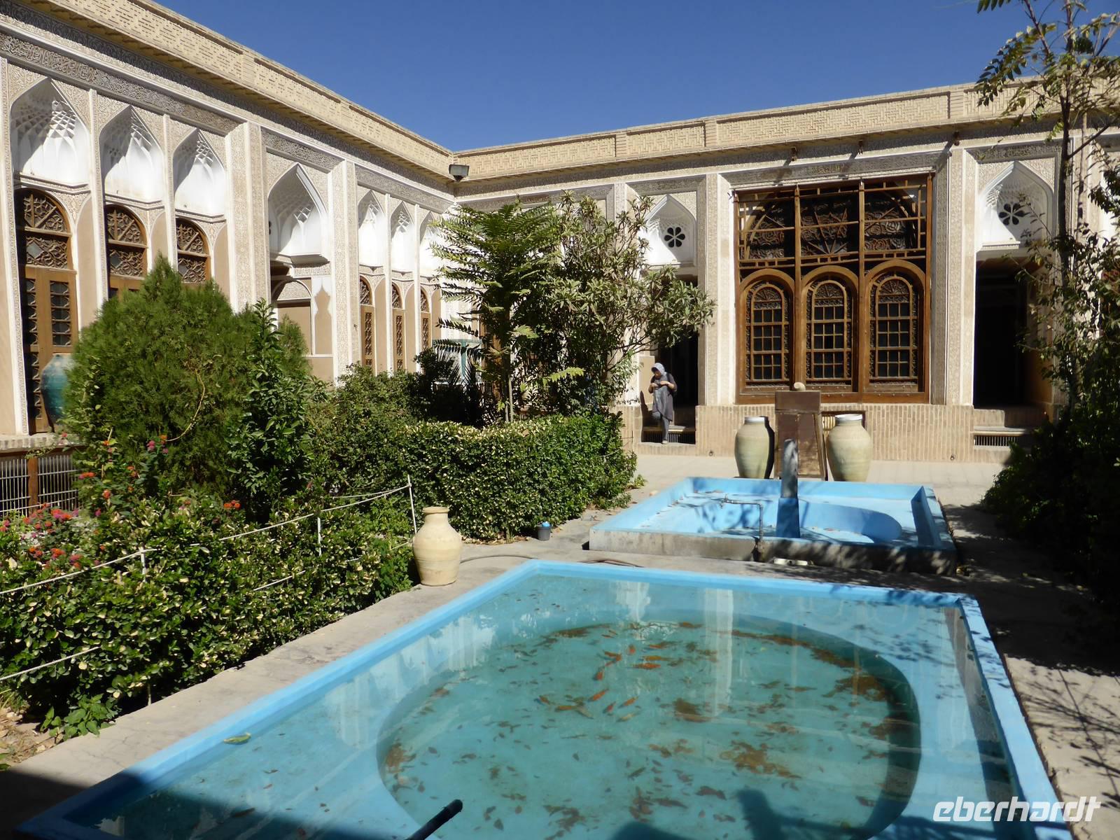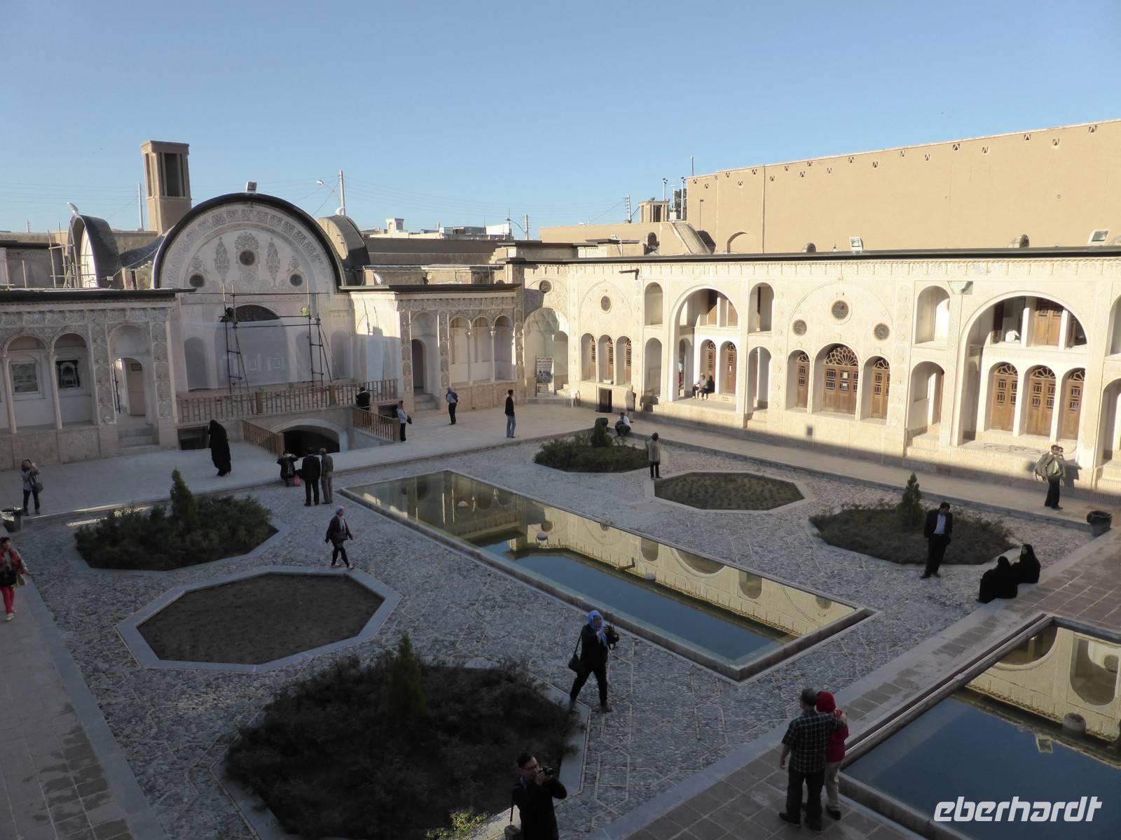 Wir fuhren auf der Autobahn in östliche Richtung nach Saveh und von dort weiter Richtung Delijan. Unterwegs hielten wir an Granatapfel-Verkaufsständen und an einer Granatapfel-Plantage. Der Granatapfel stammt aus Persien und galt bei den Zoroastriern als Symbol für die Medizin. Hinter Delijan machten wir an der Moschee von Khaveh einen Stopp. In dieser Ortschaft werden vor dem Ashura-Fest die Teppiche aus den Moscheen anderer Orte gewaschen, da das Wasser Khavehs als heilig und rein gilt. Am Nachmittag erreichten wir Kashan und wollten als erstes das Borujerdi-Haus besuchen. Leider ist die Anlage seit diesem Jahr nicht mehr zugänglich, da sie restauriert wird. Stattdessen besichtigten wir das Tabatabaei Historical House, welches ebenfalls einem qadjarischen Kaufmann gehörte. Wie überall im Orient sieht man von außen nicht, welche Pracht sich im Inneren verbirgt. Der Gebäudekomplex war und ist in einen öffentlichen, für Besucher zugänglichen Bereich und in einen privaten Bereich aufgeteilt. Im Innenhof spiegelt sich die Fassade in einem großen Wasserbassin. Nach dem Besuch des Tabatabaei-Hauses wollten wir gern noch den Fin-Garten besichtigen, doch dieser wurde bei unserer Ankunft gerade geschlossen, da im Anschluss eine Versammlung der Einwohner Kashans stattfinden sollte. So mussten wir den Besuch des Fin-Gardens auf den nächsten Tag verschieben und fuhren direkt zu unserem Hotel „Negarestan".