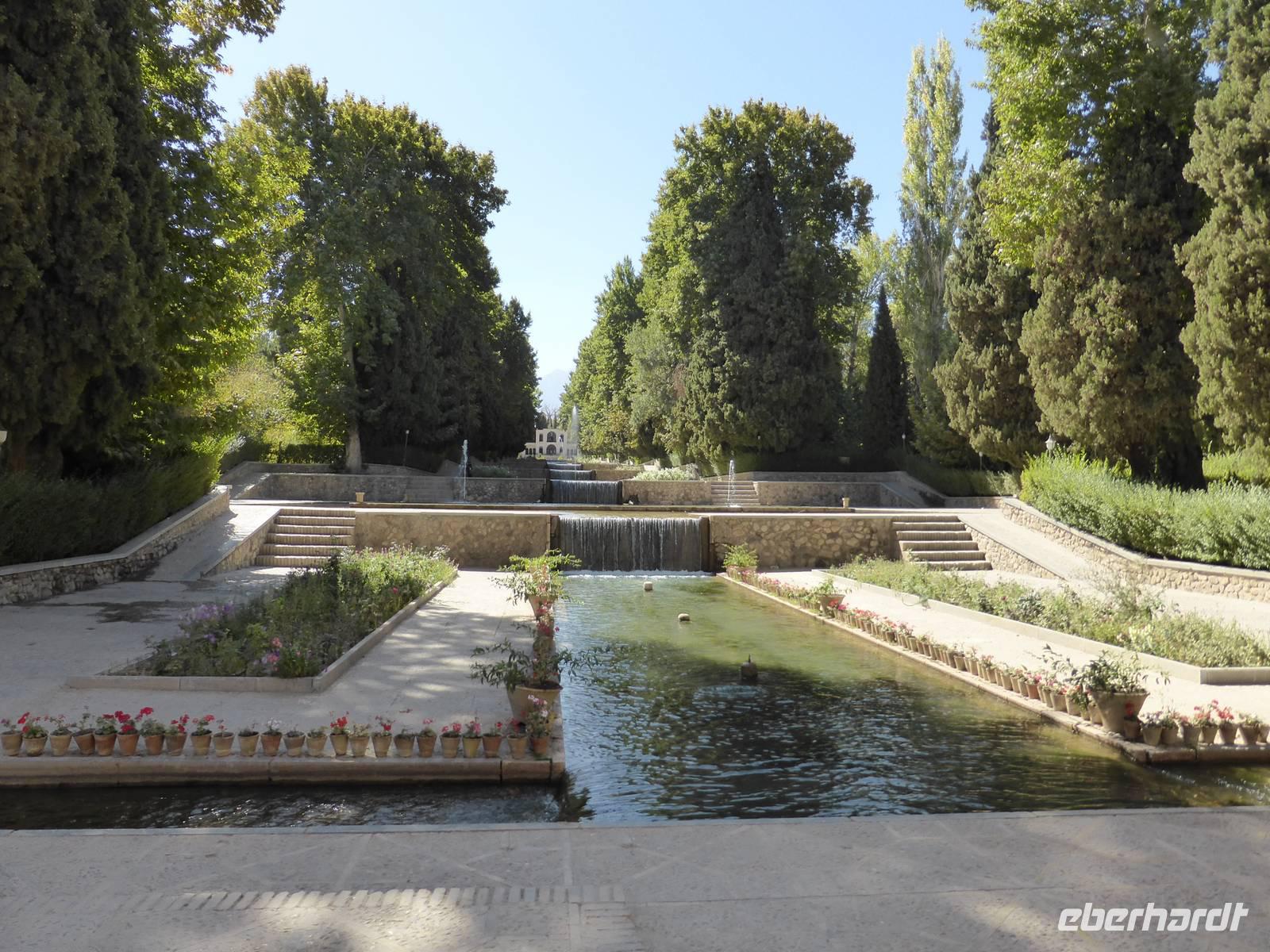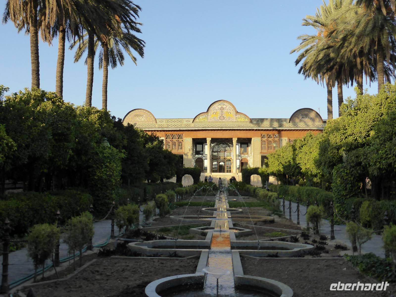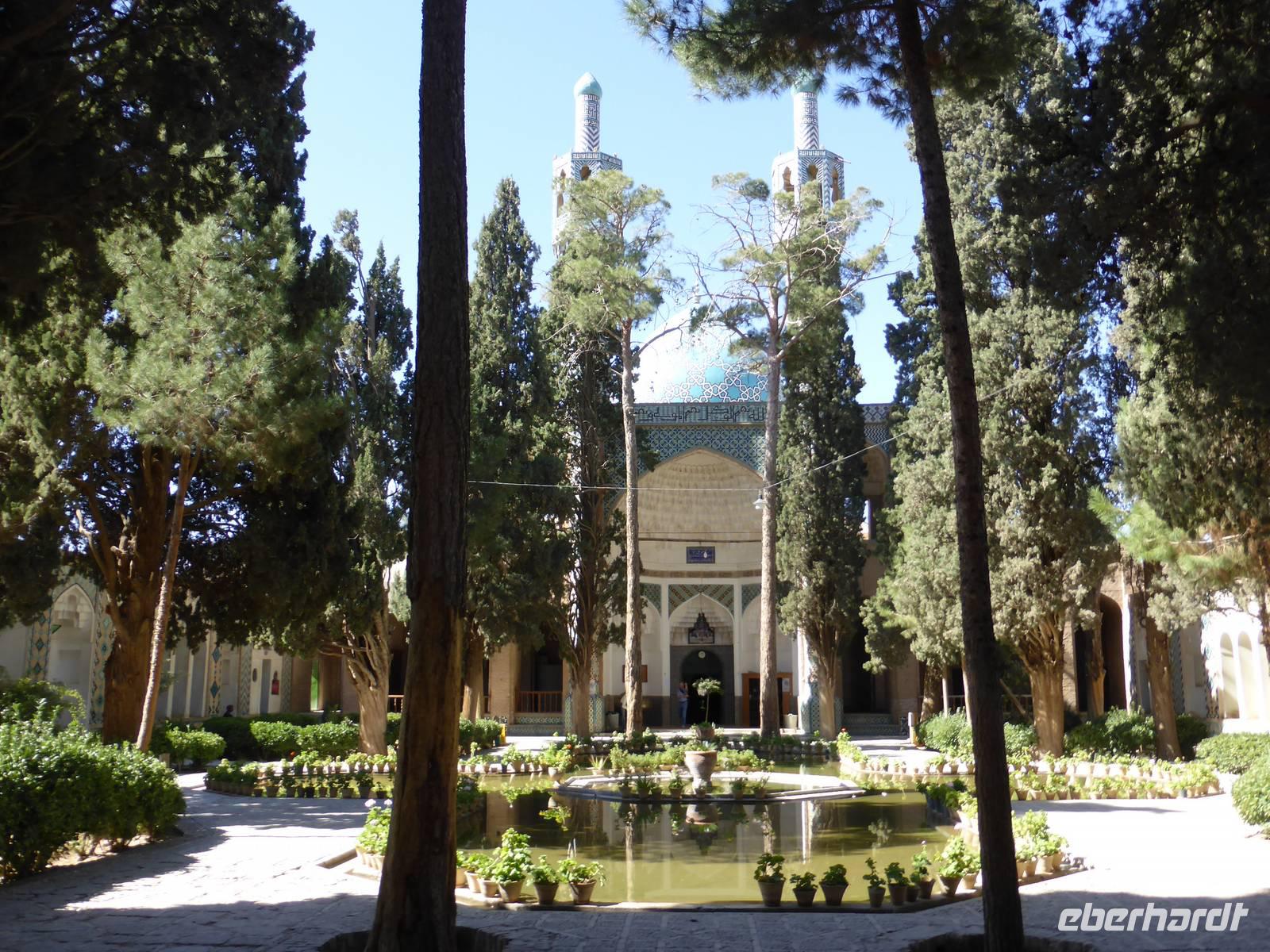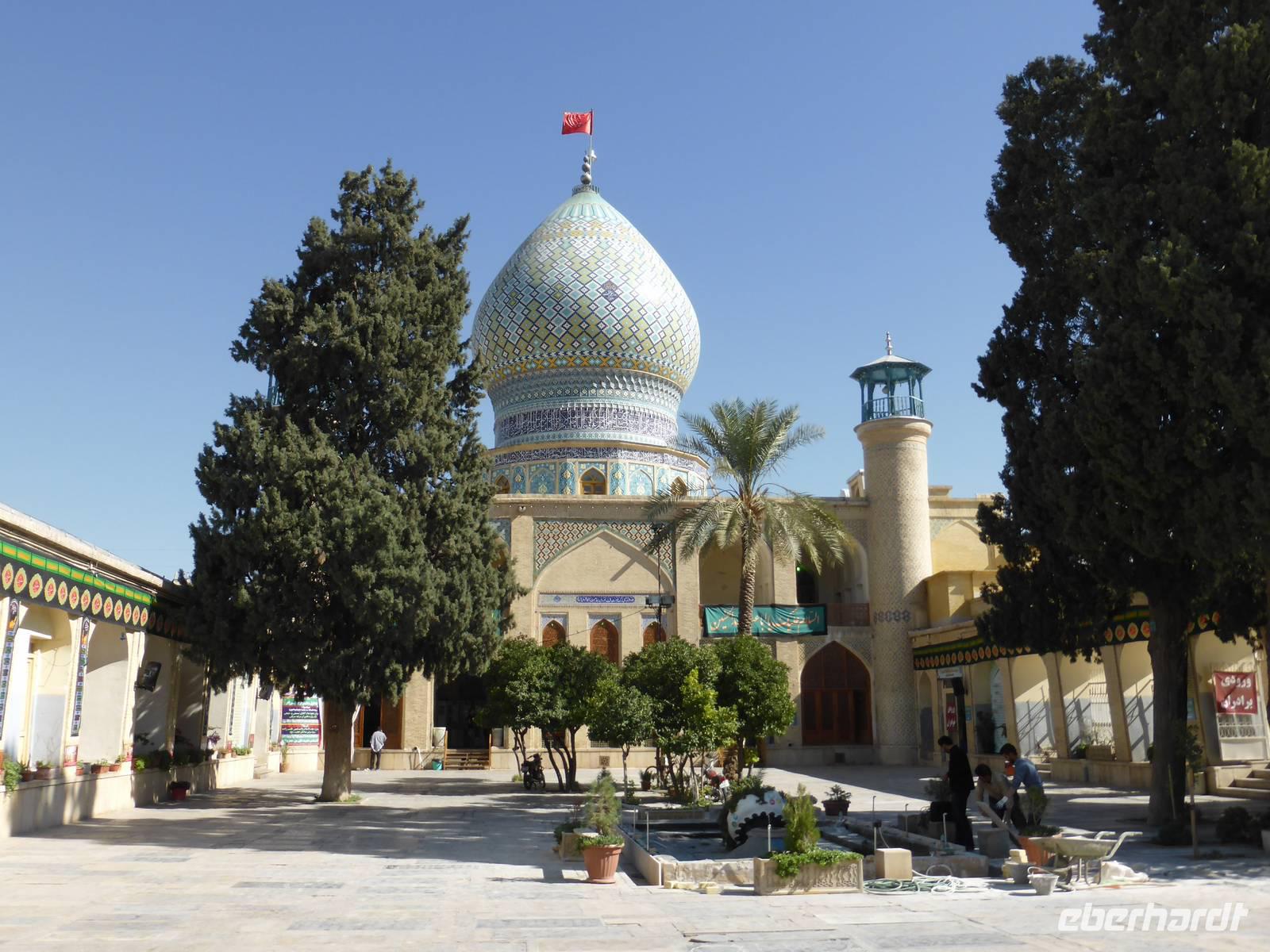 Shiraz ist zweifellos eine der schönsten Städte Persiens und sie wird aufgrund ihrer vielen Grünanlagen und Parks als die Stadt der Rosen und Nachtigallen bezeichnet. Als erstes fuhren zum Eram-Garten, welcher auch Paradies-Garten genannt wird. Die Anlage mit dem Palast Nasr-ol Molks zählt zu den eindrucksvollsten Sehenswürdigkeiten Persiens und entspricht genau dem Bild, welches man vom Orient und von paradiesischen Gärten hat. Die Baum- und Pflanzenarten sind gut beschriftet und die Anlage ist heute Teil der Shirazer Universität.Nach dem Besuch ging es zum Mausoleum (Imamzadeh) von Ali ebn-e Hamzeh (9.Jh.), dem Sohn des 7.Imams und Neffe Shah Cheraghs. Sein Schrein steht unter einer gewaltigen, mit Spiegelmosaiken verzierten Kuppel. Wir setzten uns auf den Teppich und Ali las uns einige interessante Auszüge aus dem Koran vor.