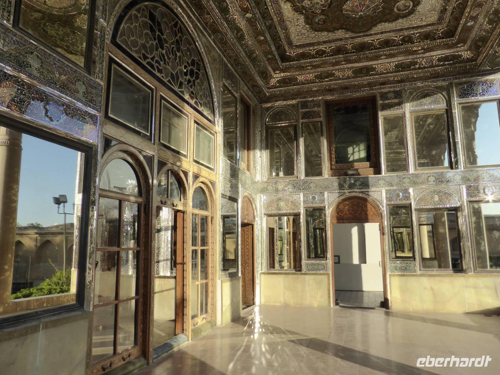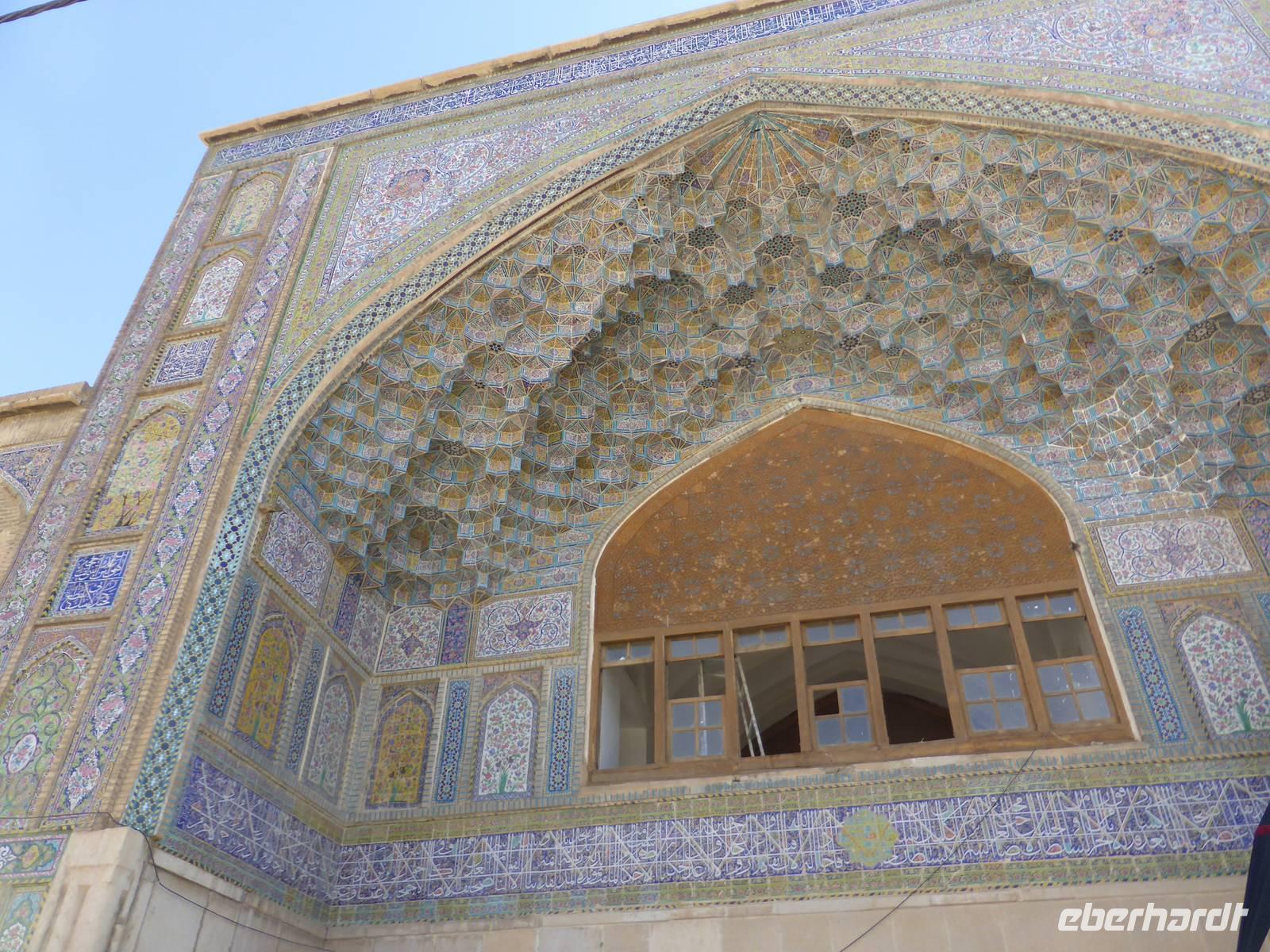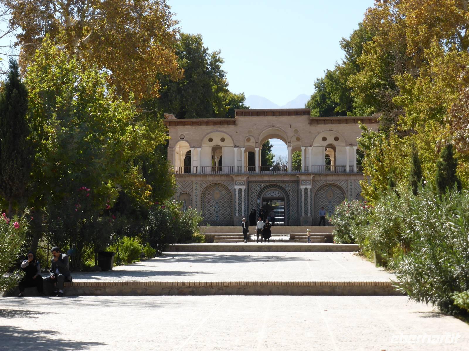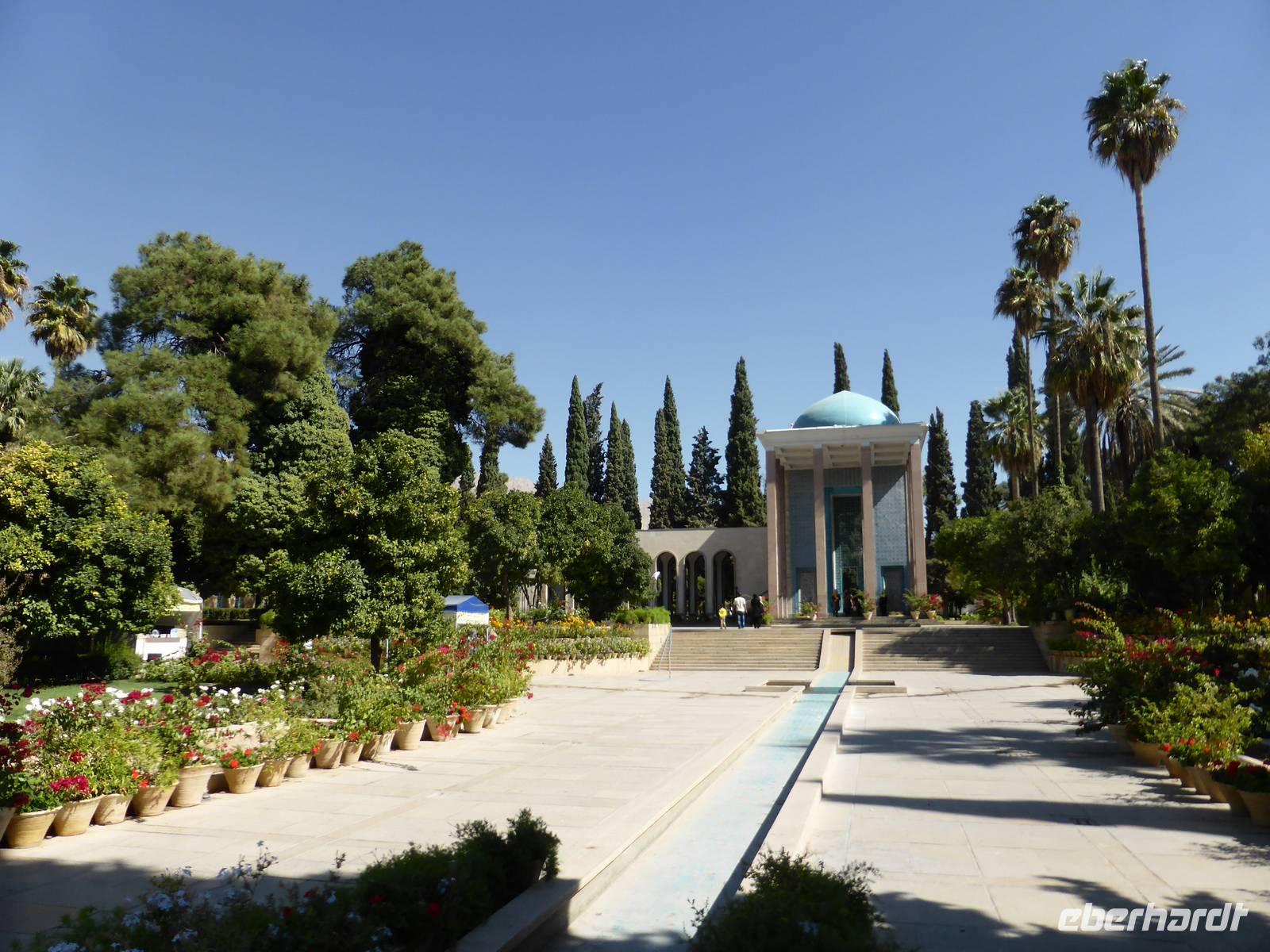 Shiraz ist zweifellos eine der schönsten Städte Persiens und sie wird aufgrund ihrer vielen Grünanlagen und Parks als die Stadt der Rosen und Nachtigallen bezeichnet. Als erstes fuhren zum Eram-Garten, welcher auch Paradies-Garten genannt wird. Die Anlage mit dem Palast Nasr-ol Molks zählt zu den eindrucksvollsten Sehenswürdigkeiten Persiens und entspricht genau dem Bild, welches man vom Orient und von paradiesischen Gärten hat. Die Baum- und Pflanzenarten sind gut beschriftet und die Anlage ist heute Teil der Shirazer Universität.Nach dem Besuch ging es zum Mausoleum (Imamzadeh) von Ali ebn-e Hamzeh (9.Jh.), dem Sohn des 7.Imams und Neffe Shah Cheraghs. Sein Schrein steht unter einer gewaltigen, mit Spiegelmosaiken verzierten Kuppel. Wir setzten uns auf den Teppich und Ali las uns einige interessante Auszüge aus dem Koran vor.