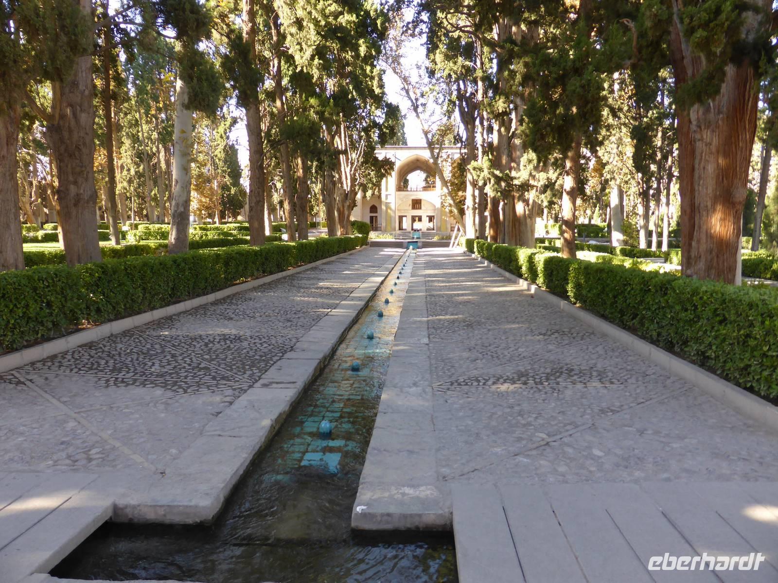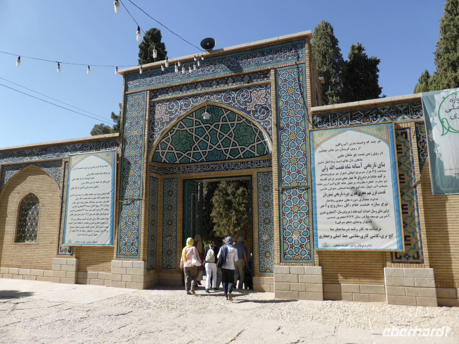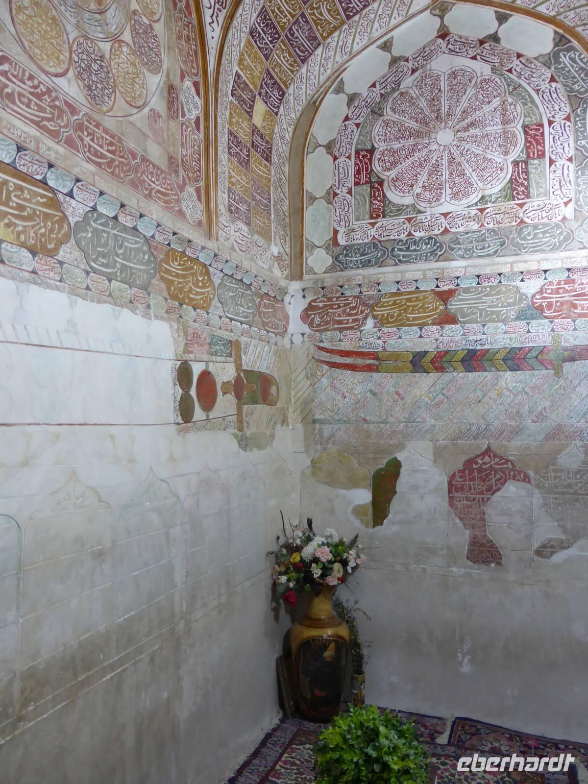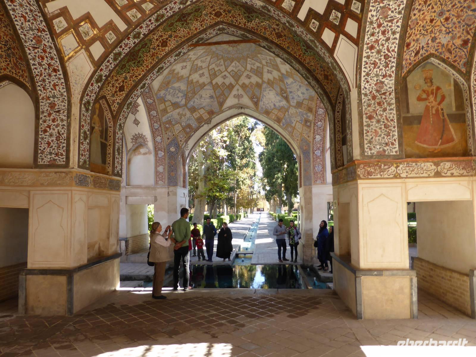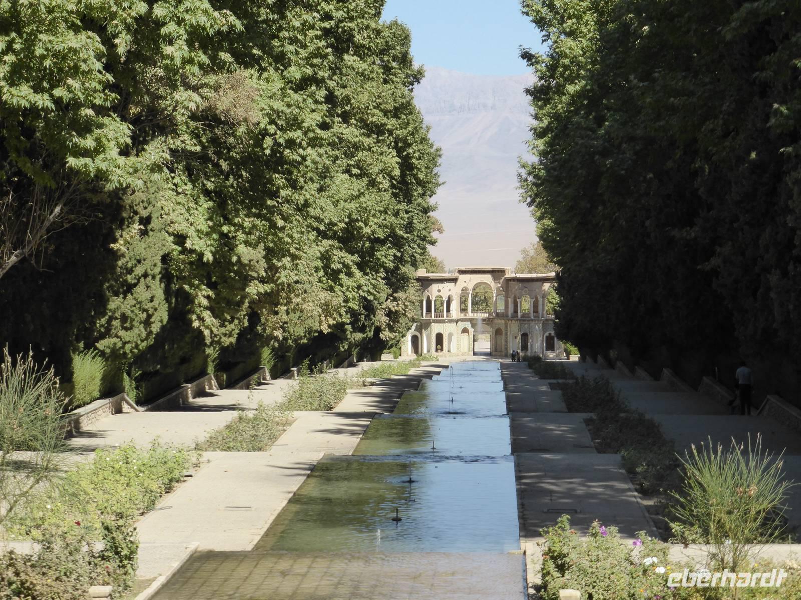 Shiraz ist zweifellos eine der schönsten Städte Persiens und sie wird aufgrund ihrer vielen Grünanlagen und Parks als die Stadt der Rosen und Nachtigallen bezeichnet. Als erstes fuhren zum Eram-Garten, welcher auch Paradies-Garten genannt wird. Die Anlage mit dem Palast Nasr-ol Molks zählt zu den eindrucksvollsten Sehenswürdigkeiten Persiens und entspricht genau dem Bild, welches man vom Orient und von paradiesischen Gärten hat. Die Baum- und Pflanzenarten sind gut beschriftet und die Anlage ist heute Teil der Shirazer Universität.Nach dem Besuch ging es zum Mausoleum (Imamzadeh) von Ali ebn-e Hamzeh (9.Jh.), dem Sohn des 7.Imams und Neffe Shah Cheraghs. Sein Schrein steht unter einer gewaltigen, mit Spiegelmosaiken verzierten Kuppel. Wir setzten uns auf den Teppich und Ali las uns einige interessante Auszüge aus dem Koran vor.