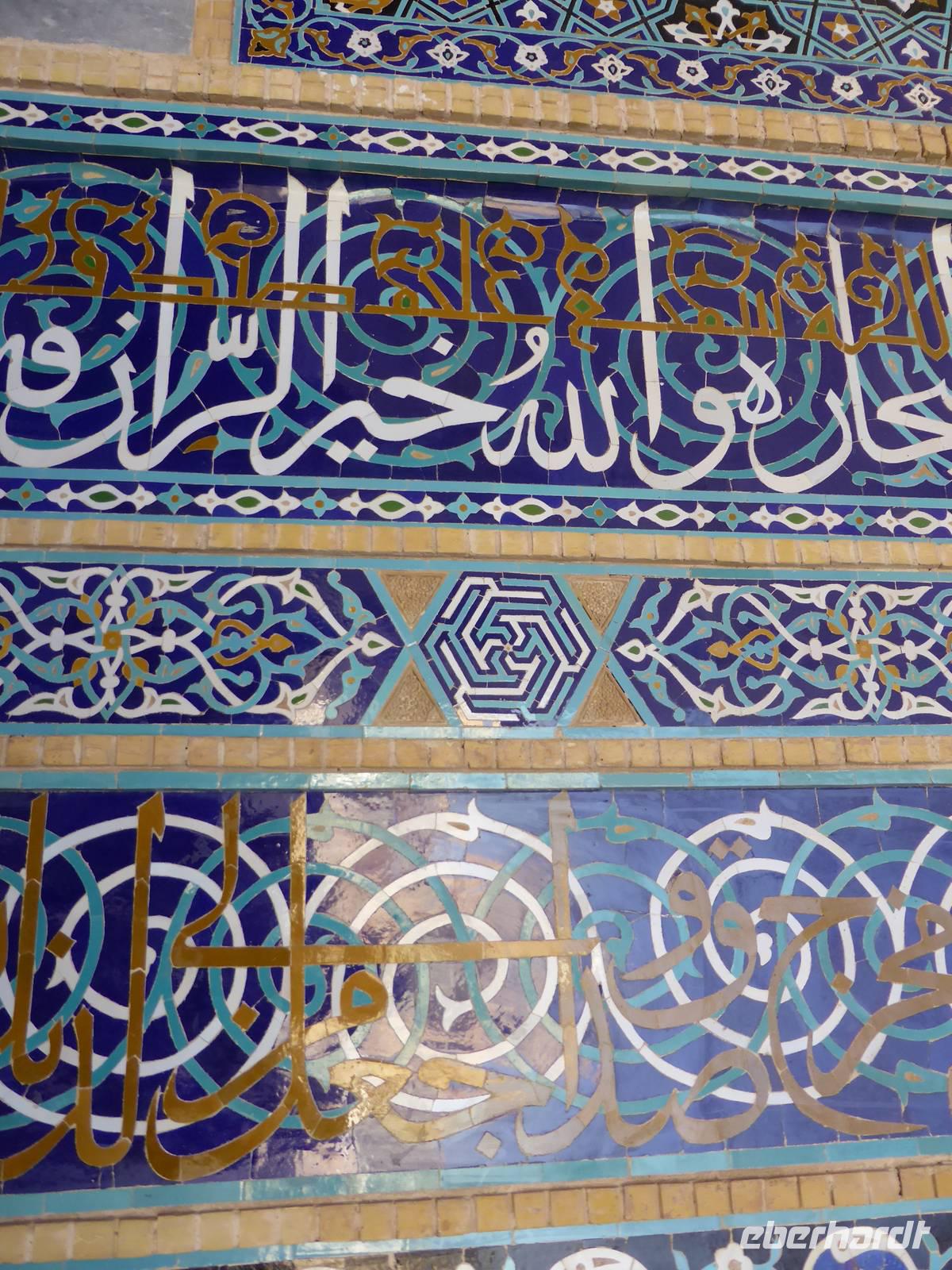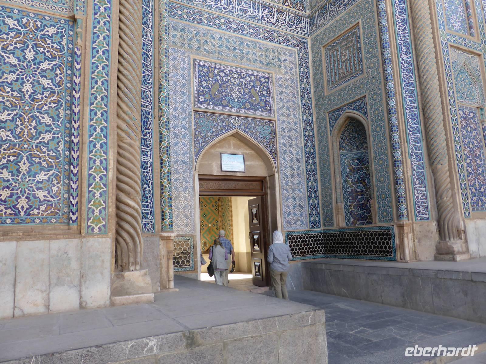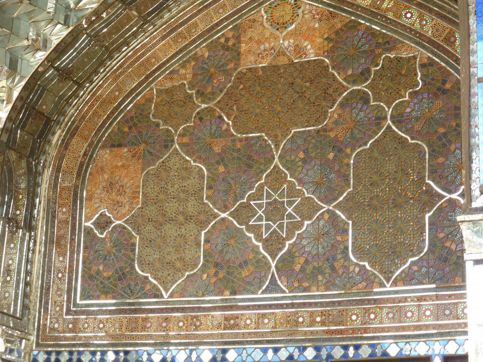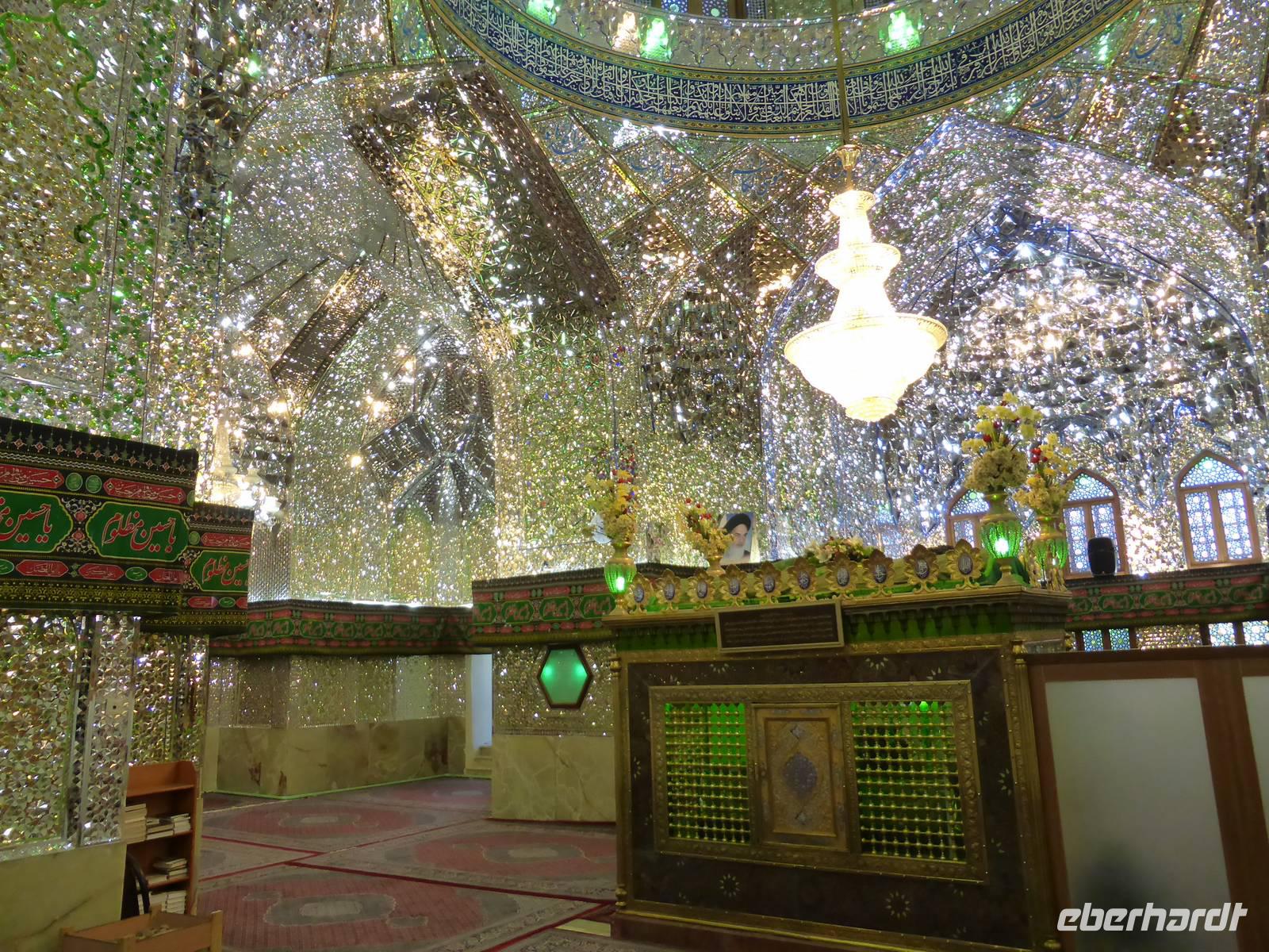Shiraz ist zweifellos eine der schönsten Städte Persiens und sie wird aufgrund ihrer vielen Grünanlagen und Parks als die Stadt der Rosen und Nachtigallen bezeichnet. Als erstes fuhren zum Eram-Garten, welcher auch Paradies-Garten genannt wird. Die Anlage mit dem Palast Nasr-ol Molks zählt zu den eindrucksvollsten Sehenswürdigkeiten Persiens und entspricht genau dem Bild, welches man vom Orient und von paradiesischen Gärten hat. Die Baum- und Pflanzenarten sind gut beschriftet und die Anlage ist heute Teil der Shirazer Universität.Nach dem Besuch ging es zum Mausoleum (Imamzadeh) von Ali ebn-e Hamzeh (9.Jh.), dem Sohn des 7.Imams und Neffe Shah Cheraghs. Sein Schrein steht unter einer gewaltigen, mit Spiegelmosaiken verzierten Kuppel. Wir setzten uns auf den Teppich und Ali las uns einige interessante Auszüge aus dem Koran vor.