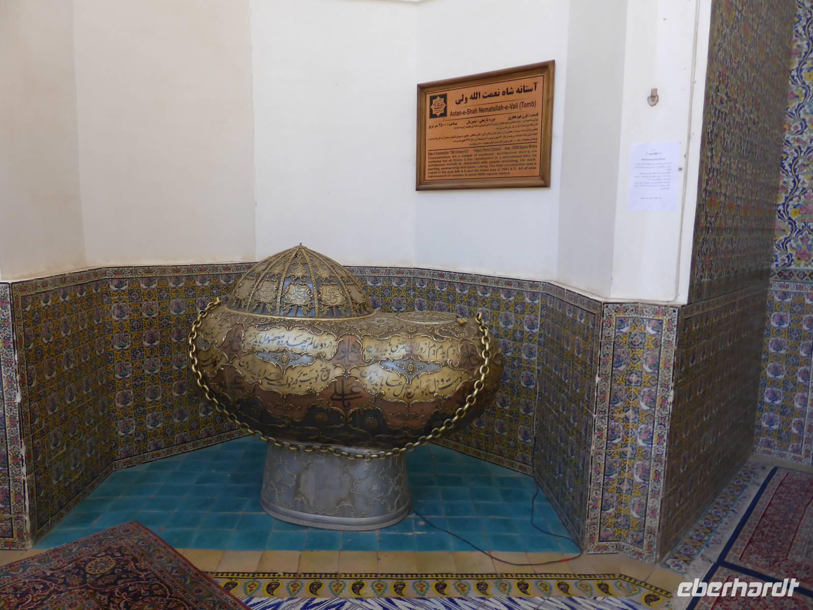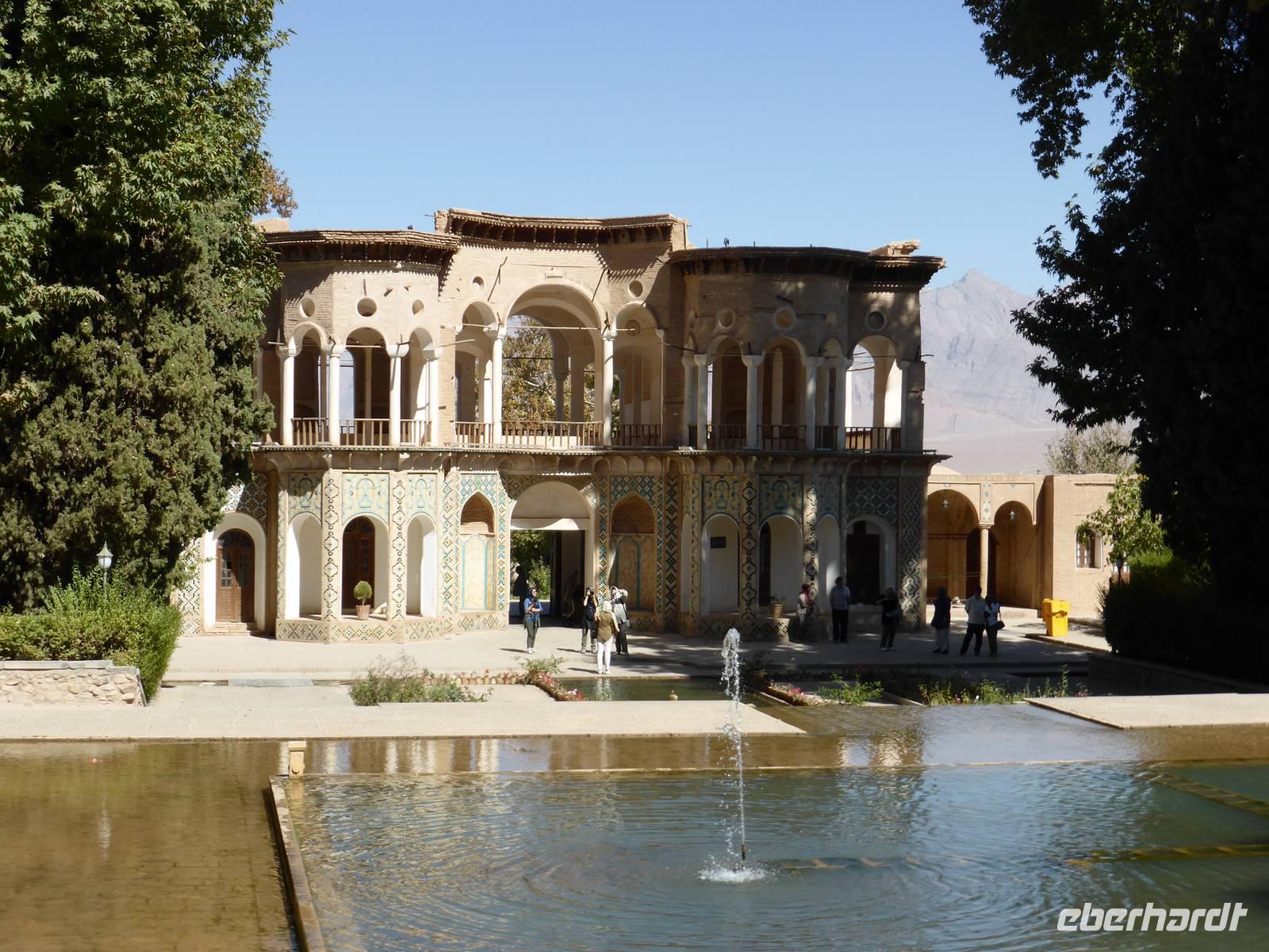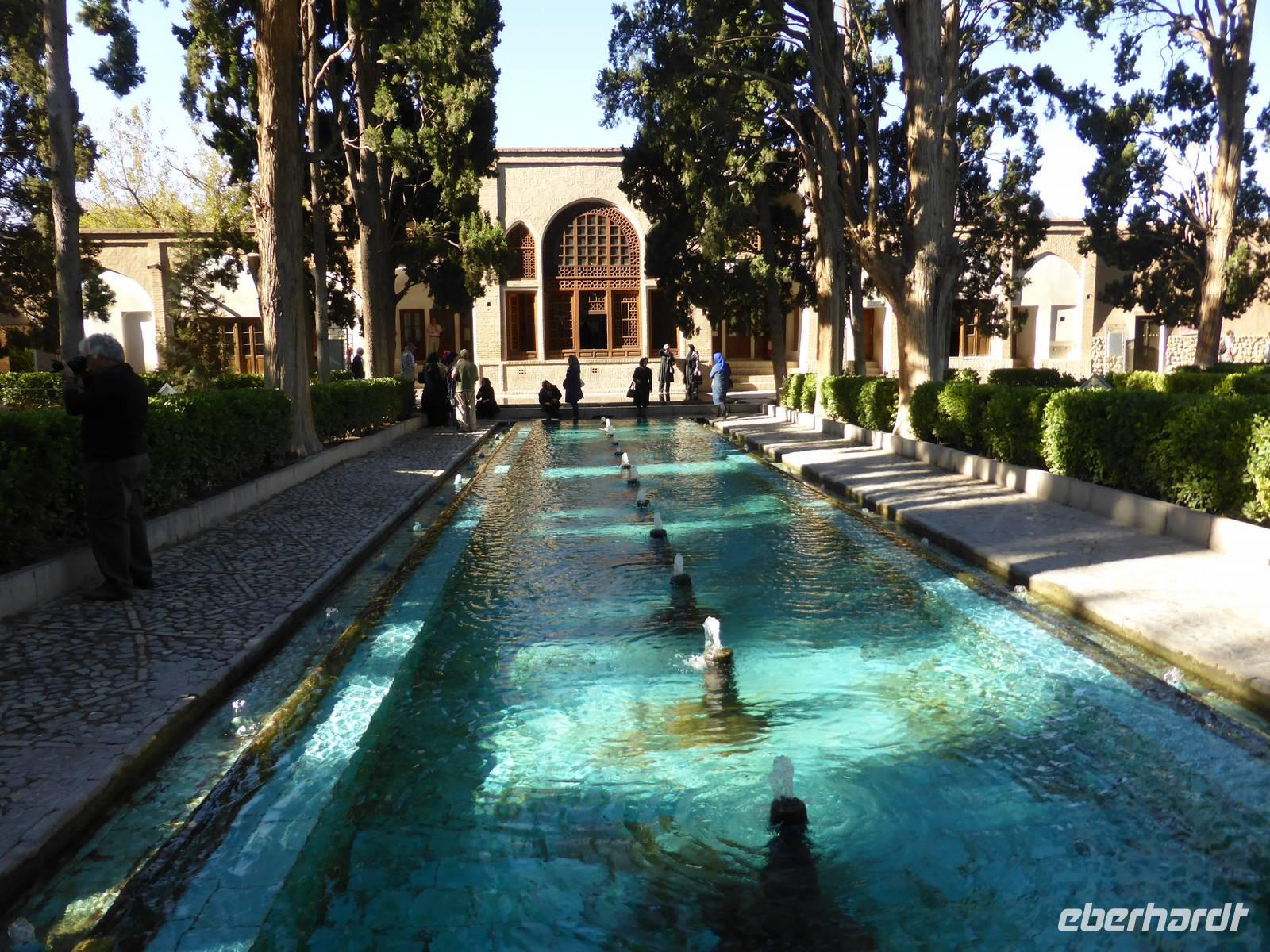 Die erste Besichtigung am heutigen Tag war die Grabanlage Astan-e Shah Nematollah-e-Vali in Mahan. Er war ein bedeutender Sufi-Meister, Gelehrter und Gründer des Nematollahi-Sufi-Ordens. Mit den beiden Innenhöfen, deren Wasserbecken und der einmaligen türkisfarbenen Mosaikkuppel zählt das Mausoleum zu den architektonisch schönsten Anlagen der Provinz Kerman. Im Inneren der Anlage befindet sich die Meditationszelle, in die sich der Sufi-Meister mehrmals im Jahr für 40 Tage zur Meditation und Askese zurückzog. Die Kuppel des Mausoleums und die beiden Minarette sind mit einem blau-grünen Mosaik-Fliesendekor bedeckt. Im Anschluss ging es zum Prinzengarden (Bagh-e Shahzadeh), einer Anlage aus dem 19.Jh., welche sich ein qajarischer Prinz anlegen ließ. Sie steigt stufenartig in Form von mehreren aufeinander folgenden Wasserbecken in Richtung Hauptbau an, hinter dem bei klarem Wetter das Panorama der Berge hervortritt. In der Anlage des Prinzengartens hielt sich die Königsfamilie der Qajaren auf, wenn sie Kerman besuchte oder auf der Durchreise zum Persischen Golf war.