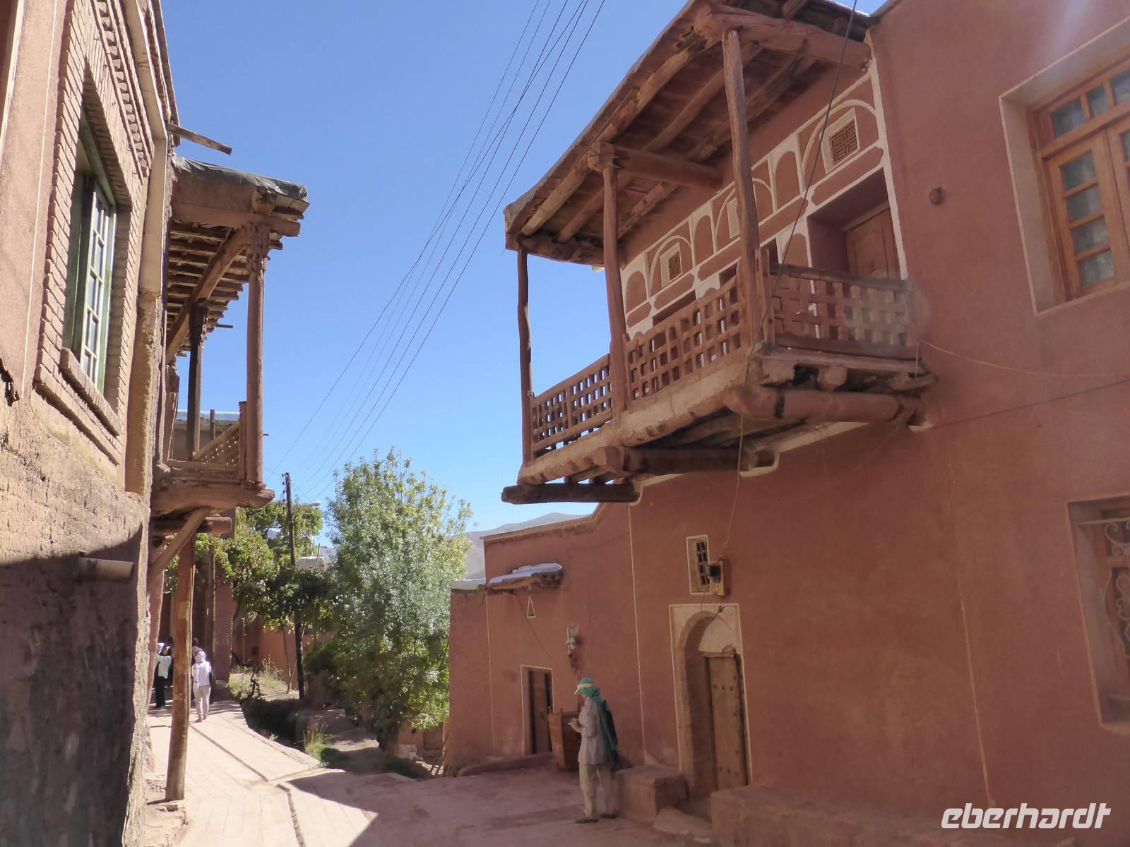 Nach dem Frühstück ging es natürlich als erstes zum Fin-Garten. Er ist vermutlich der älteste persische Garten und seine Existenz geht bis auf die achämenidische Zeit zurück. Im 17.Jh. ließ Shah Abbas I. die Anlage erneuern und erweitern. In diesem paradiesischen Garten hat sich auch eine Tragödie abgespielt. Auf Veranlassung des Shahs Nasseruddin wurde hier im Jahre 1852 der Premierminister Amir Kabir ermordet, da er sich als beliebter Politiker gegen den Ausverkauf Persiens eingesetzt hatte. Von Kashan aus fuhren wir danach ins Kargos-Gebirge, zum kleinen Bergdorf Abyaneh, dessen rot-braune Lehmziegelhäuser dicht aneinander gedrängt am Berghang stehen. Die Einwohner sprechen einen Dialekt, welcher dem der sassanidischen Zeit ähnelt. Die Frauen tragen weiße, mit bunten Blumenmustern verzierte Kopftücher und die Männer Pluderhosen.