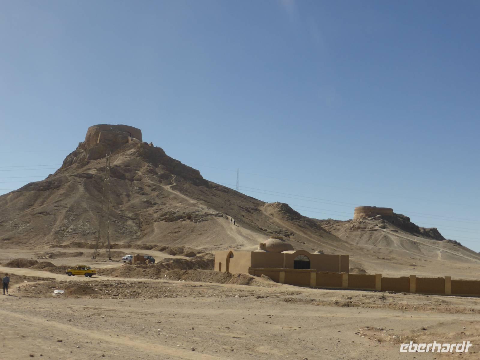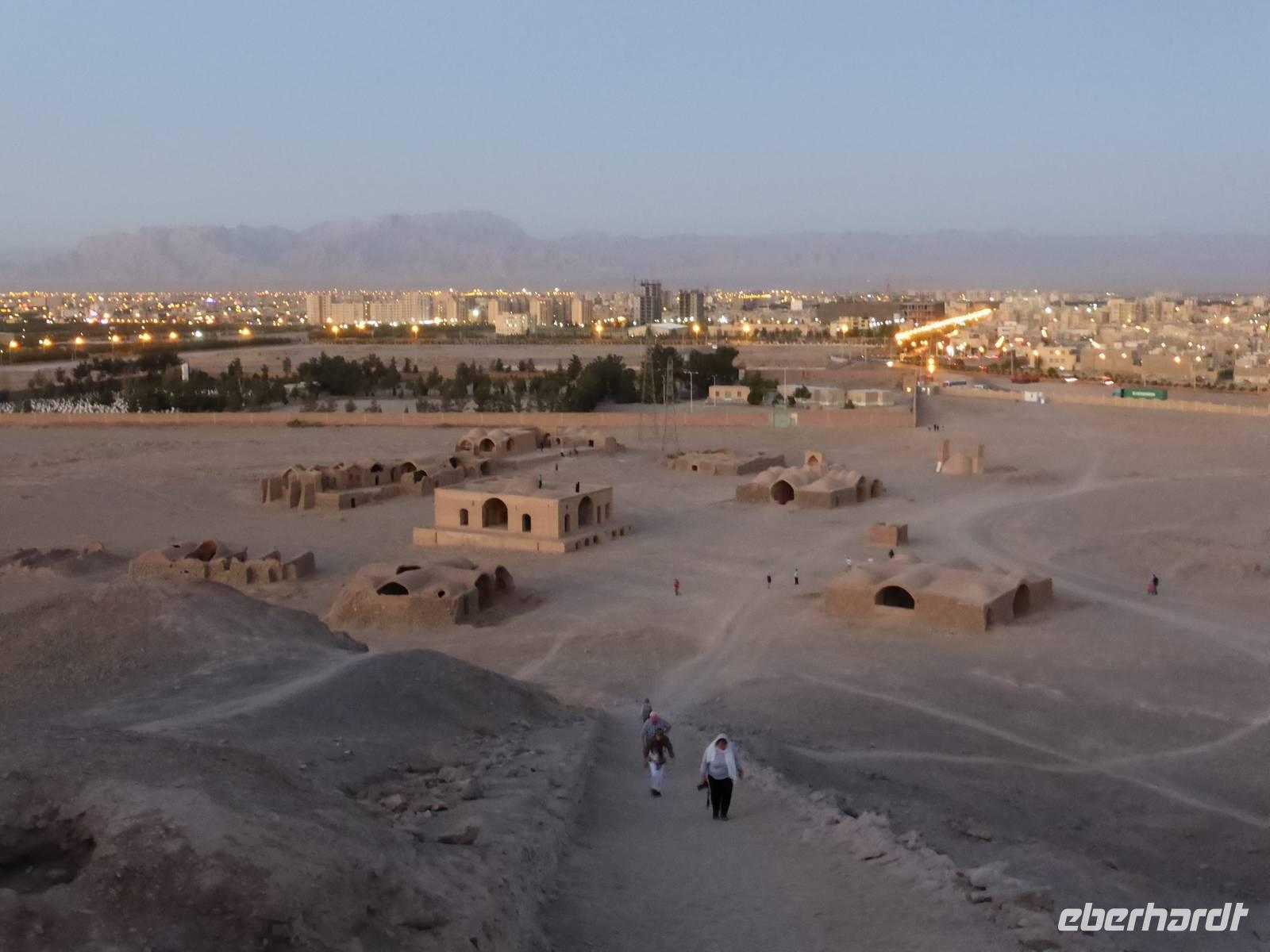 Anschließend fuhren wir zur Schnellstraße zurück und auf dieser weiter Richtung Süden. In der Wüstenstadt Yazd setzte die Dämmerung bereits gegen 17.00 Uhr ein. Für die Besichtigung der „Türme des Schweigens" war es gerade noch hell genug. Gemeint sind zwei auf Bergkuppen errichtete, ummauerte Heiligtümer am Stadtrand von Yazd. Da die Erde, das Feuer und das Wasser den Anhängern Zarathustras heilig sind, durften auch ihre Verstorbenen nicht damit in Berührung kommen. Man brachte sie nach der rituellen Waschung auf die Plattformen der Türme und überließ sie dort den Geiern. Nach vierzig Tagen wurden die Knochen eingesammelt, gereinigt und in Öl gesalbten Krügen aufbewahrt. Trotz der einsetzenden Dämmerung stiegen wir auf einen der Türme hinauf, um uns die Plattform anzusehen. Vielleicht war dies auch die beste Lösung, jedenfalls besser als in der Mittagsonne bei 25 Grad hinauf zu steigen.