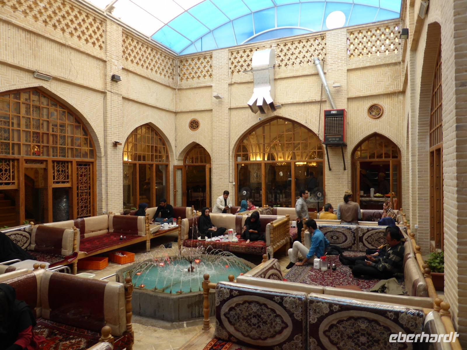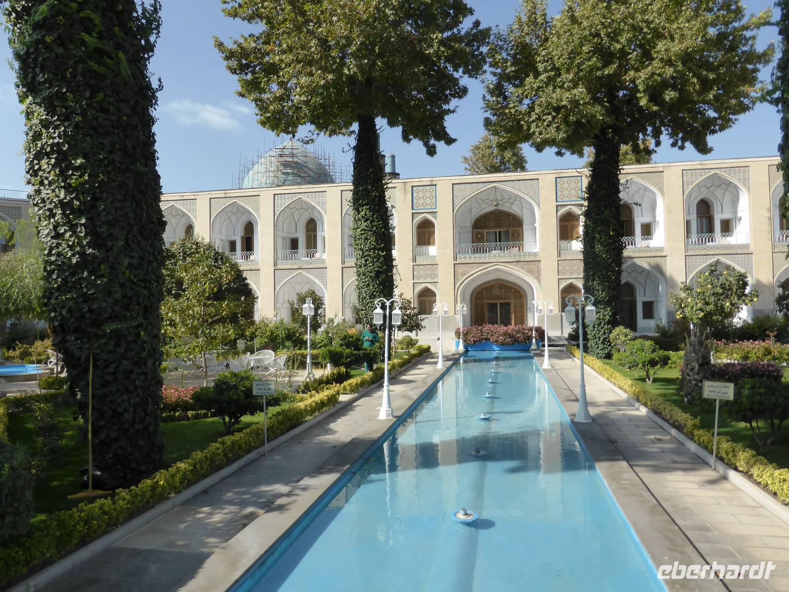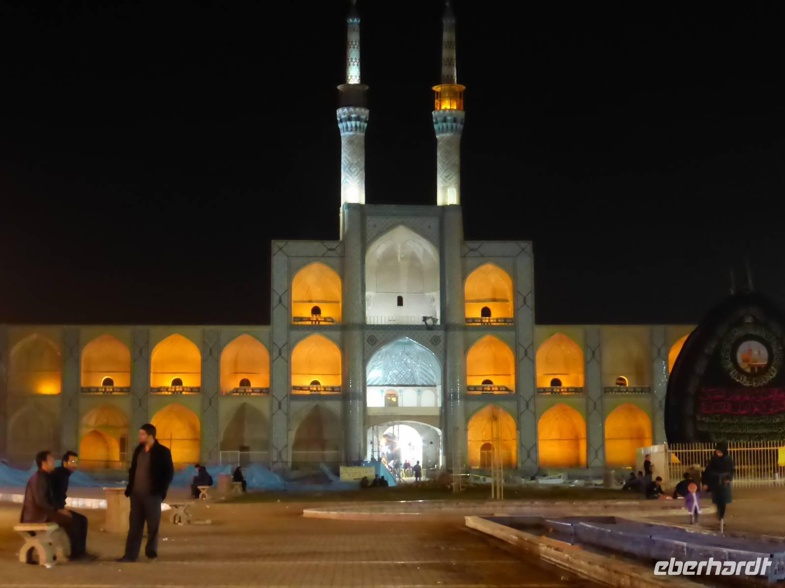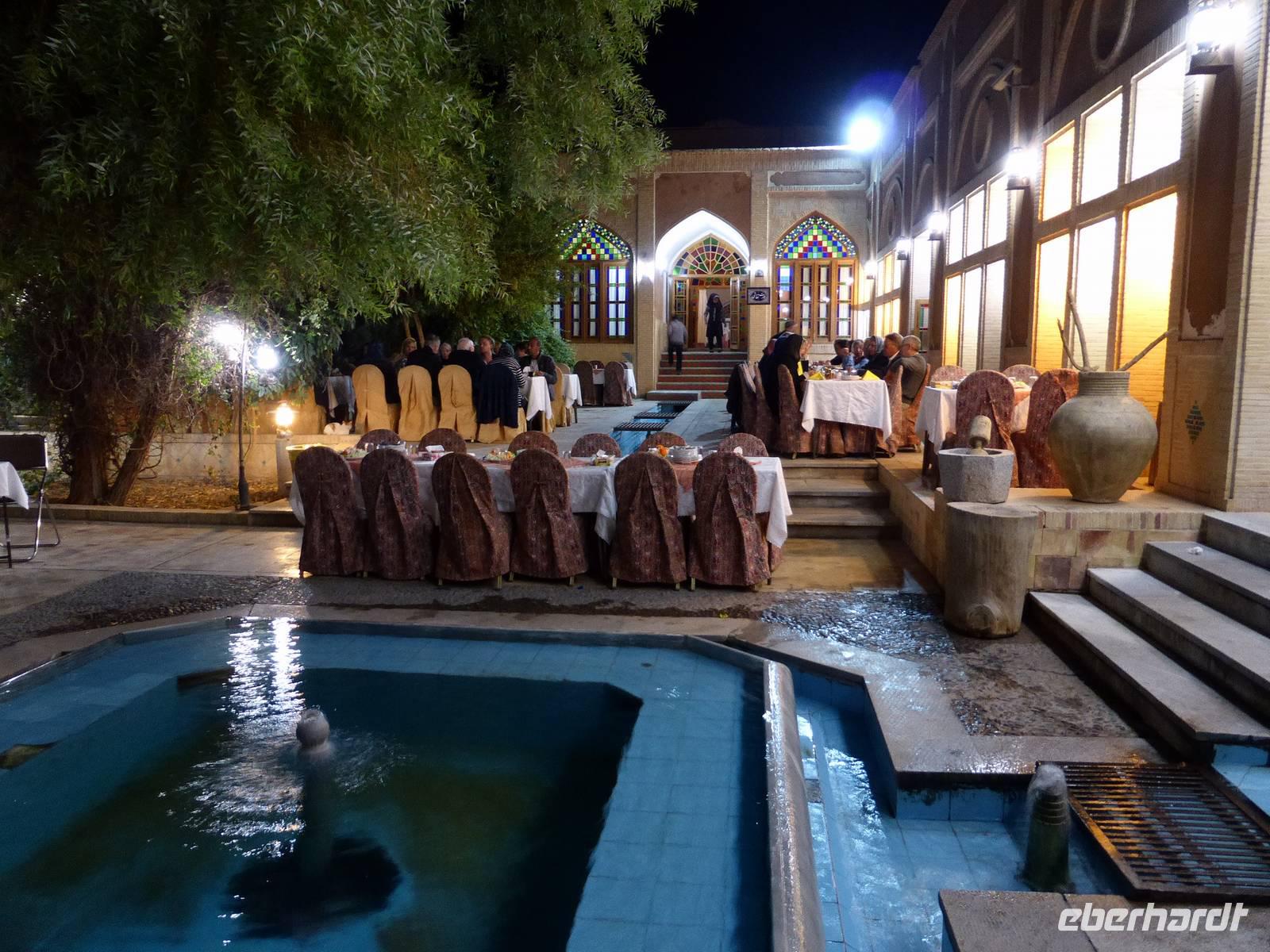 Anschließend fuhren wir zu unserer Hotelanlage „Moshir-al-Mamalek"-Garden, welche zu den schönsten Übernachtungsmöglichkeiten in Yazd und vielleicht auch im ganzen Land zählt. Die Zimmer gruppieren sich um eine parkähnliche Gartenanlage, in welcher flache Wasserbecken den Charakter einer Oase in dieser Wüstenstadt unterstreichen. Nach dem Abendessen im Hotel fuhren einige von uns noch mit dem Taxi ins Zentrum der Altstadt. Dort stehen das sehenswerte historische Hotel „Fahadan", das Mausoleum der 12 Imame und das Gefängnis Alexanders des Großen, welches heute eine Theologieschule (Madrese) ist. Alexander der Große war selbst nie Insasse des Gefängnisses, soll hier aber aufständige achämenidische Adelige festgesetzt haben.