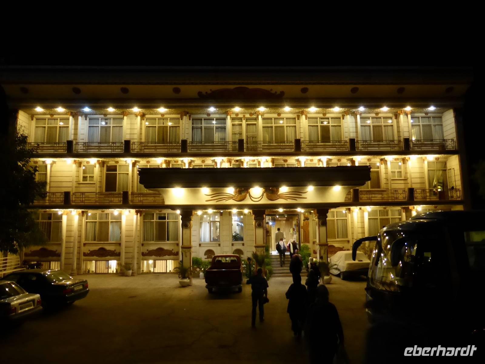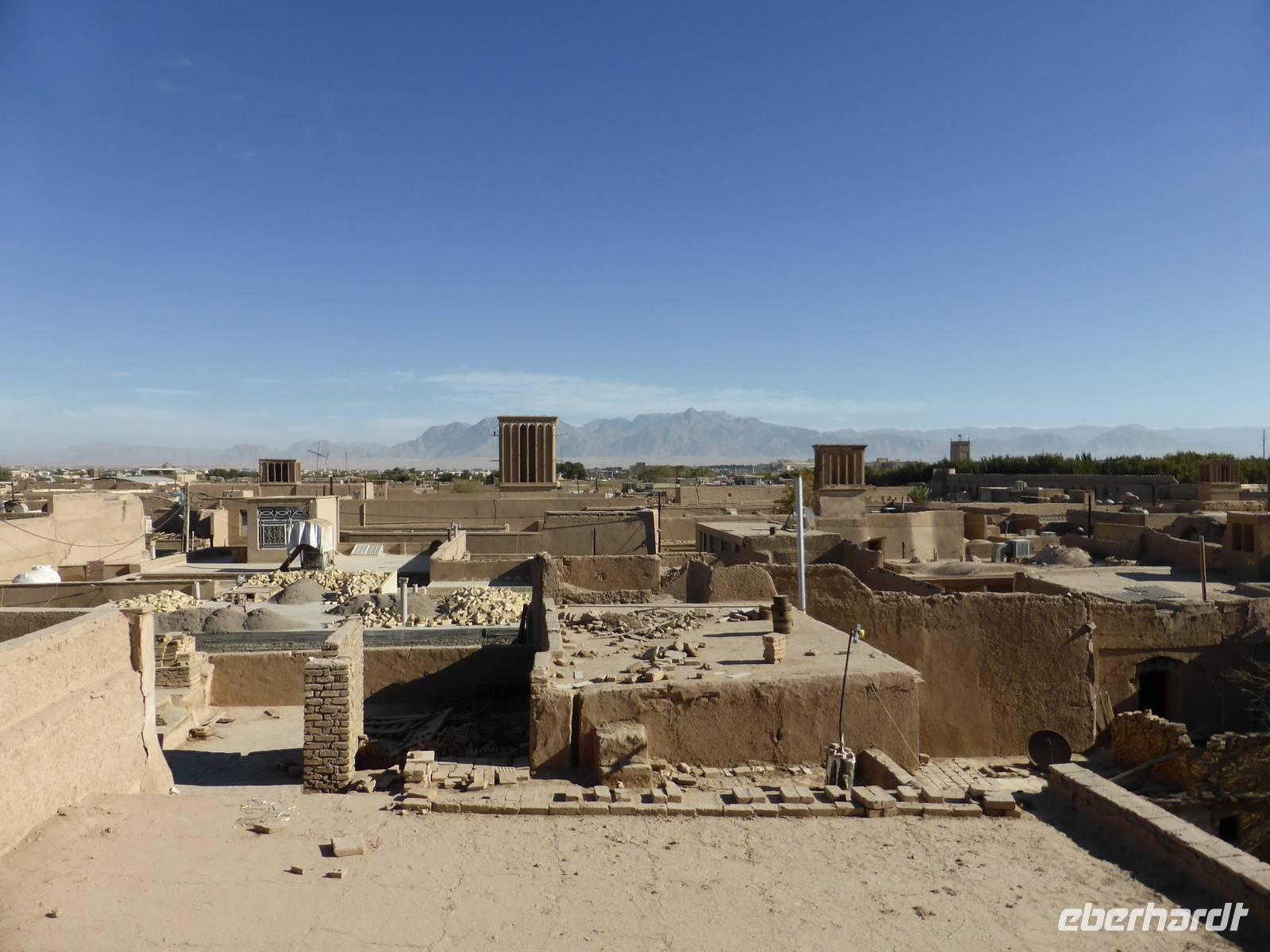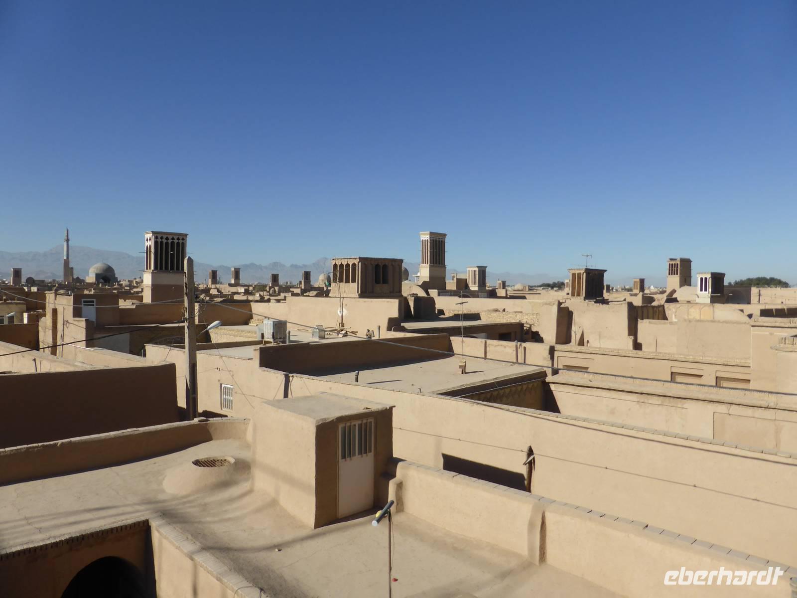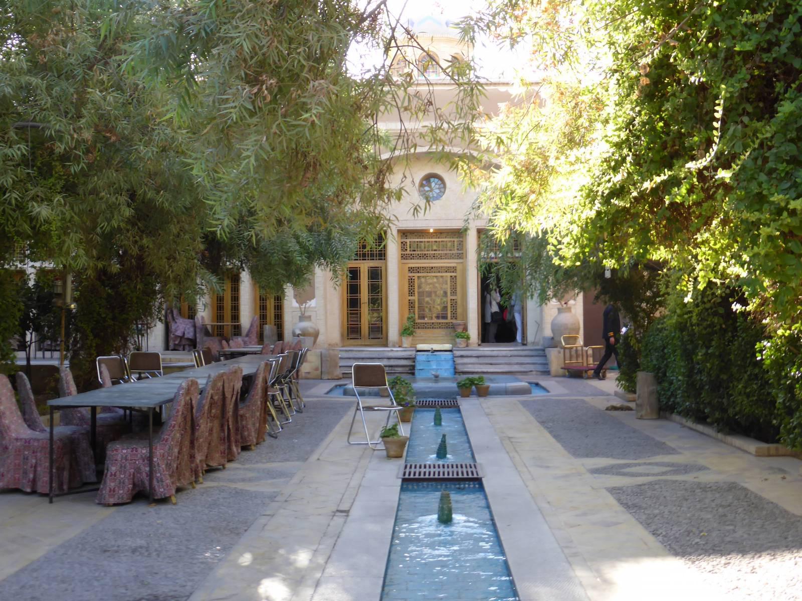 Anschließend fuhren wir zu unserer Hotelanlage „Moshir-al-Mamalek"-Garden, welche zu den schönsten Übernachtungsmöglichkeiten in Yazd und vielleicht auch im ganzen Land zählt. Die Zimmer gruppieren sich um eine parkähnliche Gartenanlage, in welcher flache Wasserbecken den Charakter einer Oase in dieser Wüstenstadt unterstreichen. Nach dem Abendessen im Hotel fuhren einige von uns noch mit dem Taxi ins Zentrum der Altstadt. Dort stehen das sehenswerte historische Hotel „Fahadan", das Mausoleum der 12 Imame und das Gefängnis Alexanders des Großen, welches heute eine Theologieschule (Madrese) ist. Alexander der Große war selbst nie Insasse des Gefängnisses, soll hier aber aufständige achämenidische Adelige festgesetzt haben.