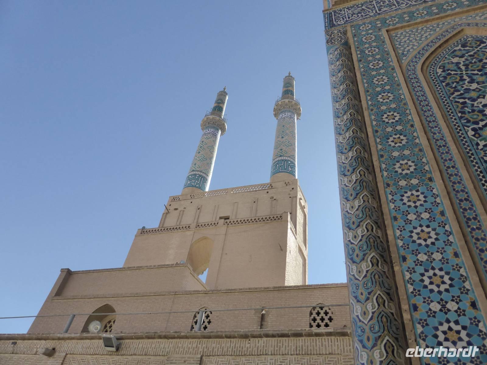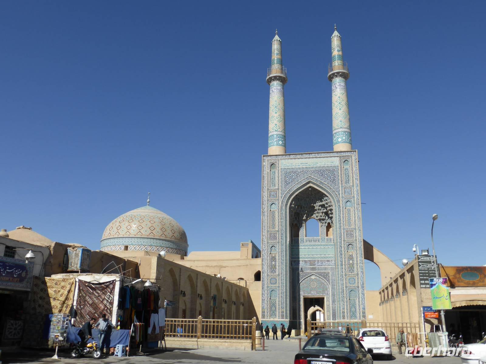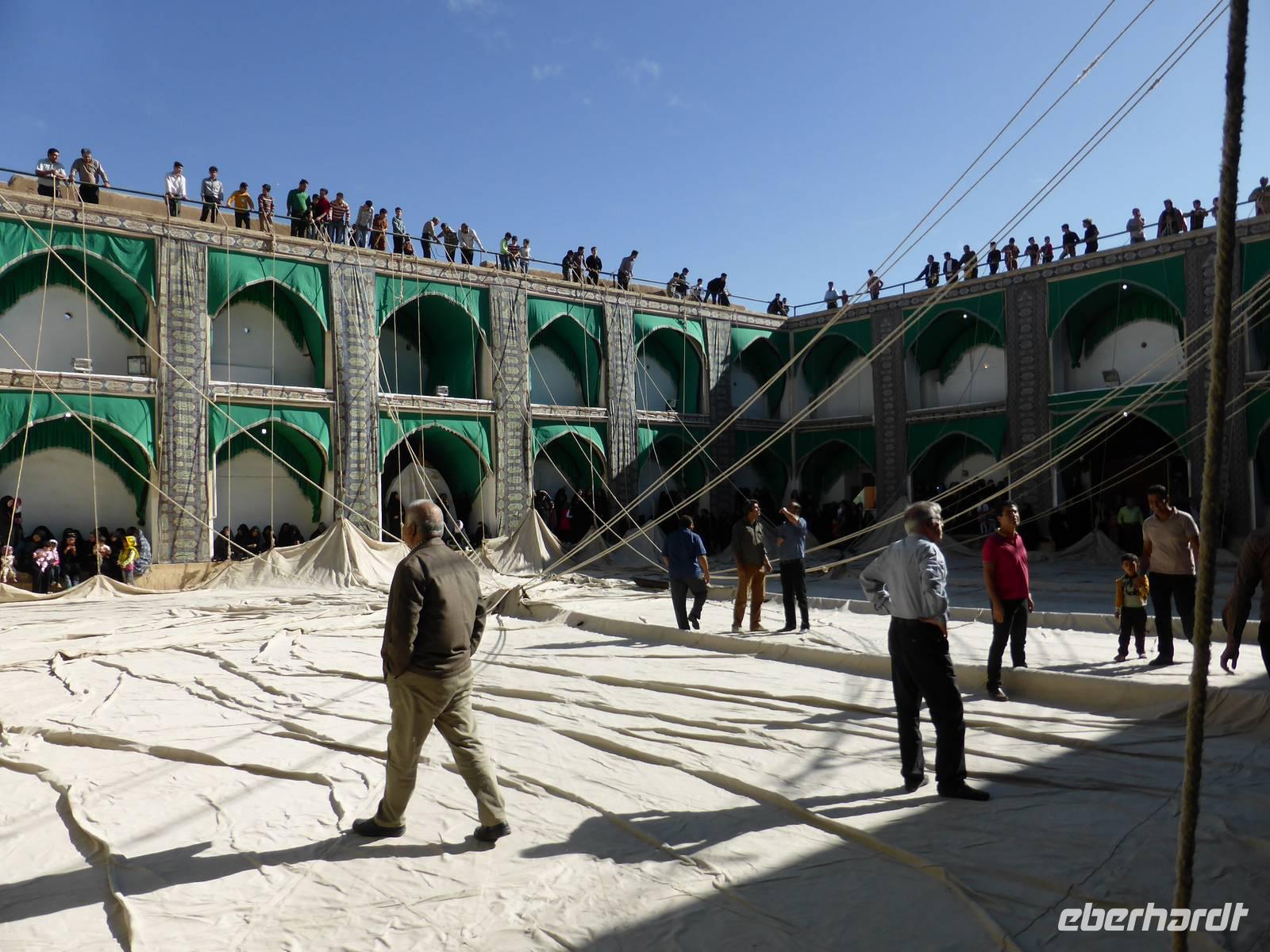 Der Morgen begann mit einem Spaziergang durch die Altstadt von Yazd. Vom Dach des Hotels „Kohan" bot sich uns ein fantastischer Blick über die Wüstenstadt mit ihren unzähligen Windtürmen und Kuppelbauten. Im Mausoleum der 12 Imame wurden wir Zeuge eines ganz besonderen Ereignisses. Die Gläubigen hatten sich versammelt, um das Zeltdach an Seilen hoch zu ziehen und damit den gesamten Innenhof des Mausoleums zu überspannen. Eine organisatorische Meisterleistung und ein bewegender Moment, bei dem so mancher Zuschauer zu Tränen gerührt war. Anschließend gingen wir in die Jame-Moschee, ein architektonisches Meisterwerk aus dem 14.Jh.. Besonders eindrucksvoll ist der Eingangs- Iwan, ein Portalbau mit Tonnengewölbe und einer offenen Seite,welcher mit einem blau-türkisen Fliesendekor geschmückt ist. Gekrönt wird er von zwei ebenso dekorierten Minaretten. Von der Altstadt fuhren wir anschließend zum Hauptplatz von Yazd, dem Amir Chaqmaq-Platz (Meydan Amir Chaqmaq). Am Rand des Platzes steht ein Nakhl, ein riesiges Holzgerüst, welches vor dem Ashura-Trauerfest mit schwarzen Tüchern behängt wird und das während der Prozessionen die Männer auf ihren Schultern tragen. Am Chaqmaq-Platz besuchten wir auch das Wassermuseum, in welchem interessant und verständlich die Sicherstellung der Wasserversorgung einer Wüstenstadt veranschaulicht wird. Von dort aus fuhren wir zum