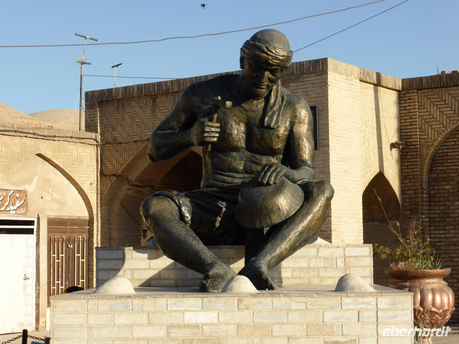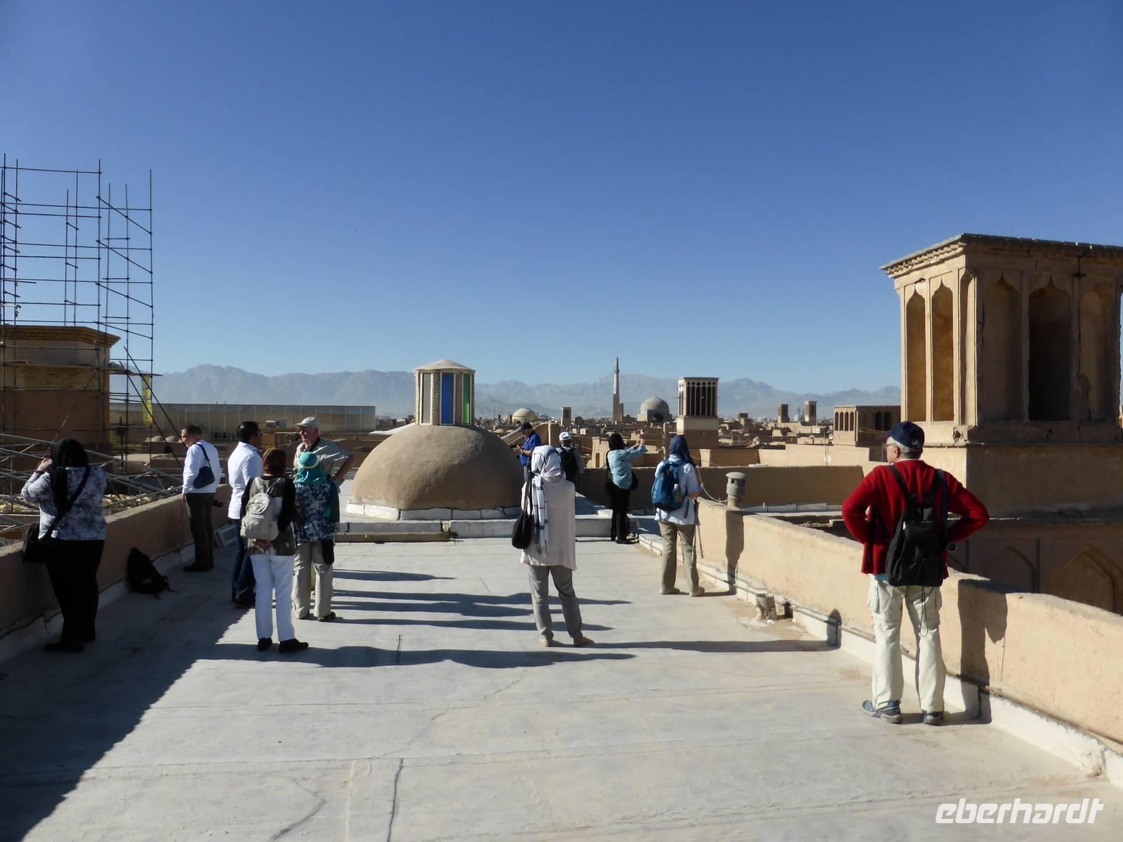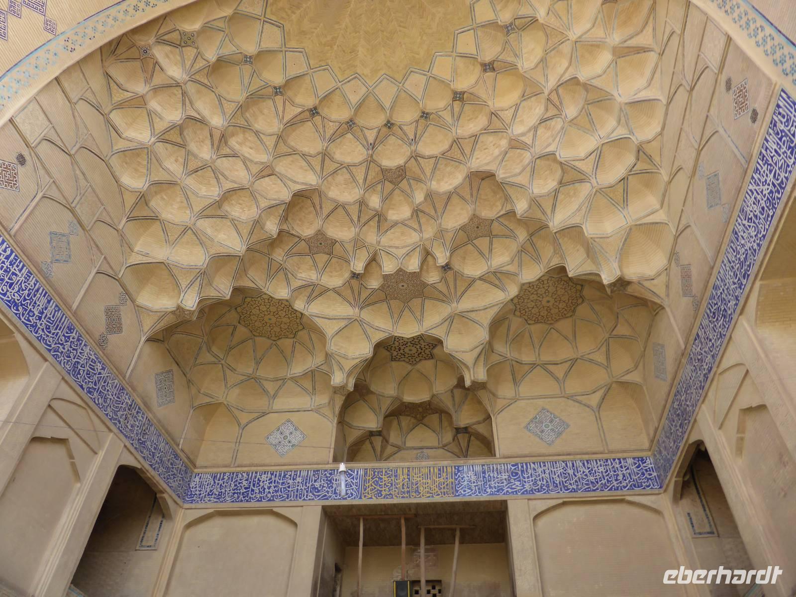 Der Morgen begann mit einem Spaziergang durch die Altstadt von Yazd. Vom Dach des Hotels „Kohan" bot sich uns ein fantastischer Blick über die Wüstenstadt mit ihren unzähligen Windtürmen und Kuppelbauten. Im Mausoleum der 12 Imame wurden wir Zeuge eines ganz besonderen Ereignisses. Die Gläubigen hatten sich versammelt, um das Zeltdach an Seilen hoch zu ziehen und damit den gesamten Innenhof des Mausoleums zu überspannen. Eine organisatorische Meisterleistung und ein bewegender Moment, bei dem so mancher Zuschauer zu Tränen gerührt war. Anschließend gingen wir in die Jame-Moschee, ein architektonisches Meisterwerk aus dem 14.Jh.. Besonders eindrucksvoll ist der Eingangs- Iwan, ein Portalbau mit Tonnengewölbe und einer offenen Seite,welcher mit einem blau-türkisen Fliesendekor geschmückt ist. Gekrönt wird er von zwei ebenso dekorierten Minaretten. Von der Altstadt fuhren wir anschließend zum Hauptplatz von Yazd, dem Amir Chaqmaq-Platz (Meydan Amir Chaqmaq). Am Rand des Platzes steht ein Nakhl, ein riesiges Holzgerüst, welches vor dem Ashura-Trauerfest mit schwarzen Tüchern behängt wird und das während der Prozessionen die Männer auf ihren Schultern tragen. Am Chaqmaq-Platz besuchten wir auch das Wassermuseum, in welchem interessant und verständlich die Sicherstellung der Wasserversorgung einer Wüstenstadt veranschaulicht wird. Von dort aus fuhren wir zum