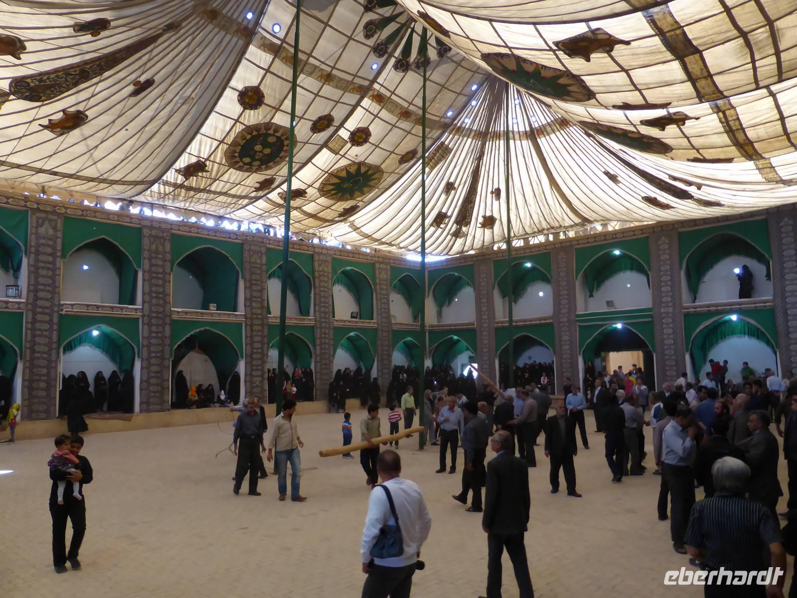 Den Abschluss unseres Besichtigungsprogramms an diesem Tag bildete der Besuch einer Zurkhane- Veranstaltung. Die Zurkhane ist ein Haus für traditionellen Kampfsport und diente bereits in vorislamischer Zeit zur Körperertüchtigung der Krieger. Der Sänger und Trommler setzte sich auf ein hohes Podest und die Sportler stiegen hinab in das achteckige Turnfeld, welches einen Meter unter dem normalen Bodenniveau liegt. Dann berührten sie mit der Hand den Boden, küssten die Hand anschließend und im gleichmäßigem Rhythmus begann der Sänger zu trommeln und zu singen. Die Sportler erwärmten sich mit großen hölzernen Keulen und absolvieren anschießend mehrere Minuten lang Übungen im Liegestütz. Besondere Geschicklichkeit erforderte das schnelle Drehen um die eigene Achse, eine Übung, die man schon von den tanzenden Derwischen kennt. Die Zuschauerplätze waren bis zum letzten Platz gefüllt. Wir waren begeistert!