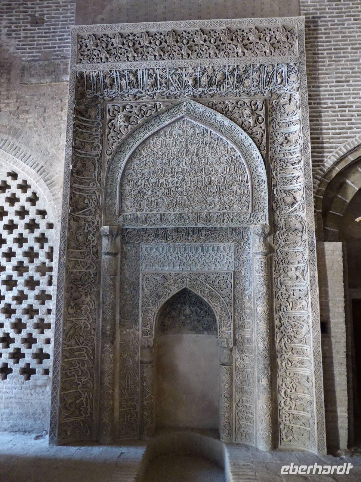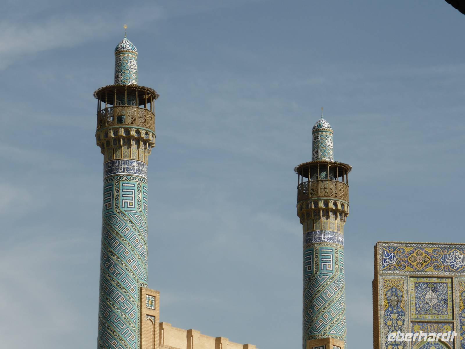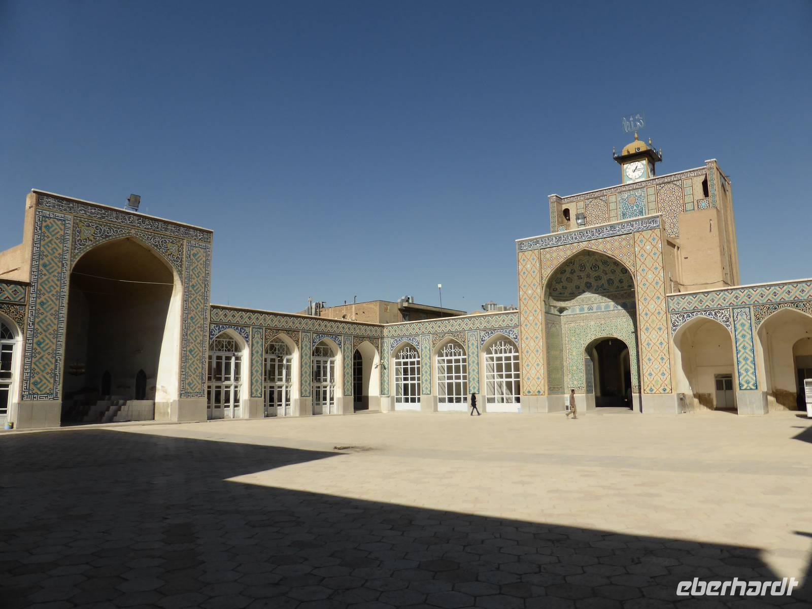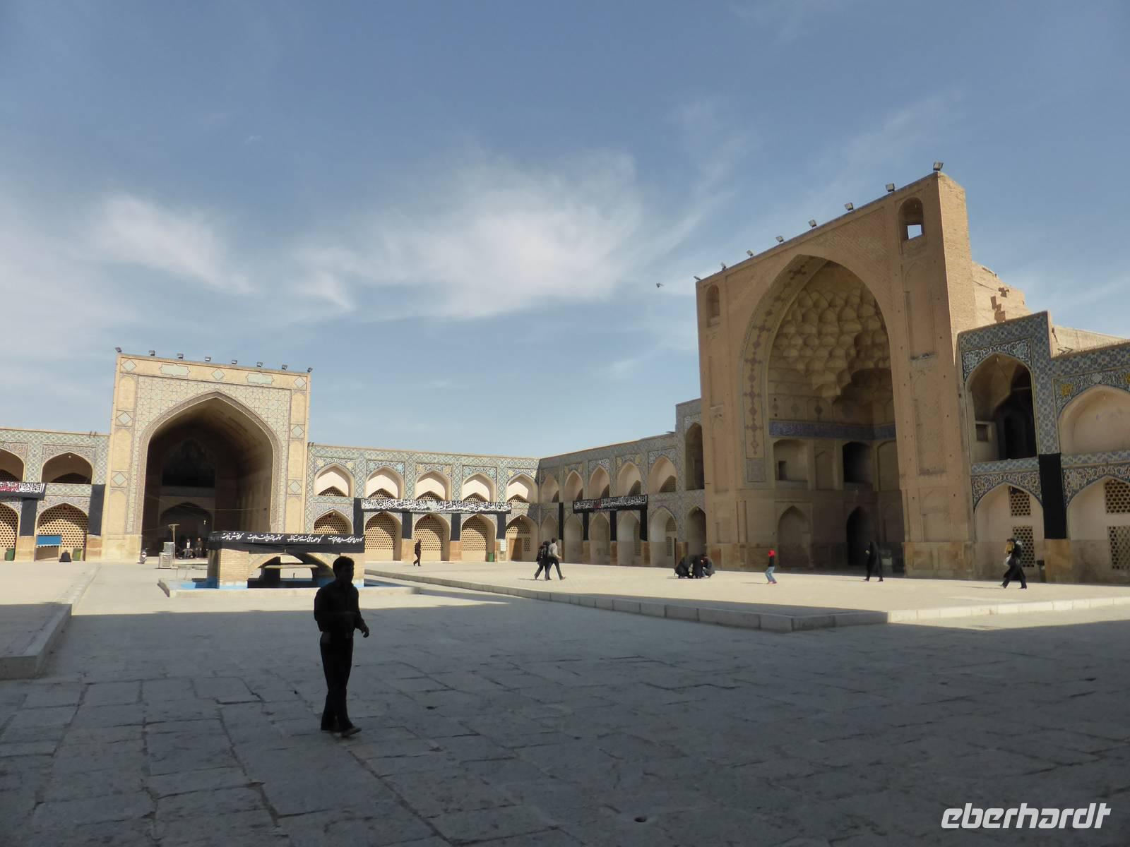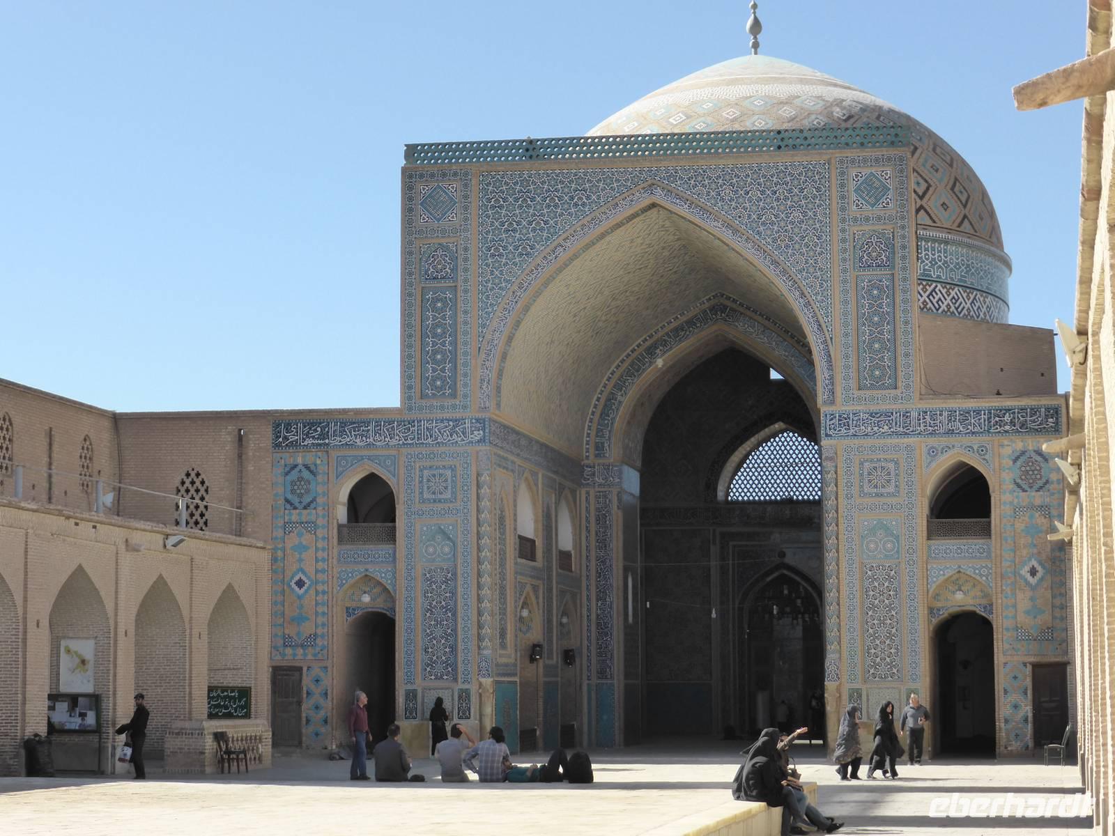Den Vormittag hatten wir Freizeit für individuelle Erkundungen. Wir wollten trotzdem alle gemeinsam zu einem CD-Geschäft in der Nähe des Hotel Abazi laufen. Viele Gäste hatten den Wunsch geäußert, iranische Musik mit nach Hause zu nehmen. Die Verkäuferin war sehr geduldig und spielte uns die unterschiedlichsten CDs iranischer Sänger und Gruppen vor. Anschließend tranken wir Tee im Garten des Hotels „Abazi", welches eine ehemalige Karawanserei ist und zu einer märchenhaften Nobelherberge umgebaut wurde. Das Wetter war fantastisch, nur der Tee ließ lange Zeit auf sich warten. Gegen Mittag fuhren wir dann vom Hotel zur alten Jame- Moschee, deren Ursprünge bis ins 8.Jh. zurückreichen. Der Besuch dieser Moschee ist wie eine Reise durch die persische Architektur- und Kunstgeschichte, da jede Epoche ihre Spuren hinterlassen hat.