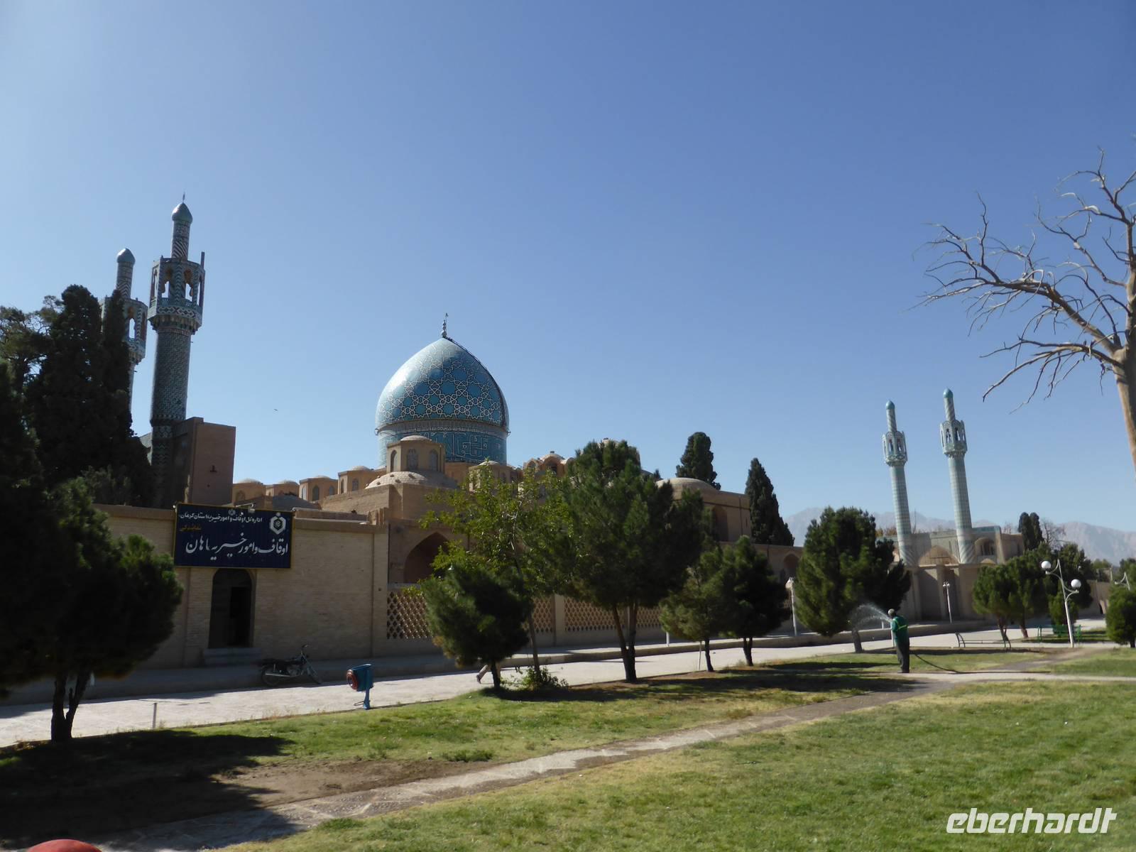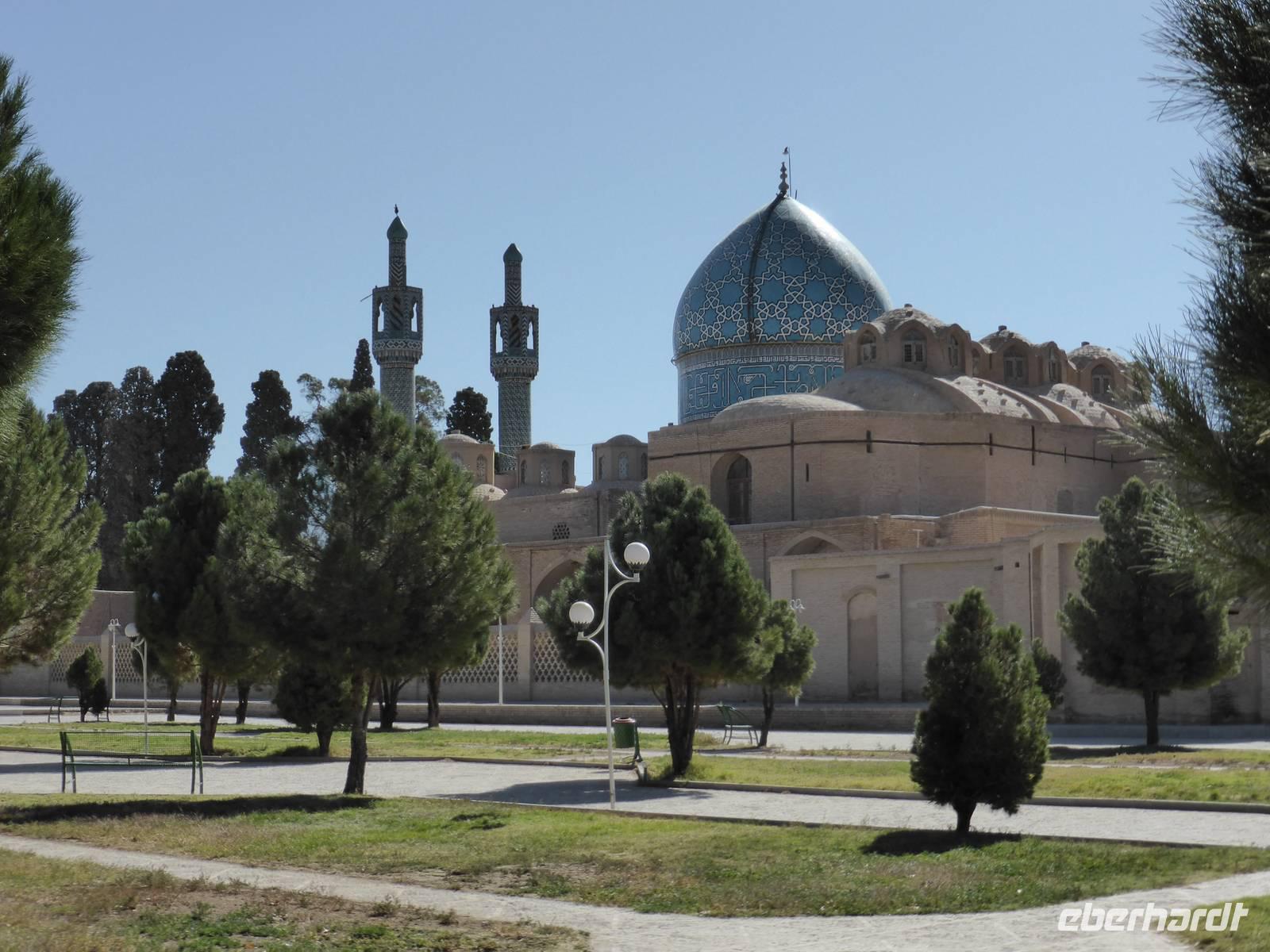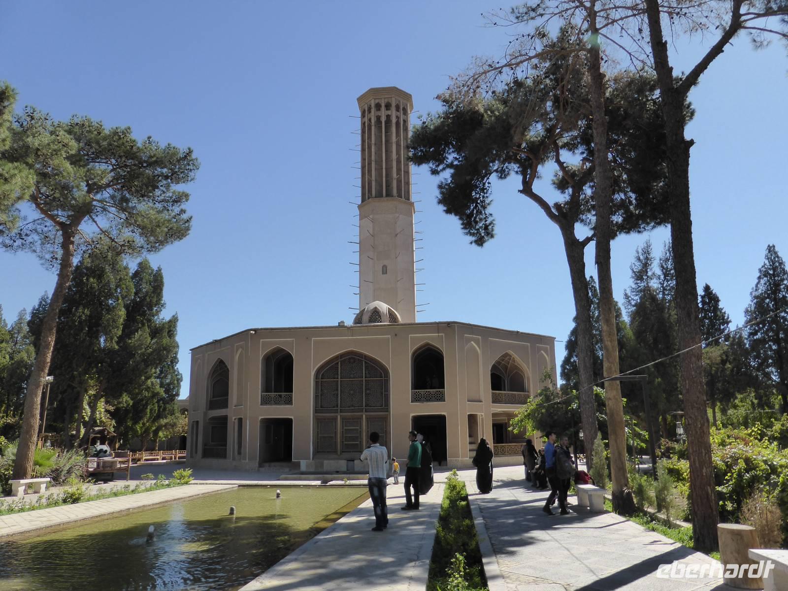Dolat-Abad-Garten, einem Pavillon mit dem höchsten Windturm des Iran und im Anschluss zum zoroastrischen Feuertempel, den Anhänger Zarathustras aus dem indischen Mumbay im Jahre 1940 ihren iranischen Glaubensbrüdern gestiftet hatten. Sein Feuer im Inneren stammt von einem anderen Ort und soll bereits seit 1500 Jahren brennen. Im Inneren des Tempels brennt die ewige Flamme, das Symbol für die Anwesenheit Gottes. Feuer, Wasser, Luft und Erde gelten den Zoroastriern als heilig. Der Feuertempel wurde bei unserer Ankunft aus Rücksicht auf die Vorbereitungen zum muslimischen Ashura-Trauerfestes für die Öffentlichkeit gesperrt.