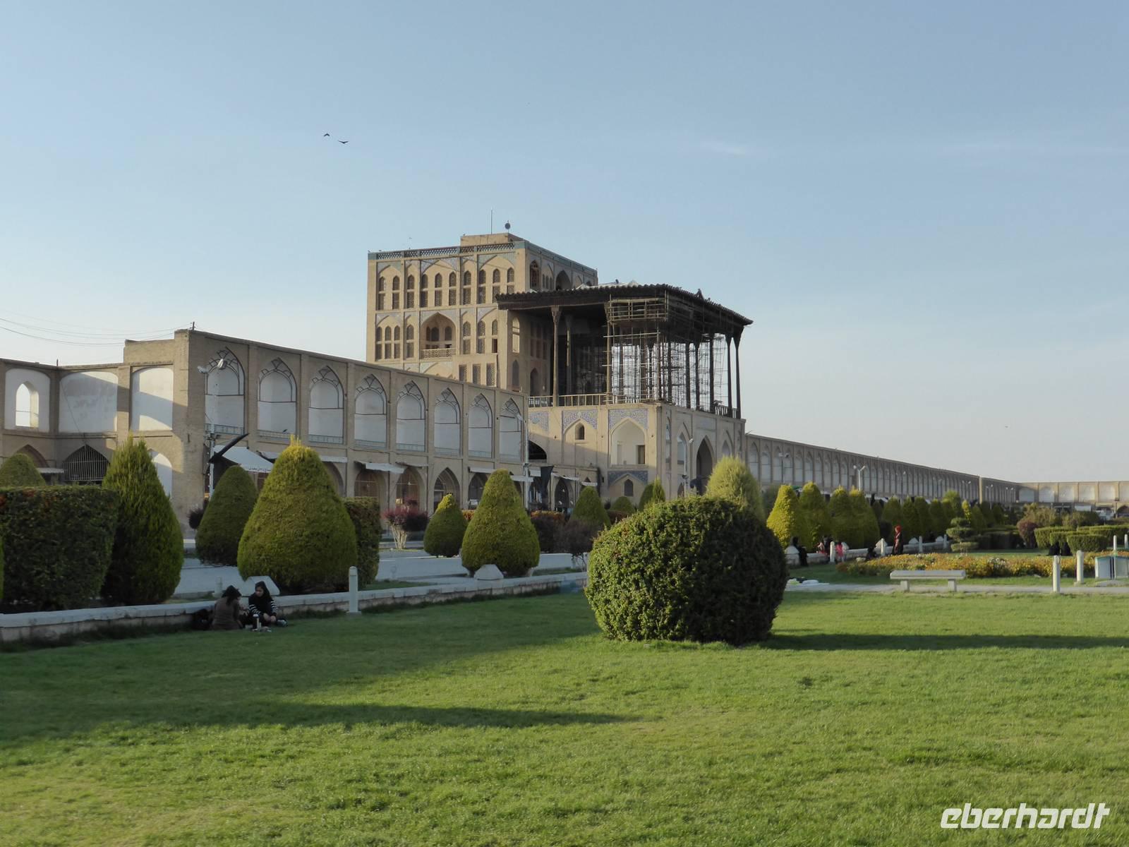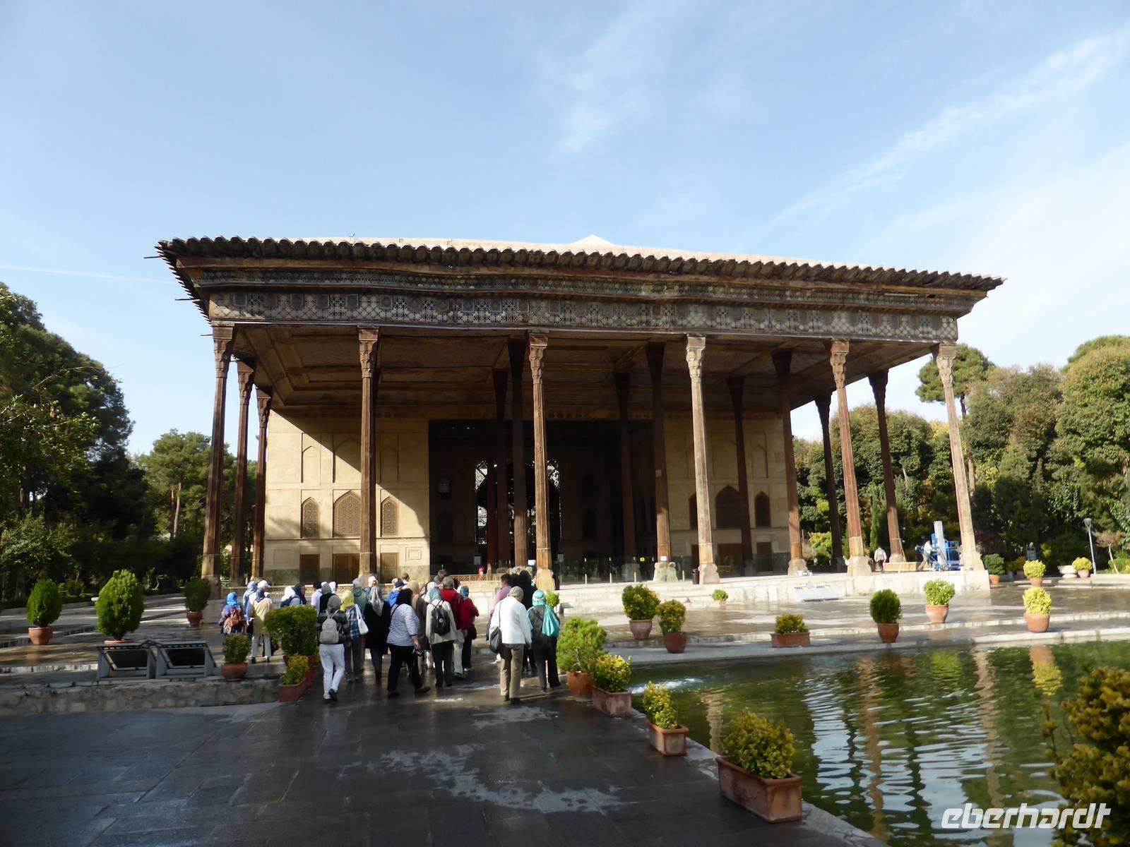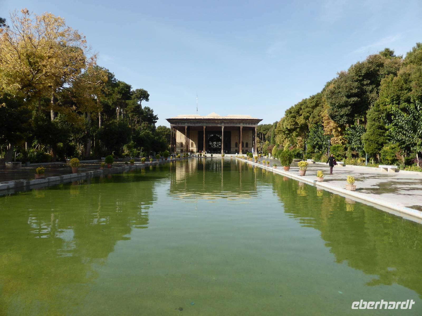Nach dem Frühstück spazierten wir zum Hasht Behesht-Palast und von diesem zum Chehel-Sotun-Palast, einer großen Gartenanlage mit einem langgezogenen Wasserbecken, an dessen Ende sich wieder ein gewaltiger Palast erhebt, dessen Dach von zwanzig Säulen aus Zedernholz gestützt wird. Die Verdopplung der Säulen durch die Spiegelung im Wasserbecken gab dem Palast seinen Namen (40-Säulen-Palast). Der safawidische Shah Abbas I. ließ ihn im Jahre 1647 erbauen. Im Inneren des Palastes sind die Wände mit Gemälden politischer Ereignisse des 16.-18. Jahrhunderts geschmückt.