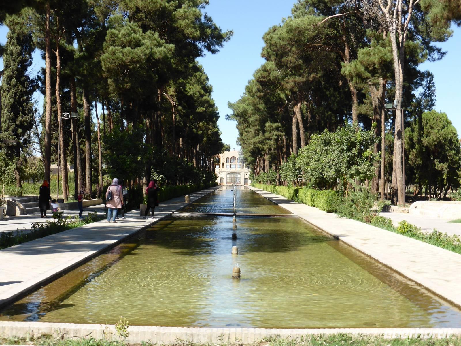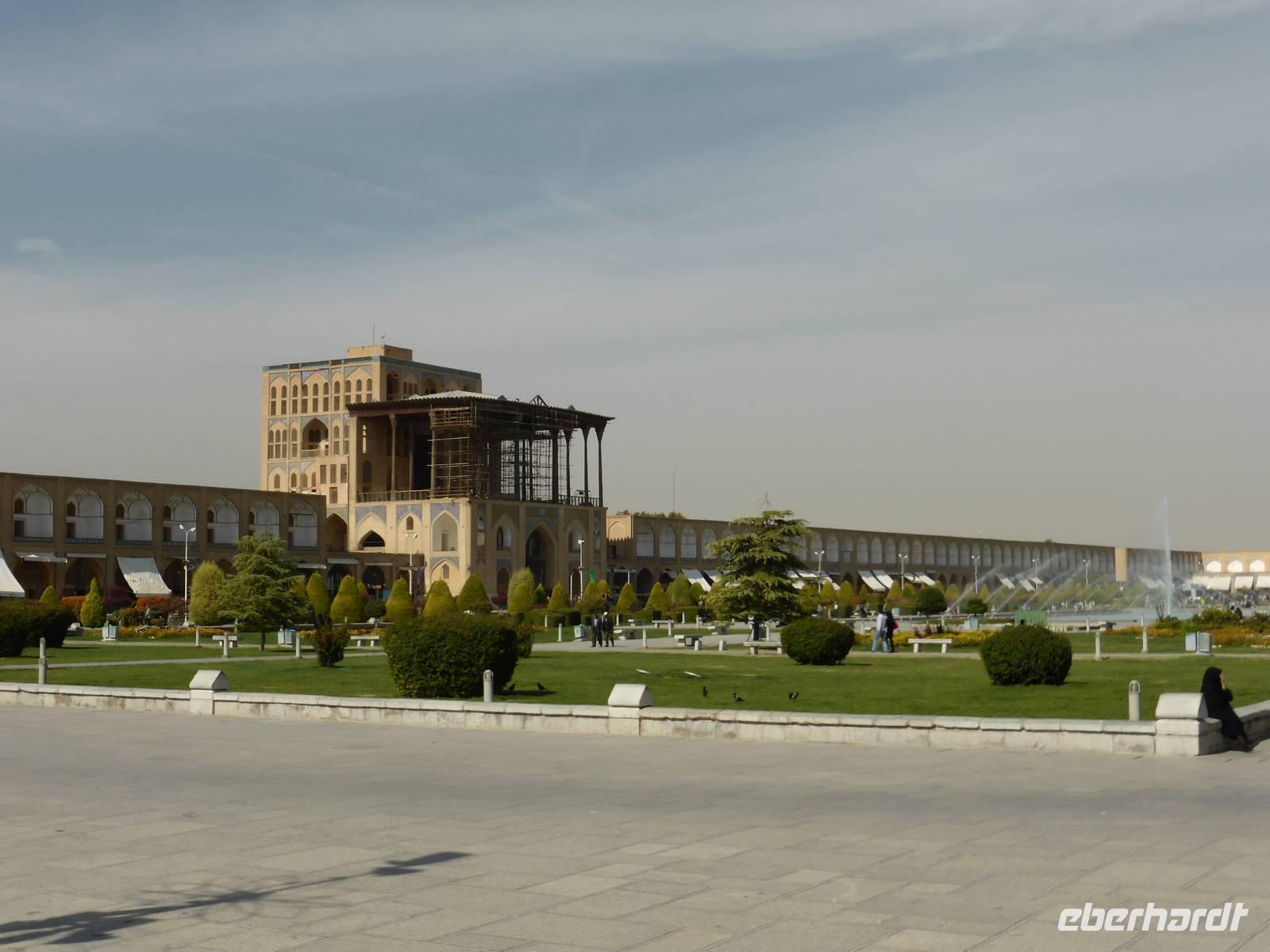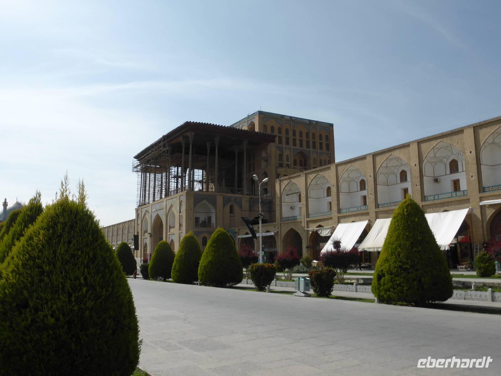 Nach dem Frühstück spazierten wir zum Hasht Behesht-Palast und von diesem zum Chehel-Sotun-Palast, einer großen Gartenanlage mit einem langgezogenen Wasserbecken, an dessen Ende sich wieder ein gewaltiger Palast erhebt, dessen Dach von zwanzig Säulen aus Zedernholz gestützt wird. Die Verdopplung der Säulen durch die Spiegelung im Wasserbecken gab dem Palast seinen Namen (40-Säulen-Palast). Der safawidische Shah Abbas I. ließ ihn im Jahre 1647 erbauen. Im Inneren des Palastes sind die Wände mit Gemälden politischer Ereignisse des 16.-18. Jahrhunderts geschmückt.