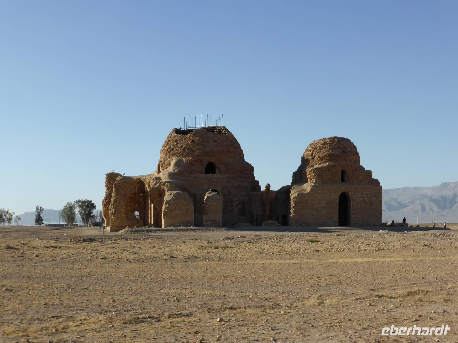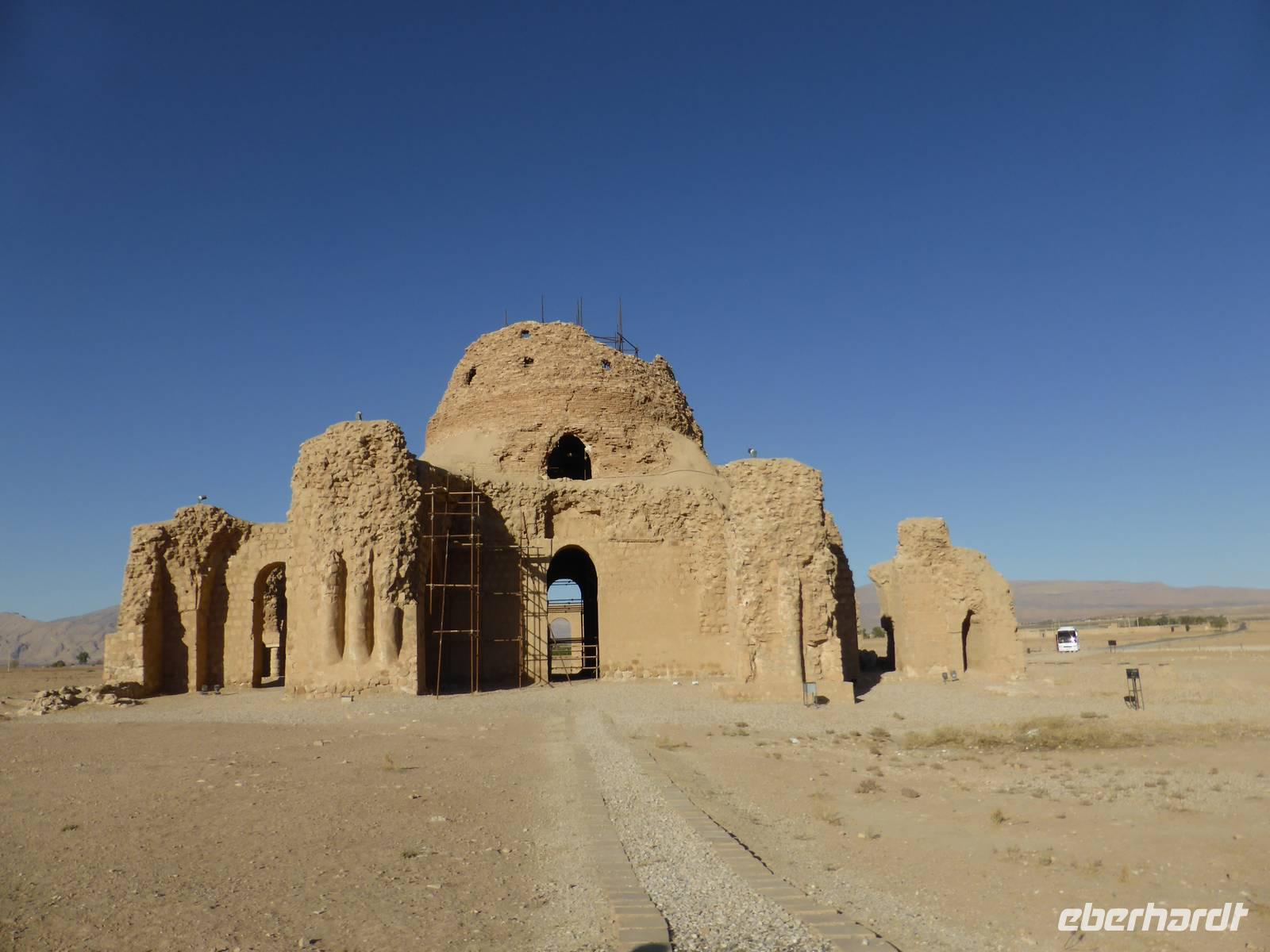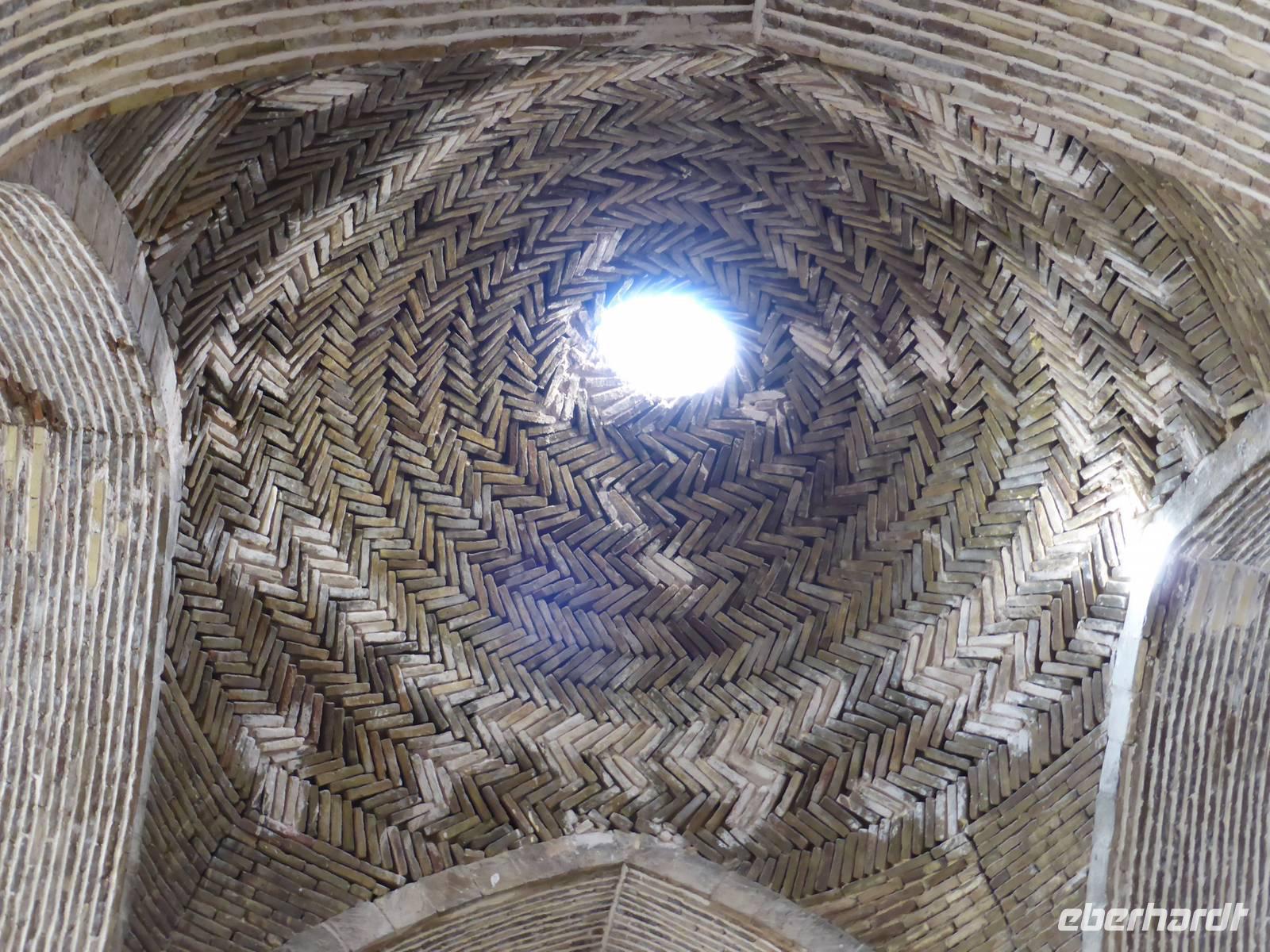 Nach dem Frühstück ging es von Zanjan zum Oljeitu-Mausoleum in Sultaniye, welches auf der Liste des UNESCO-Weltkulturerbes steht. Benannt ist das Mausoleum nach dem Ilkhanidenherrscher Oljeitu, der seine Residenz von Tabriz nach Sultaniyeh verlegte, zum Schiitentum übertrat und im Mausoleum ursprünglich die Gebeine der Imame Ali und Hoseyn beisetzen wollte. Die Grabanlage ist der größte Kuppelbau Irans und in der Dimension mit der Hagia Sophia in Istanbul vergleichbar. Mittlerweile sind die äußeren Rekonstruktionsarbeiten an der Kuppel beendet, so dass ihre türkisblaue Farbe schon von weitem den Weg weist. Nach der Besichtigung des Mausoleums in Soltaniyeh fuhren wir in Richtung Ali Sadr und hielten unterwegs in einem kleinen Bauerndorf, mit Häusern aus Lehmziegeln und mehreren Hühnerfarmen. Von den Bewohnern des Dorfes wurden wir mit großer Neugierde empfangen und mit selbst gebackenem Fladenbrot begrüßt.