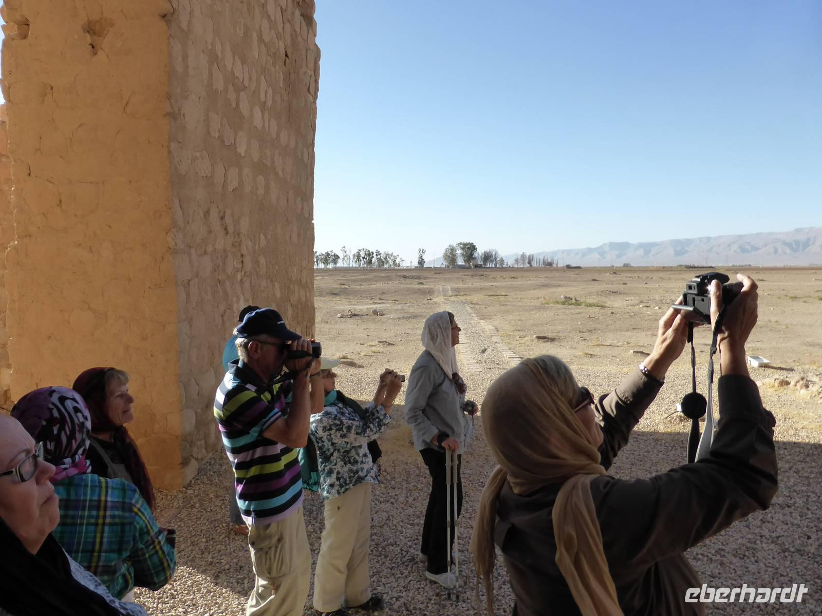 Am heutigen Tag stand eine lange Busetappe auf dem Programm. Unser Ziel war Shiraz. Von Kerman aus fuhren wir durch ein Pistazien-Anbaugebiet über Sirjan in Richtung Westen. Das Wetter war wieder fantastisch! Oberhalb des Daryacheh-ye-Bakhtegan-Salzsees legten wir einen Fotostopp ein. Es gibt im Zagrosgebirge eine Salzquelle, in der aus 1000 Metern Tiefe Wasser an die Erdoberfläche gedrückt wird und anschließend in die Salzseen fließt. Weiter ging es nach Sarvestan, zum Palast Bahram V. aus sassanidischer Zeit. Man nimmt an, dass die Anlage um 430 n.Chr. errichtet sein könnte und sie sowohl eine repräsentative als auch sakrale Funktion innehatte. Nach einer gemütlichen Kaffee- und Teepause fuhren wir weiter in Richtung Shiraz. Kurz vor der Stadt sahen wir einen weiteren Salzsee und an dessen Rand die aufgeschütteten Salzhalden. Gegen 18.15 Uhr kamen wir dann an unserem Hotel „Parseh" in Shiraz an. Da es mitten im Stadtzentrum liegt, nutzten viele nach dem Abendessen die Gelegenheit zu einem kleinen Spaziergang. Überall waren die Prozessionen im Gange, bei denen man sich auf das bevorstehende Ashura-Trauerfest vorbereitete. Jeder Prozessions-Zug wurde von Musikkapellen begleitet und die Teilnehmer boten symbolische Selbstgeißelungen dar: Sie bestrafen sich damit jedes Jahr aufs Neue, dass die Bewohner von Kufa Hussein, den Enkel des Propheten, im Jahre 680 in der Schlacht von Kerbela nicht unterstützt hatten und dieser gegen die herrschende Kalifenlinie der Umayyaden unterlag.