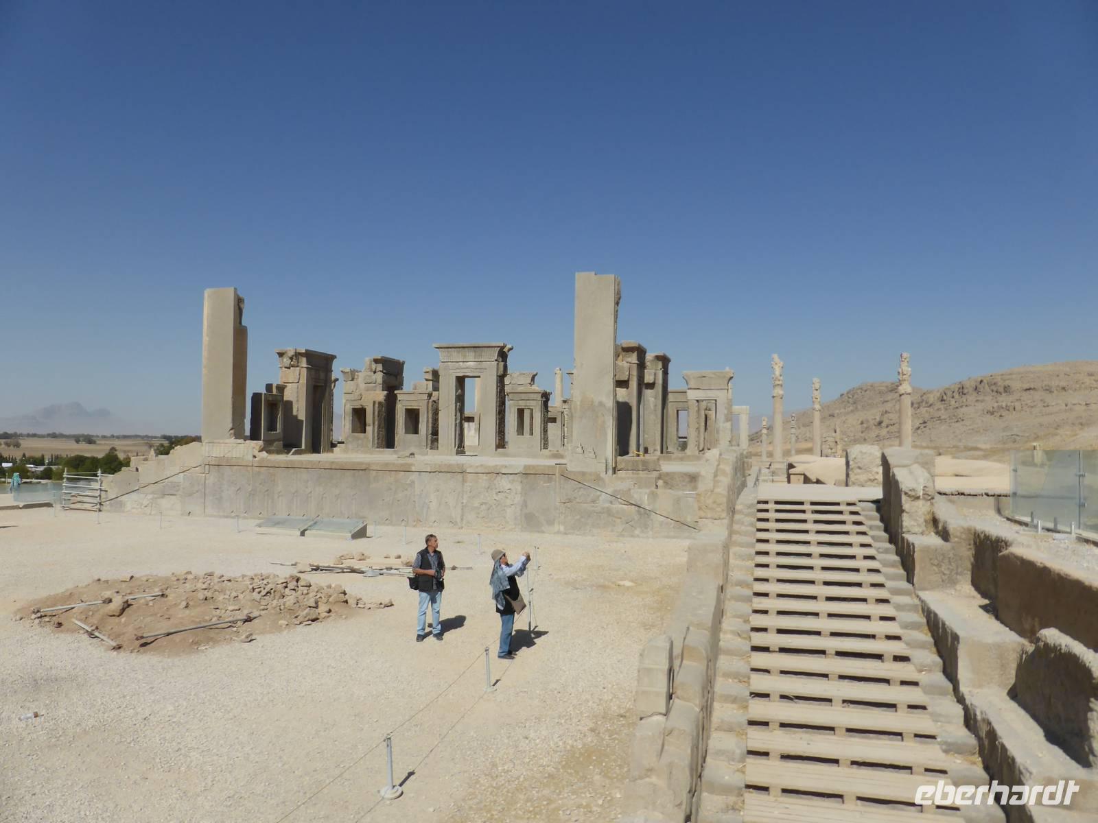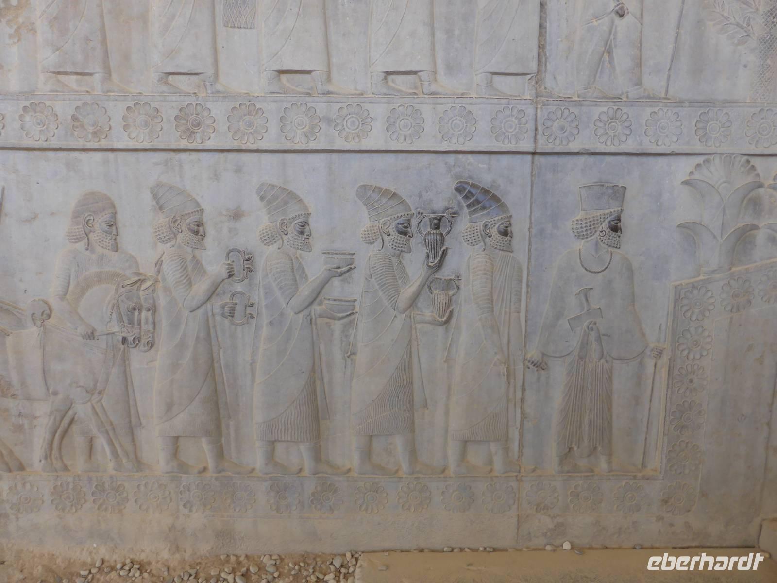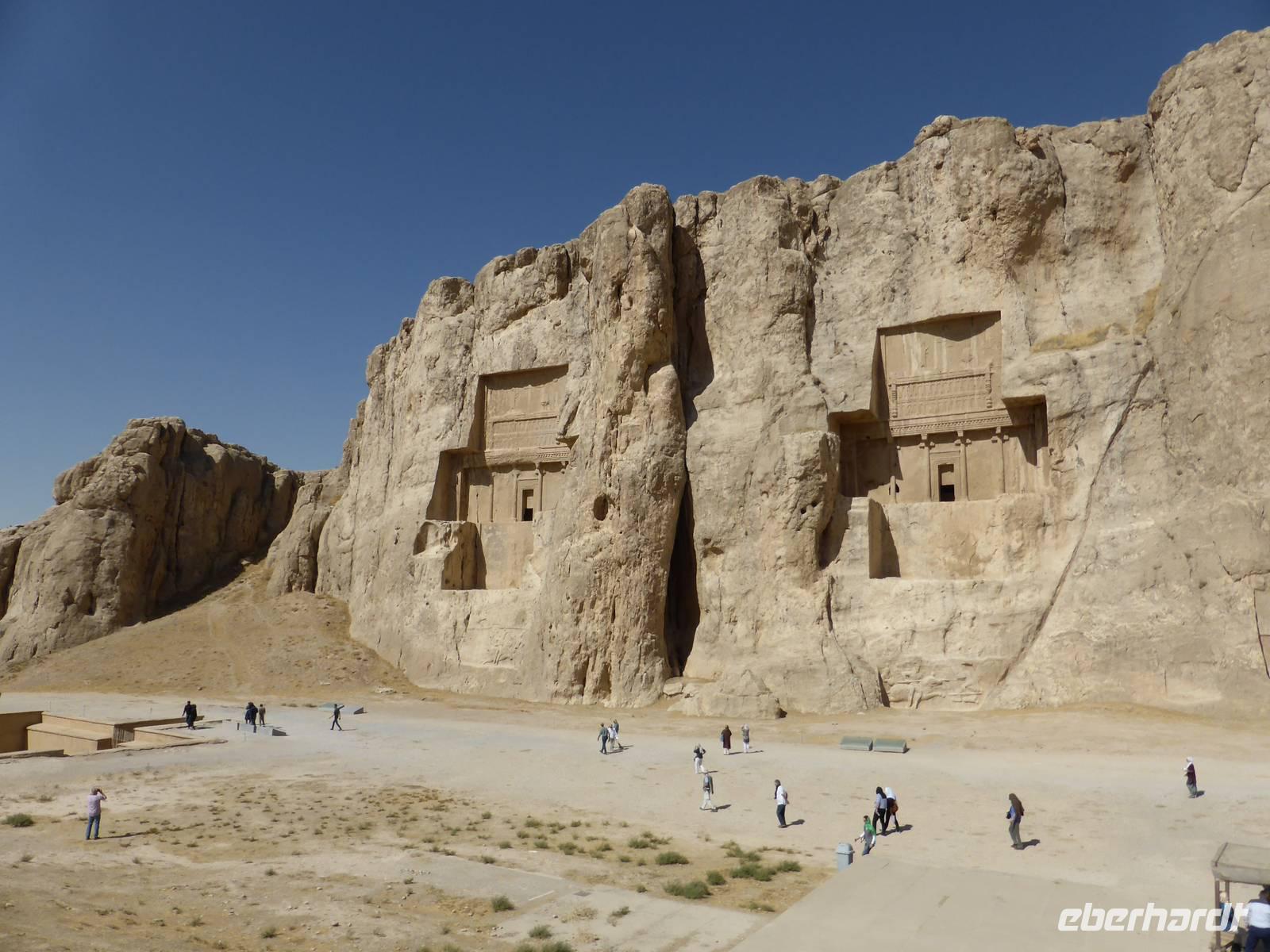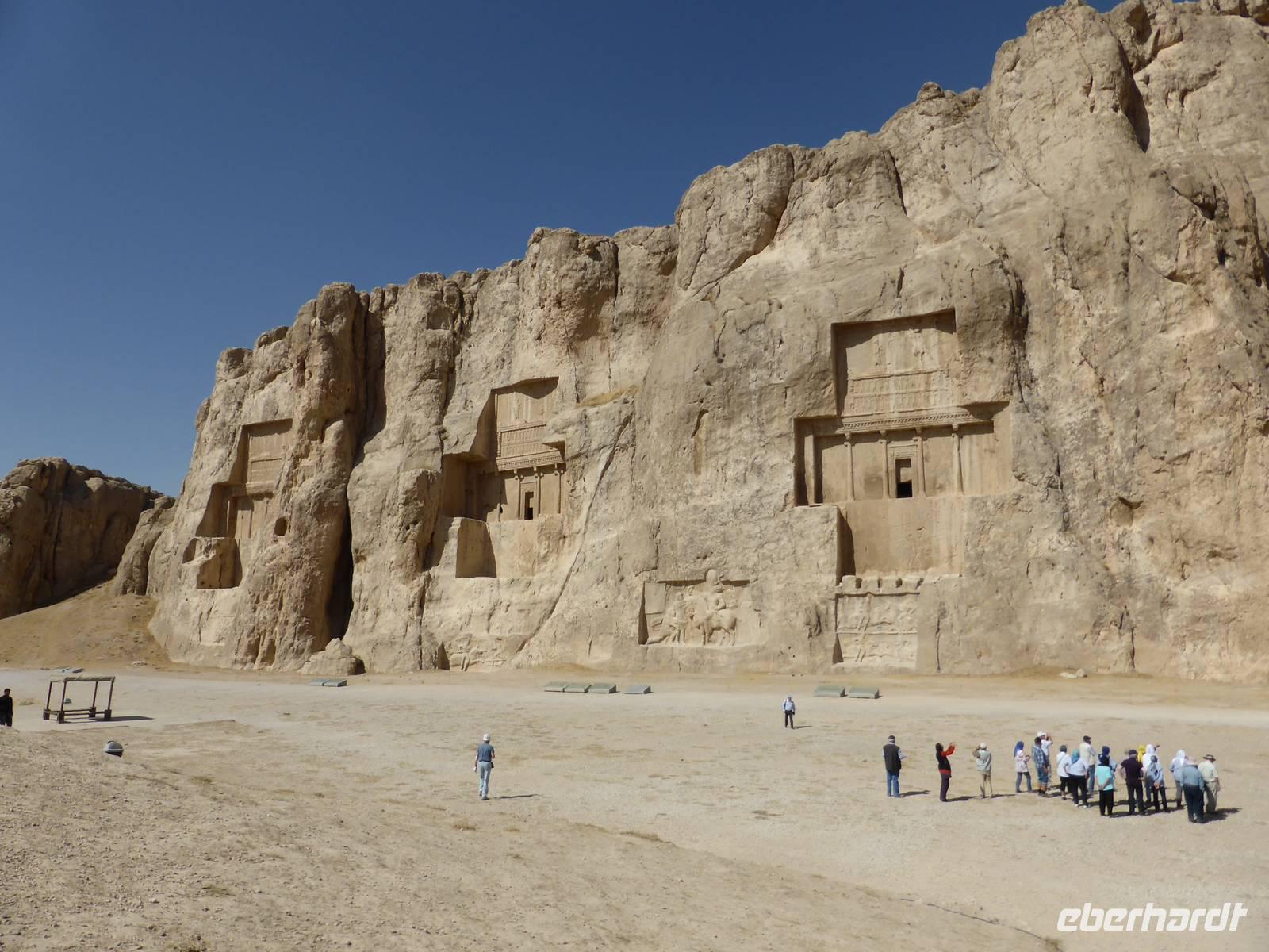 An diesem Tag erwartete uns der Höhepunkt der Reise, die Besichtigung von Persepolis. Persepolis, die Repräsentationshauptstadt des achämenidisch- persischen Weltreichs, wurde von Darius I. um 518 v.Chr. gegründet und existierte bis zu ihrer Zerstörung durch das griechische Heer Alexanders des Großen im Jahre 331 v.Chr.. Persepolis diente vor allem auch der Ausrichtung der Neujahrsfeierlichkeiten, zu denen jedes Jahr Ende März, dem Jahresbeginn im persischen Sonnenkalender, Gesandtschaften aus allen Völkern des Reiches eintrafen und ihre Geschenke überreichten. Im Gelände befinden sich der Apadana-Audienzpalast, das Schatzhaus sowie die Paläste von Darius und Xerxes. Ein Blick vom Felsengrab Artaxerxes II. verdeutlichte uns die riesigen Ausmaße der Terrassenanlage. Nach der Besichtigung von Persepolis fuhren wir in die nahe gelegene Nekropole Naqsh-e-Rostam. Die Felsgräber sind kreuzförmig aus dem Fels herausgearbeitet worden und in der Mitte mit einem Eingang zur Grabkammer versehen. Das einzige bisher eindeutig identifizierte Grab ist das Grab von Darius I., was eine Inschrift belegt.