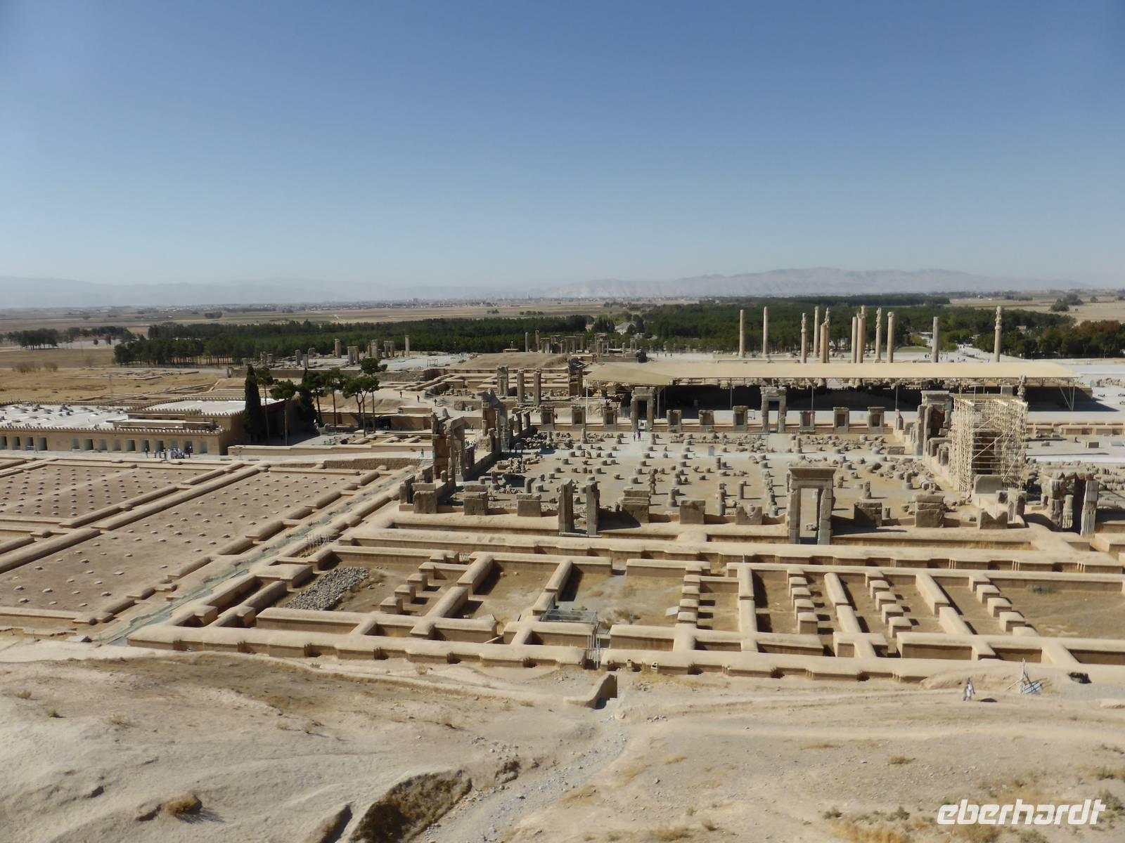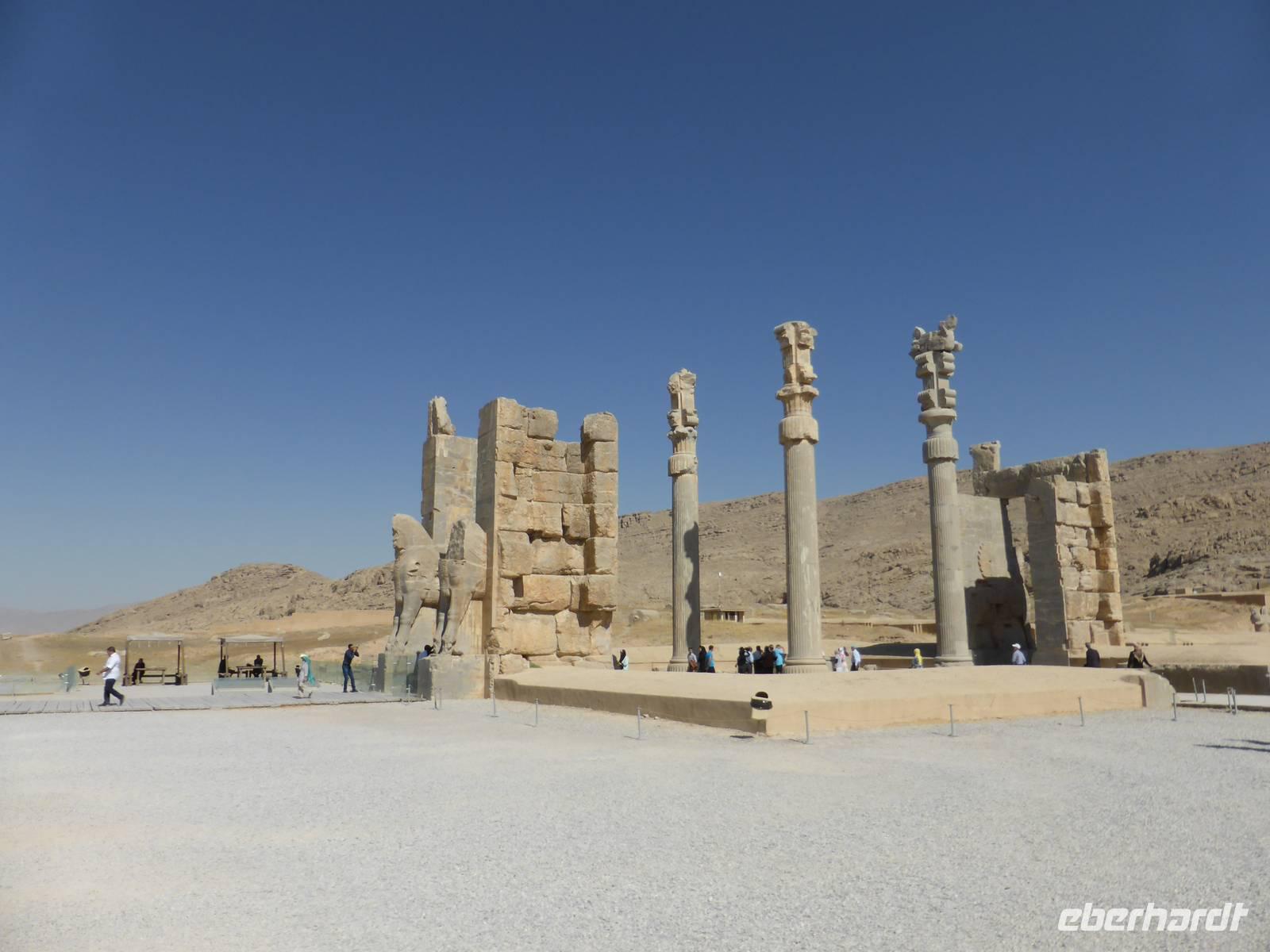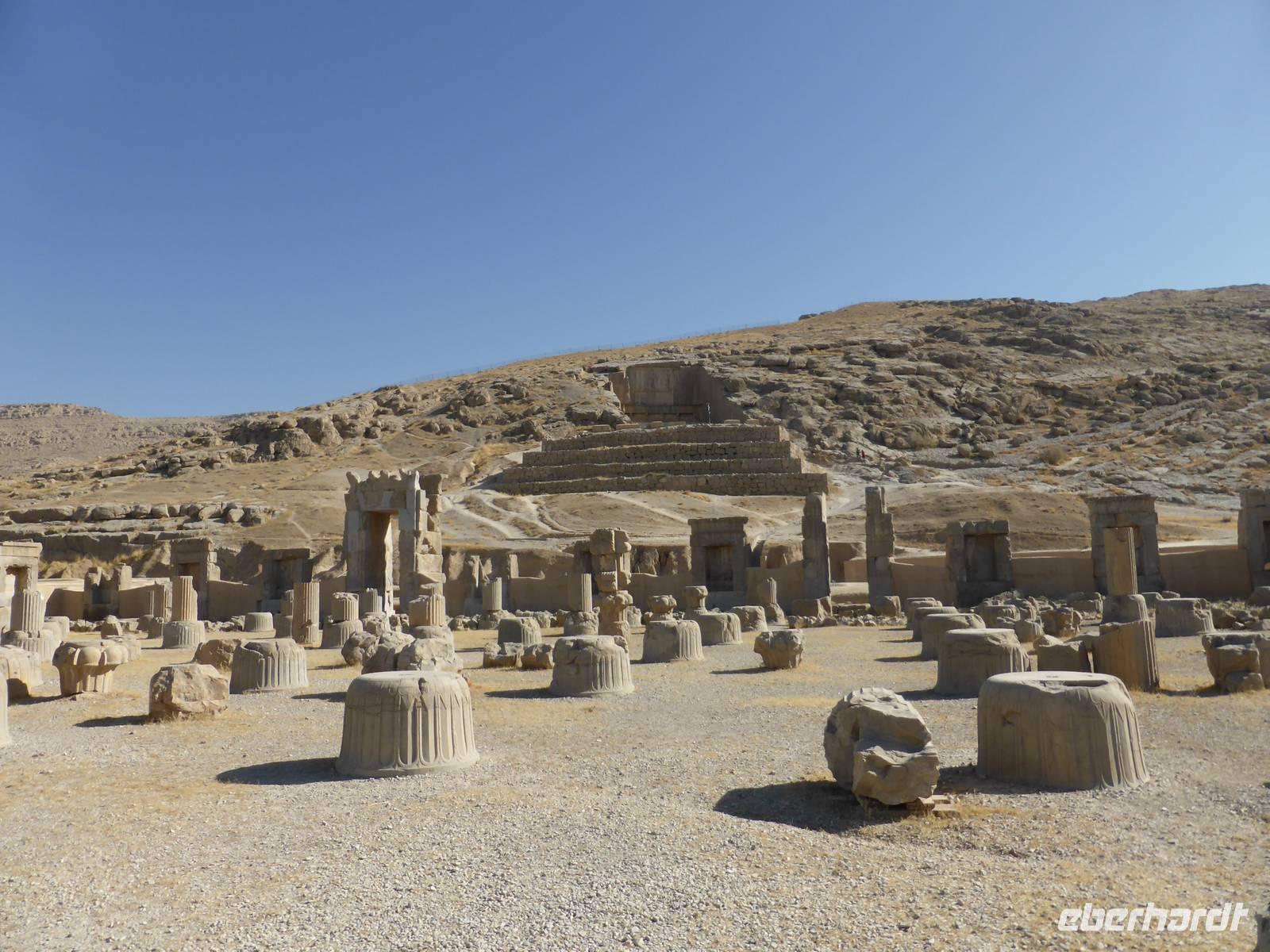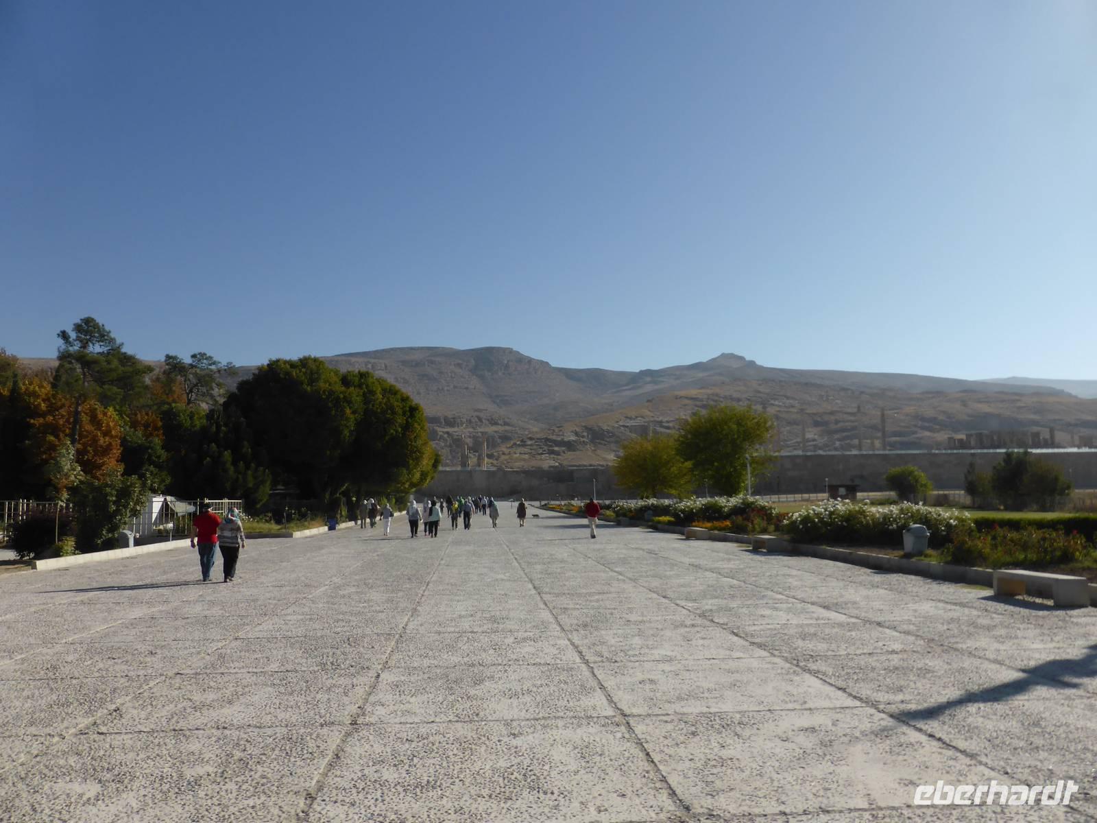 An diesem Tag erwartete uns der Höhepunkt der Reise, die Besichtigung von Persepolis. Persepolis, die Repräsentationshauptstadt des achämenidisch- persischen Weltreichs, wurde von Darius I. um 518 v.Chr. gegründet und existierte bis zu ihrer Zerstörung durch das griechische Heer Alexanders des Großen im Jahre 331 v.Chr.. Persepolis diente vor allem auch der Ausrichtung der Neujahrsfeierlichkeiten, zu denen jedes Jahr Ende März, dem Jahresbeginn im persischen Sonnenkalender, Gesandtschaften aus allen Völkern des Reiches eintrafen und ihre Geschenke überreichten. Im Gelände befinden sich der Apadana-Audienzpalast, das Schatzhaus sowie die Paläste von Darius und Xerxes. Ein Blick vom Felsengrab Artaxerxes II. verdeutlichte uns die riesigen Ausmaße der Terrassenanlage. Nach der Besichtigung von Persepolis fuhren wir in die nahe gelegene Nekropole Naqsh-e-Rostam. Die Felsgräber sind kreuzförmig aus dem Fels herausgearbeitet worden und in der Mitte mit einem Eingang zur Grabkammer versehen. Das einzige bisher eindeutig identifizierte Grab ist das Grab von Darius I., was eine Inschrift belegt.