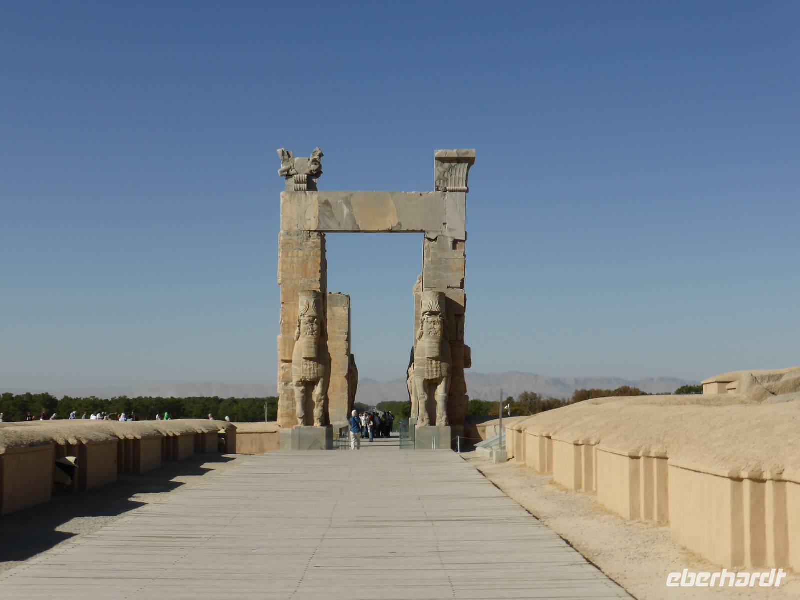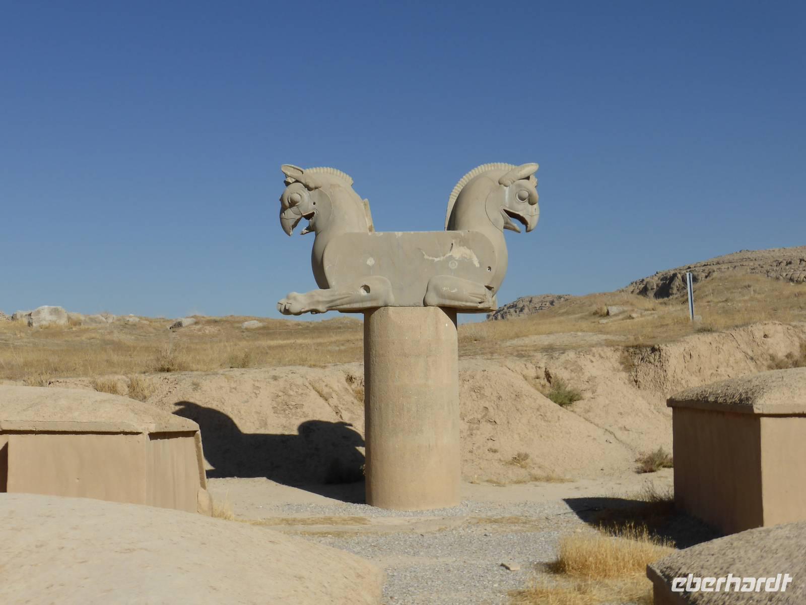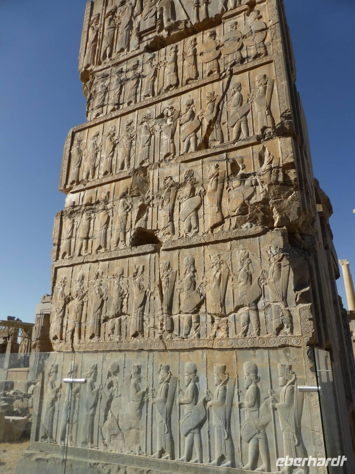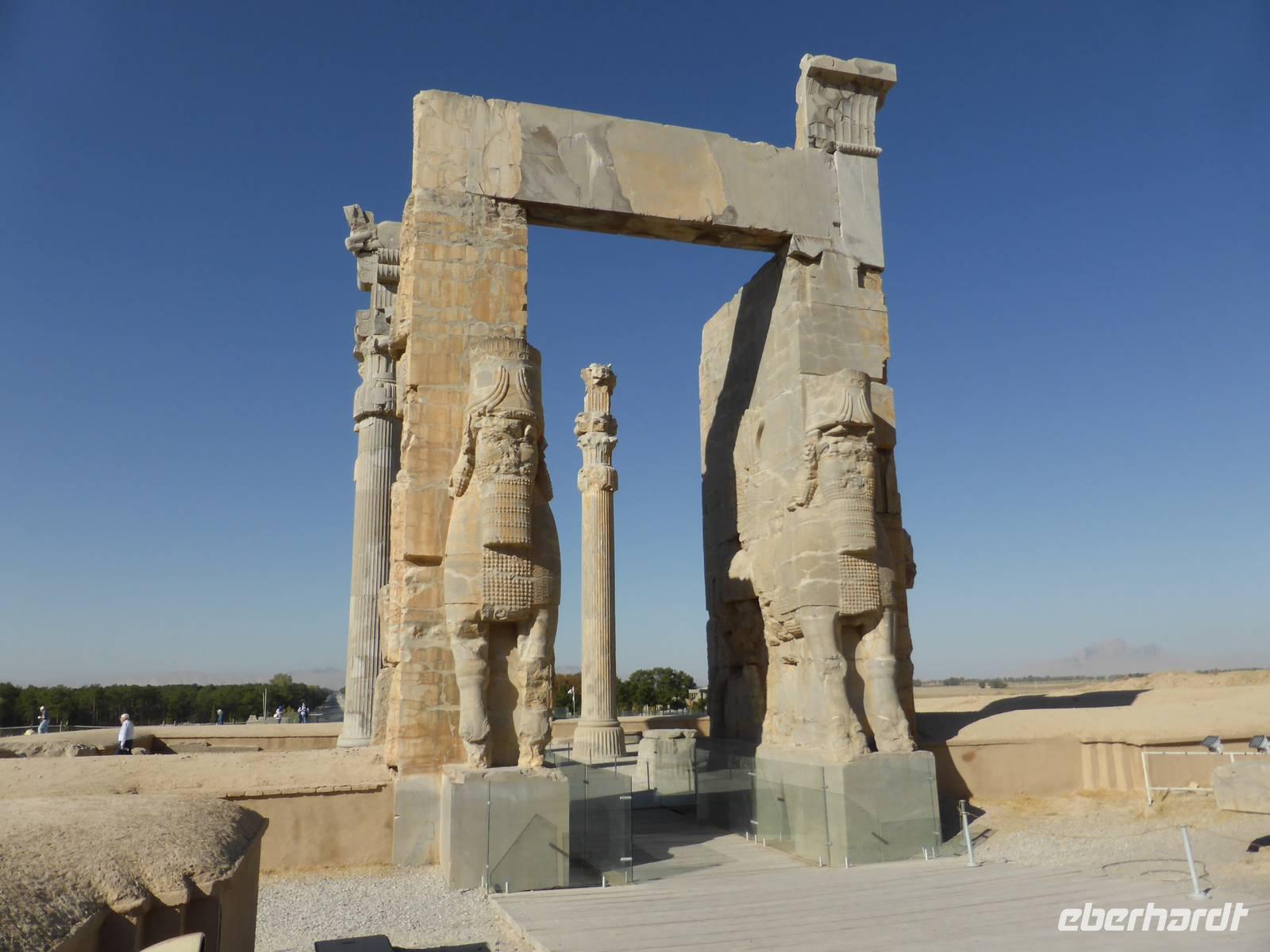 An diesem Tag erwartete uns der Höhepunkt der Reise, die Besichtigung von Persepolis. Persepolis, die Repräsentationshauptstadt des achämenidisch- persischen Weltreichs, wurde von Darius I. um 518 v.Chr. gegründet und existierte bis zu ihrer Zerstörung durch das griechische Heer Alexanders des Großen im Jahre 331 v.Chr.. Persepolis diente vor allem auch der Ausrichtung der Neujahrsfeierlichkeiten, zu denen jedes Jahr Ende März, dem Jahresbeginn im persischen Sonnenkalender, Gesandtschaften aus allen Völkern des Reiches eintrafen und ihre Geschenke überreichten. Im Gelände befinden sich der Apadana-Audienzpalast, das Schatzhaus sowie die Paläste von Darius und Xerxes. Ein Blick vom Felsengrab Artaxerxes II. verdeutlichte uns die riesigen Ausmaße der Terrassenanlage. Nach der Besichtigung von Persepolis fuhren wir in die nahe gelegene Nekropole Naqsh-e-Rostam. Die Felsgräber sind kreuzförmig aus dem Fels herausgearbeitet worden und in der Mitte mit einem Eingang zur Grabkammer versehen. Das einzige bisher eindeutig identifizierte Grab ist das Grab von Darius I., was eine Inschrift belegt.