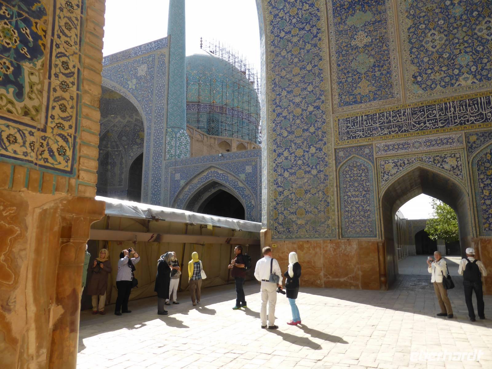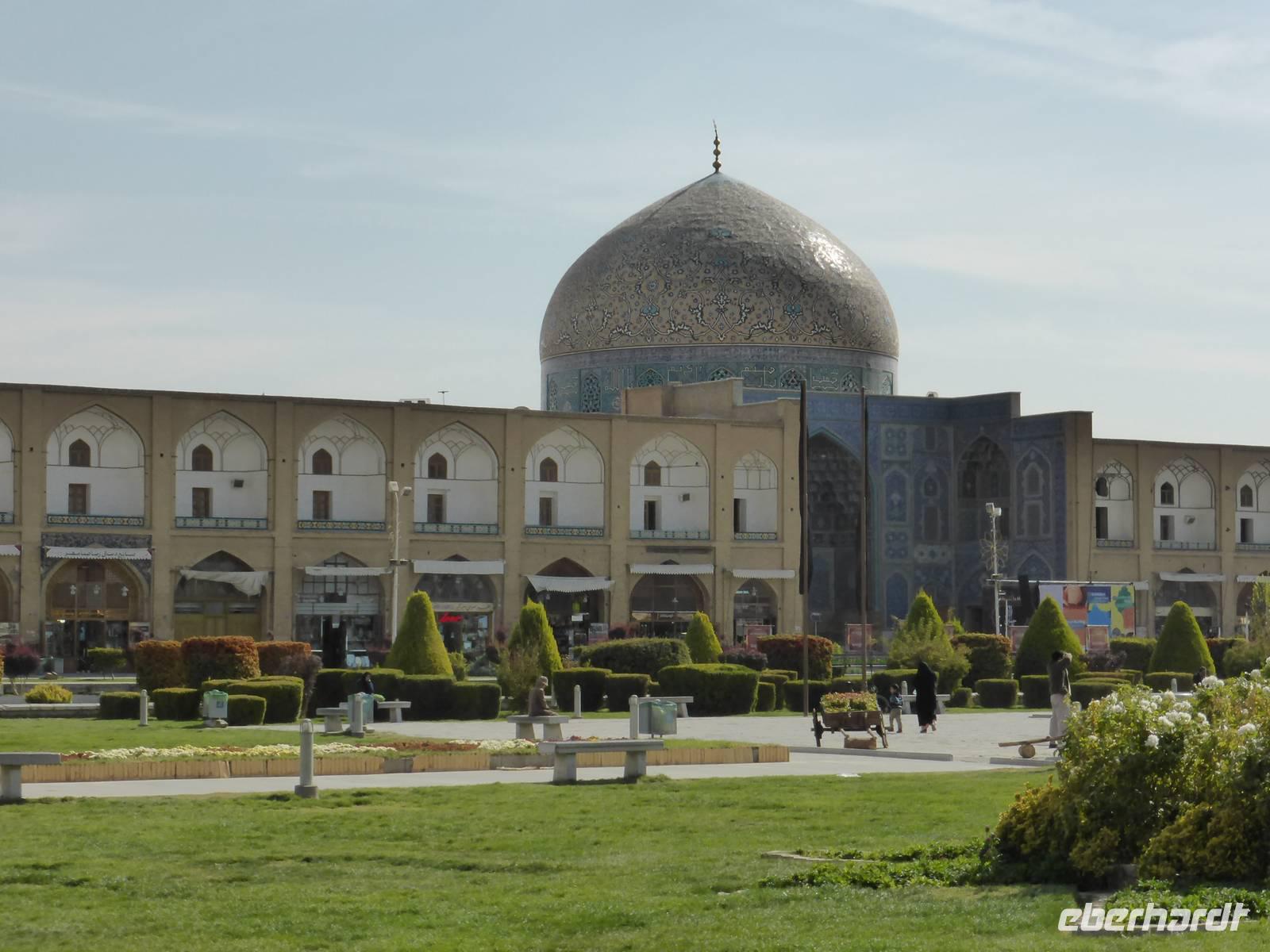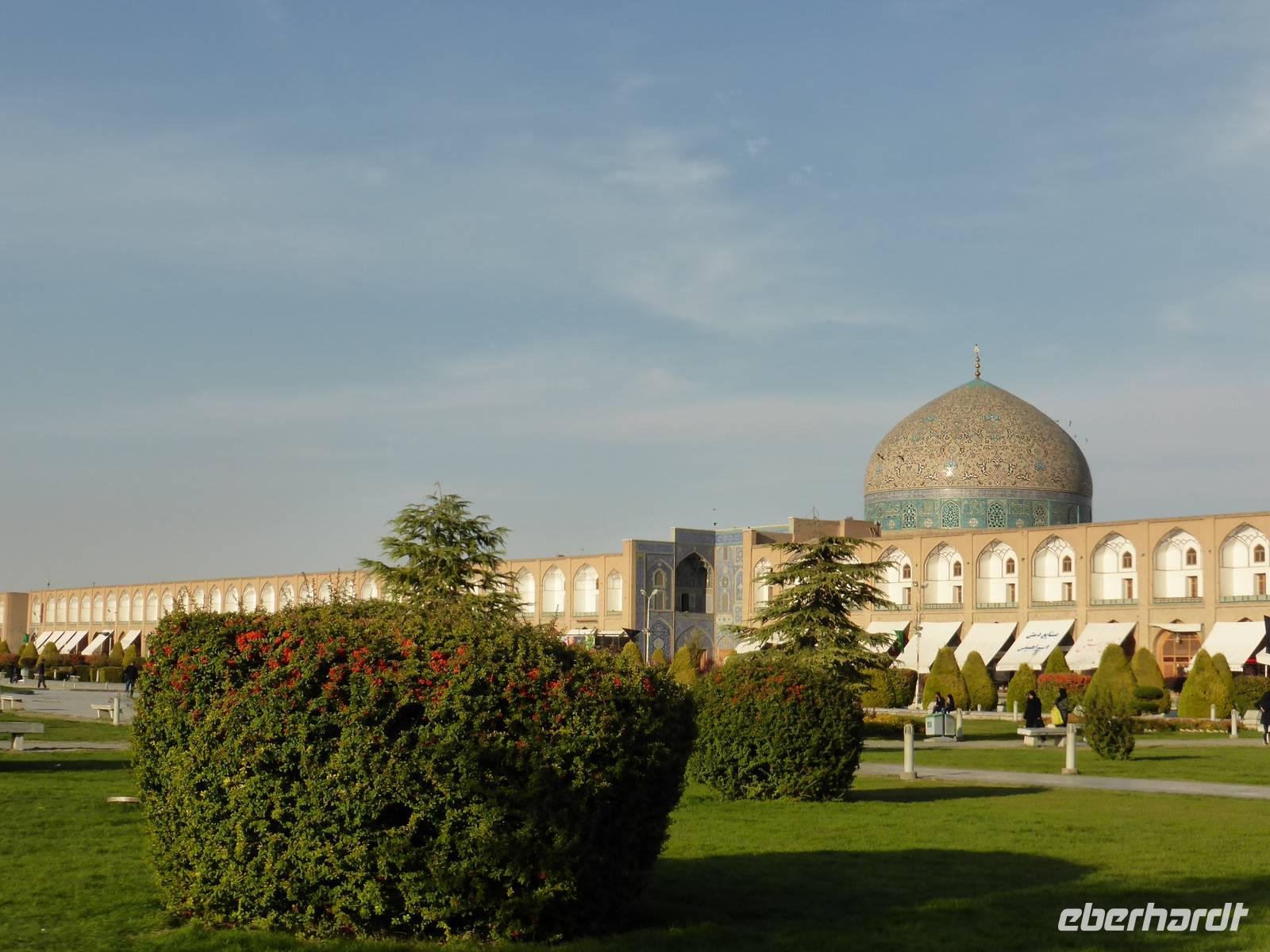 Vom 40-Säulen-Palast aus spazierten wir zum Maydan-e Naqsh-e Jahan-Platz bzw. auch Imam-Platz, dem Abbild der Welt. Er zählt sicherlich zu den schönsten der Welt. An den Platz schließt sich die Imam- Moschee an, welche wir als nächstes besichtigten. Leider war im Innenhof ein riesiges Zelt aufgebaut, in dem anlässlich der Feiertage täglich Veranstaltungen stattfanden. Trotz der eingeschränkten Blickwinkel waren wir von der Architektur und Akustik beeindruckt. Mitten unter der großen Kuppel der Moschee ist in Kopfhöhe die Akustik am besten. Ali nahm einen gefalteten Geldschein, hielt ihn an beiden Enden fest und öffnete ihn mit einem Ruck, indem er ihn blitzschnell auseinanderzog. Das war so laut als würde jemand vor uns in die Hände klatschen. Anschließend hatten wir noch etwas Freizeit in der Moschee, in der uns ein Mullah zur Begrüßung Bonbons reichte und sich mit uns über unsere Reise und Eindrücke unterhielt. Nach der Freizeit besuchten wir gemeinsam die Lotfullah-Moschee, die ehemalige Privatmoschee der safawidischen Königsfamilien oder auch Frauenmoschee genannt sowie den Ali Qapu Palast. Von einer gewaltigen Veranda im 3. Stock kann man den gesamten Imam-Platz fantastisch überschauen. Leider stand uns aufgrund von Bauarbeiten nicht die gesamte Fläche zur Verfügung, aber selbst vom zugänglichen Teil gelangen uns einmalige Fotoaufnahmen. Wir konnten uns leicht in die Lage versetzen, wie das Königshaus von hier oben aus die Polo-Spiele unten auf dem großen Platz verfolgen konnte.