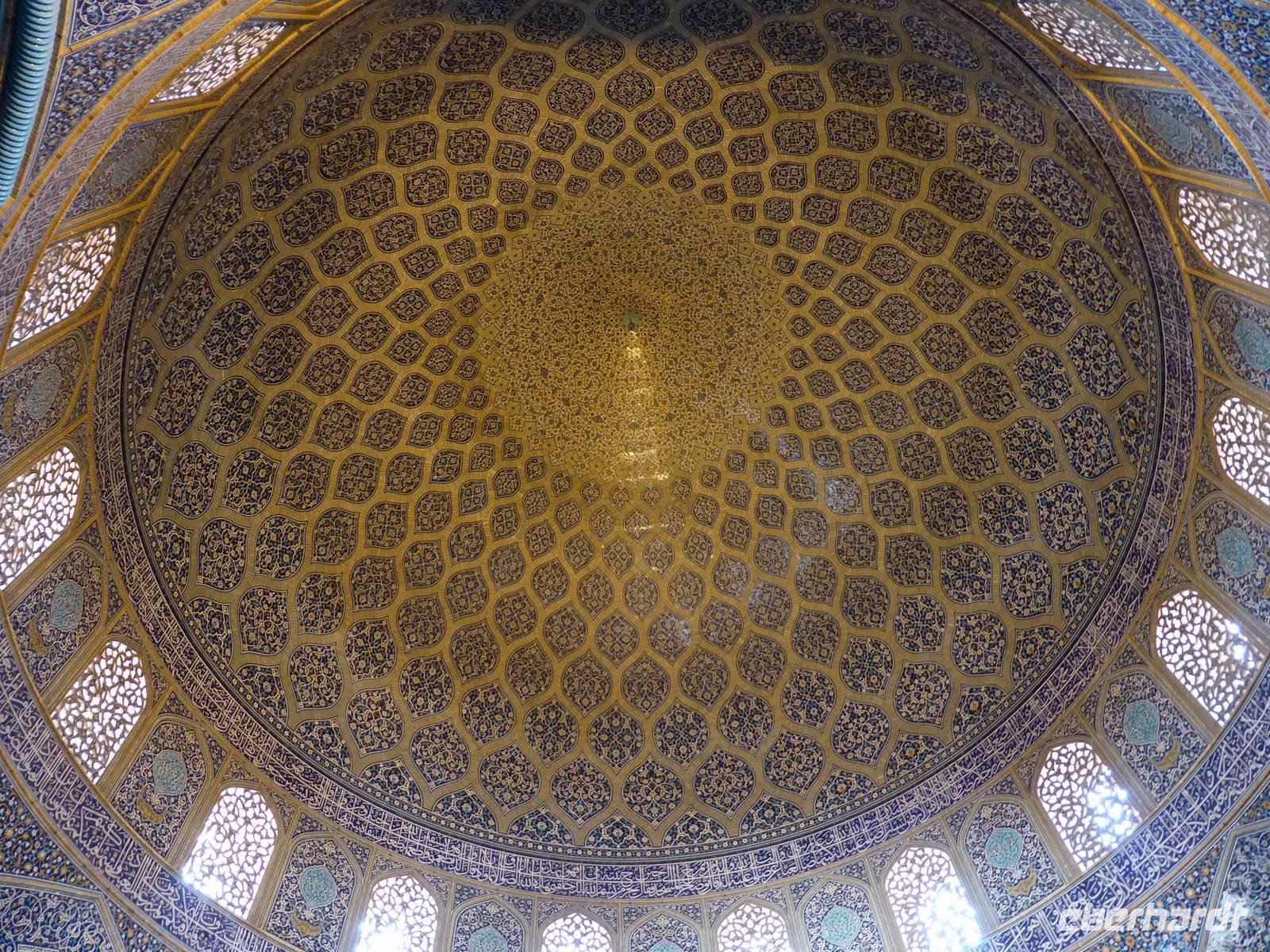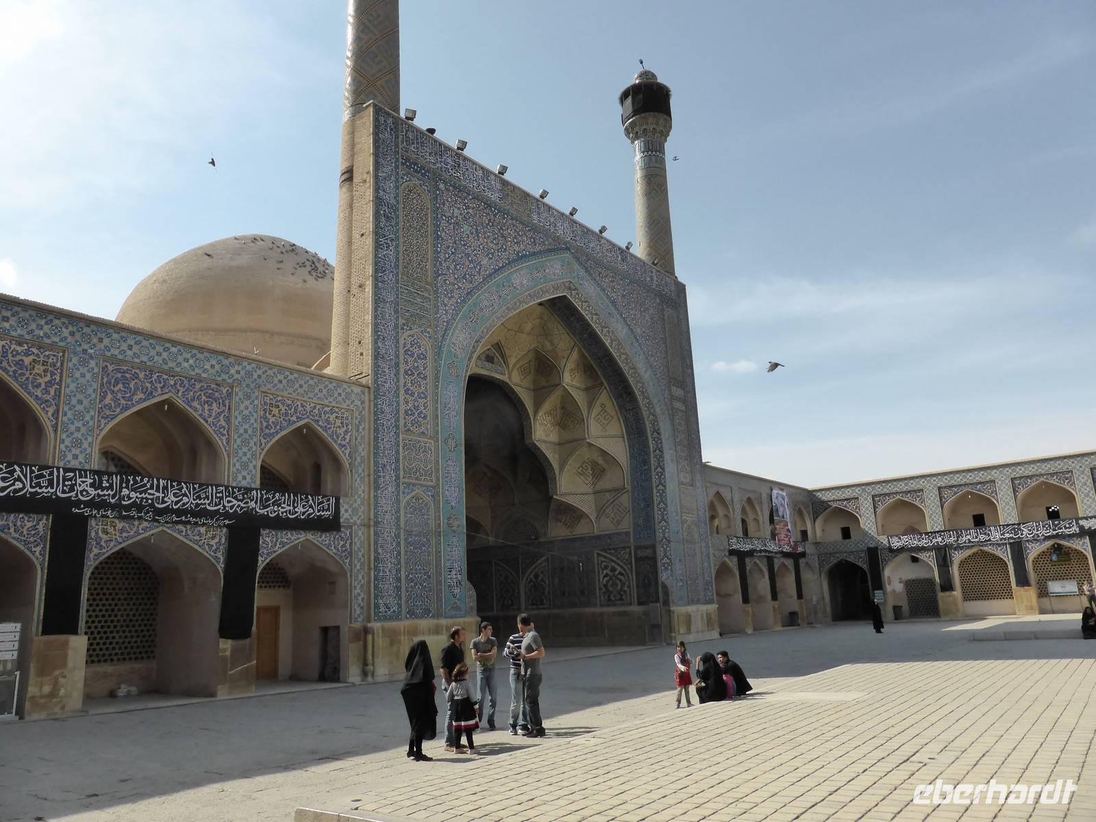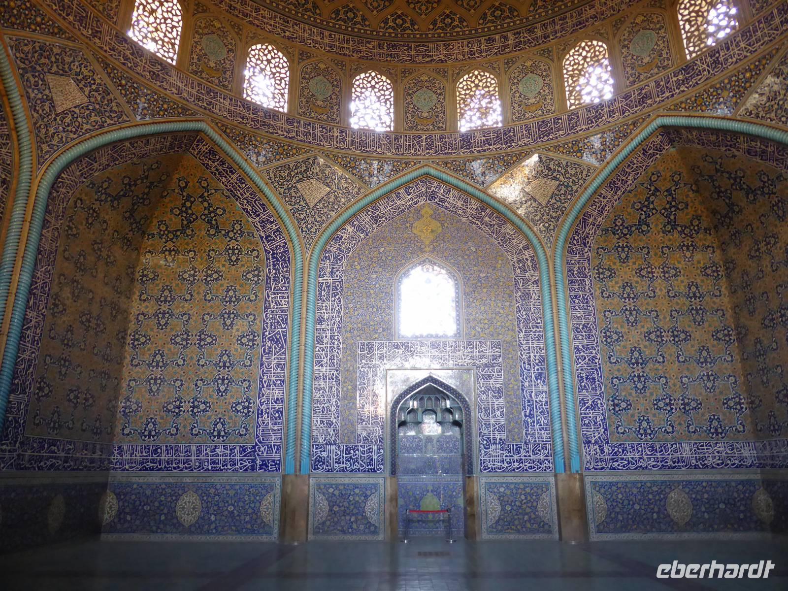 Vom 40-Säulen-Palast aus spazierten wir zum Maydan-e Naqsh-e Jahan-Platz bzw. auch Imam-Platz, dem Abbild der Welt. Er zählt sicherlich zu den schönsten der Welt. An den Platz schließt sich die Imam- Moschee an, welche wir als nächstes besichtigten. Leider war im Innenhof ein riesiges Zelt aufgebaut, in dem anlässlich der Feiertage täglich Veranstaltungen stattfanden. Trotz der eingeschränkten Blickwinkel waren wir von der Architektur und Akustik beeindruckt. Mitten unter der großen Kuppel der Moschee ist in Kopfhöhe die Akustik am besten. Ali nahm einen gefalteten Geldschein, hielt ihn an beiden Enden fest und öffnete ihn mit einem Ruck, indem er ihn blitzschnell auseinanderzog. Das war so laut als würde jemand vor uns in die Hände klatschen. Anschließend hatten wir noch etwas Freizeit in der Moschee, in der uns ein Mullah zur Begrüßung Bonbons reichte und sich mit uns über unsere Reise und Eindrücke unterhielt. Nach der Freizeit besuchten wir gemeinsam die Lotfullah-Moschee, die ehemalige Privatmoschee der safawidischen Königsfamilien oder auch Frauenmoschee genannt sowie den Ali Qapu Palast. Von einer gewaltigen Veranda im 3. Stock kann man den gesamten Imam-Platz fantastisch überschauen. Leider stand uns aufgrund von Bauarbeiten nicht die gesamte Fläche zur Verfügung, aber selbst vom zugänglichen Teil gelangen uns einmalige Fotoaufnahmen. Wir konnten uns leicht in die Lage versetzen, wie das Königshaus von hier oben aus die Polo-Spiele unten auf dem großen Platz verfolgen konnte.