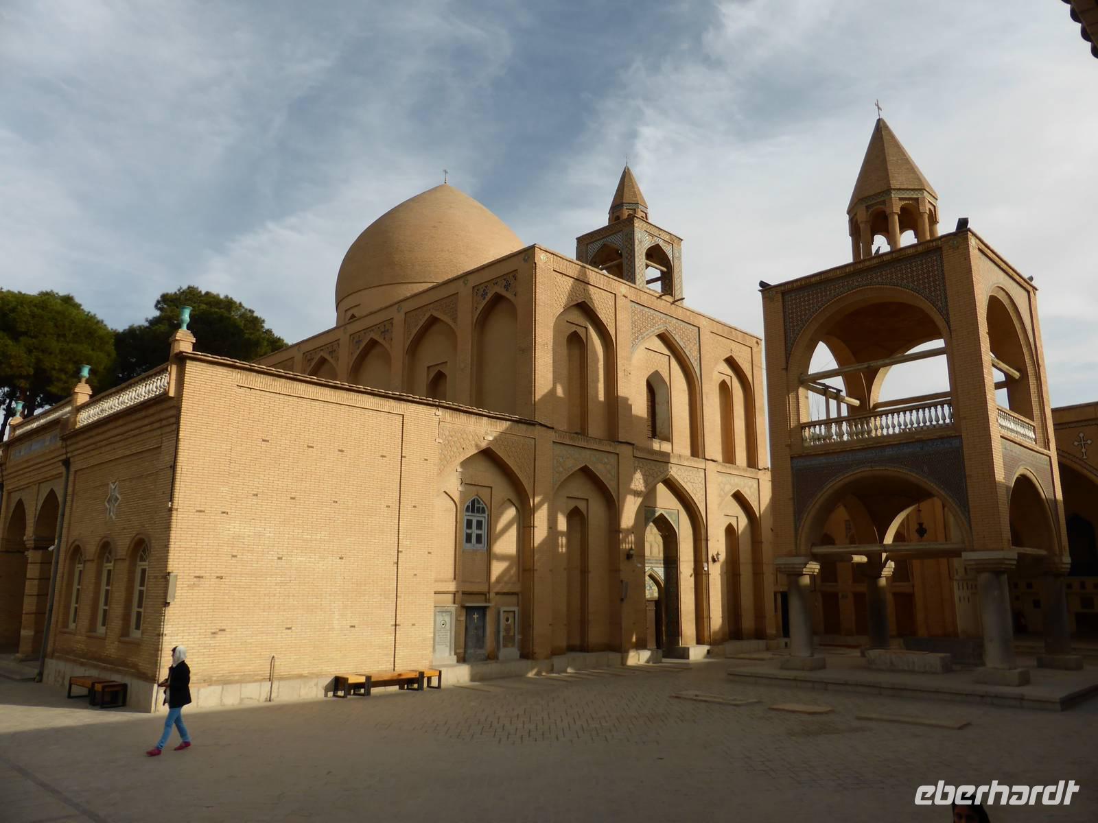 Nach der Besichtigung des Ali-Qupu-Palastes, welcher übersetzt passend „Hohe Pforte" heißt, fuhren wir zur Mittagspause zum Hotel zurück. Am Nachmittag ging es ins Armenier-Viertel in Isfahans Neustadt. Shah Abbas I. siedelte Anfang des 17. Jh. Armenier an, da er ihre Fertigkeiten als gute Handwerker und Künstler schätzte. Für die Ausübung ihres christlichen Glaubens räumte er ihnen weitgehende Privilegien ein. So war es den Armeniern möglich, im Jahre 1663 die Vank-Kathedrale fertig zu stellen. Sie ist bis heute die größte und bedeutendste Kirche in Djolfa, dem armenischen Viertel Isfahans. Im Inneren der Erlöser-Kirche, wie sie auch heißt, schockierten uns die Gemälde der Kreuzigung Christi, der Qualen der Hölle und des Jüngsten Gerichts aufgrund der dargestellten Gewalt und Grausamkeit. Von außen ist die Vank-Kathedrale nicht als solche zu erkennen, da sich ihr Kuppelbau mit persisch-byzantinischen Stilelementen weitgehend der Architektur der Moscheen angepasst hat. Interessant ist das dem Komplex angeschlossene Museum, welches die Geschichte der armenischen Christen bis hin zu ihrer Verfolgung im ersten Weltkrieg durch die Türken veranschaulicht.