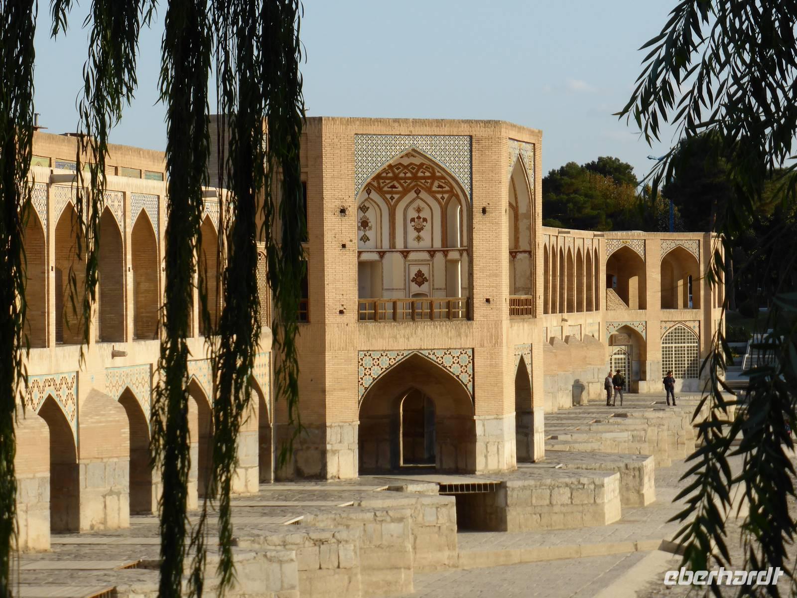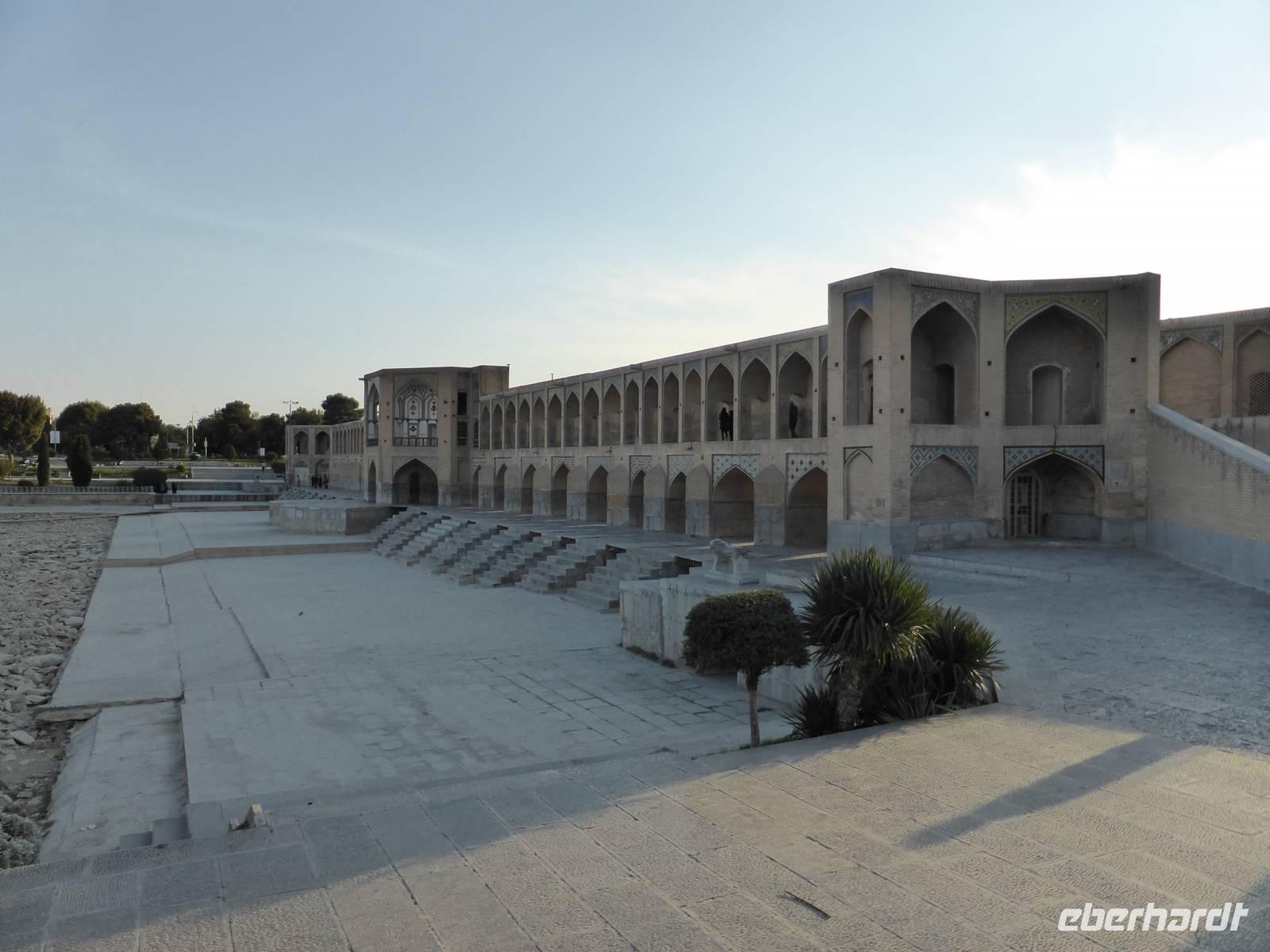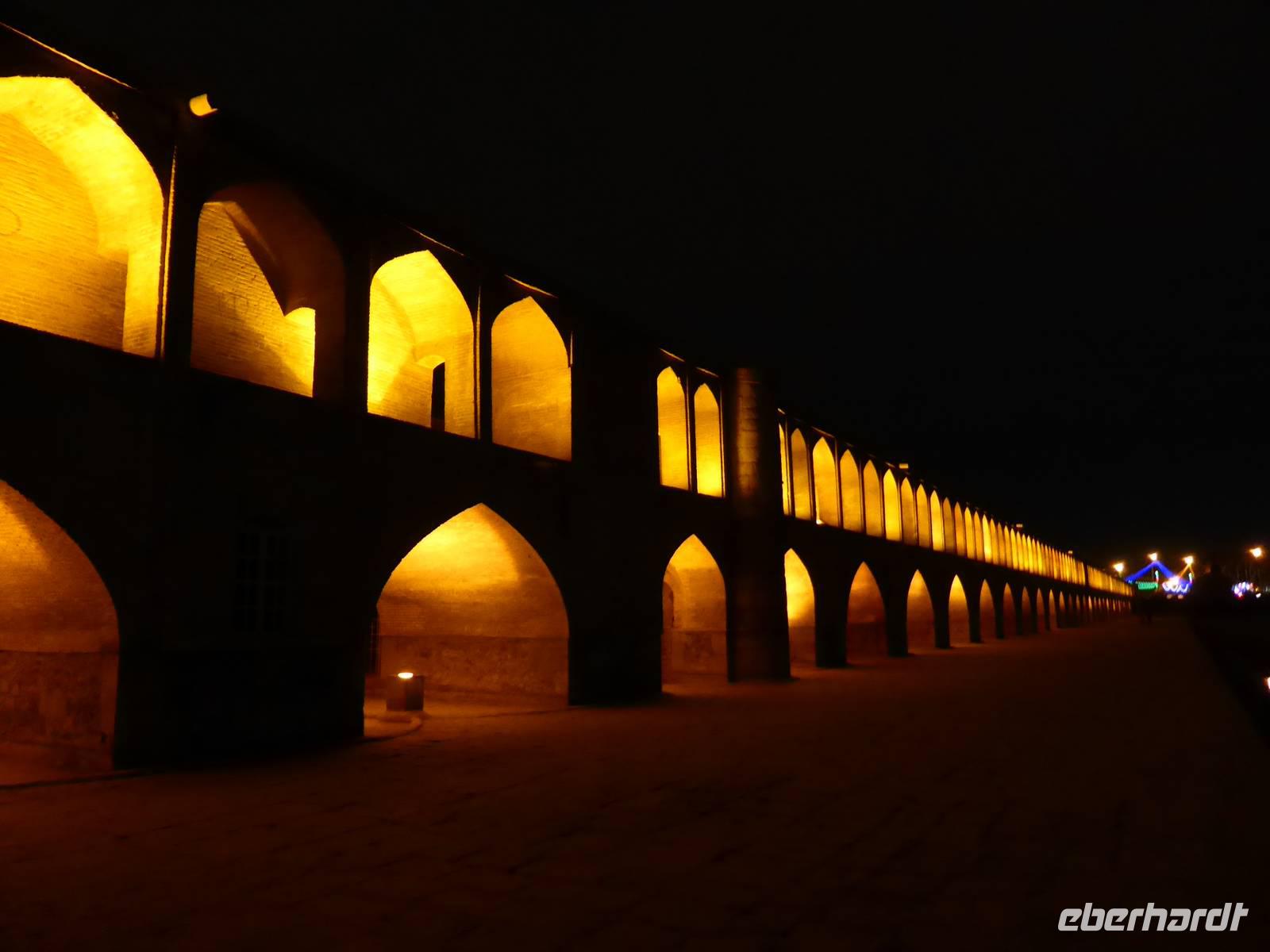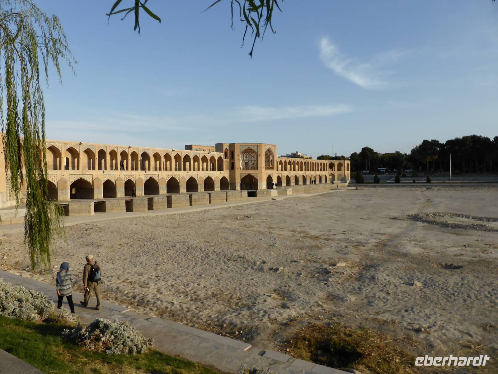Nach der Besichtigung ging es zum Imam-Platz, wo wir im Bastani Traditional Restaurant zum Mittagessen erwartet wurden. Es gab Hühnchen in Granatapfelsoße mit Walnuss oder Hühnchen mit Currysoße. Am Nachmittag fuhren wir dann zur Khaju-Brücke, welche ein weiteres Wahrzeichen Isfahans ist. Manchmal kann man bei der Brücke älteren Herren lauschen, die Gedichte und Lieder von Hafis vortragen. Noch vor einem Jahr besaß die Brücke durch ihre Schleusen auch die Funktion eines Dammes. Jetzt steht die Brücke im Trockenen, da das Wasser des Zayandehrud-Flusses zu einem großen Teil in die Wüstenstadt Yazd umgeleitet wurde. Für die Zukunft ist die Aufstauung eines Sees geplant, damit sich Isfahans Brücken wieder im Wasser spiegeln können. Von der Khaju-Brücke fuhren wir anschließend zur Si-o-se Pol-Brücke, welche auch 33 Bögen-Brücke genannt wird. Anschließend ging es wieder zum Imam-Platz zurück und hatten Zeit für individuelle Einkäufe und Besichtigungen. Der Basar, welcher in Gewölbegängen die angrenzenden Häuser des Platzes umschließt, scheint unendlich zu sein. Noch lange klang das Schlagen der Kupfer- und Blechschmiede in unseren Ohren und der Geruch der Gewürzläden belebte unsere Sinne. Am Abend fuhren wir dann zum Inland-Flughafen Isfahan-Mehrabad. Leider hatte unser Flug ca. eine Stunde Verspätung, so dass wir lange im Flughafengebäude warten mussten. In Teheran wurden wir vom Flughafen abgeholt und zum Hotel gebracht.