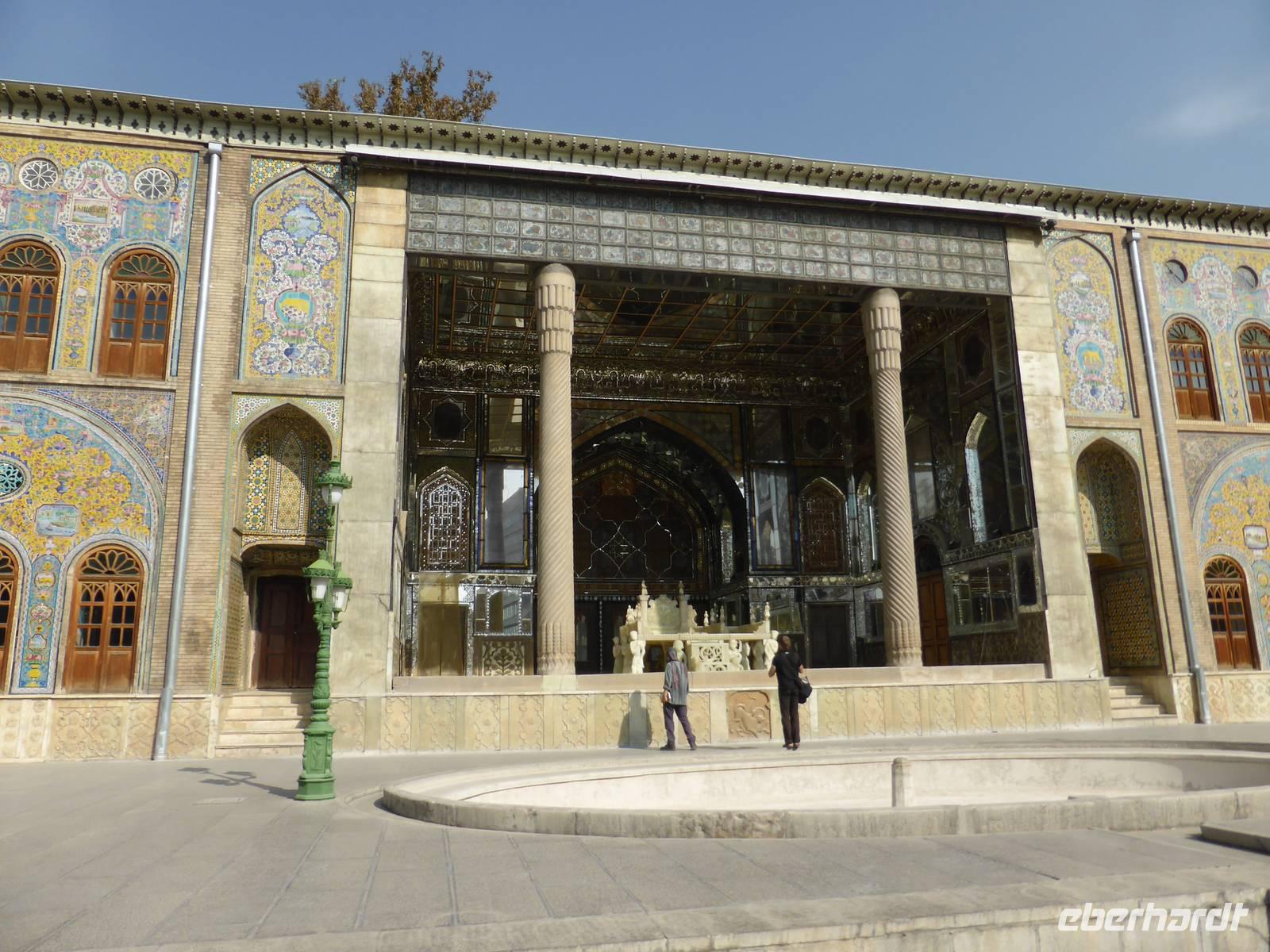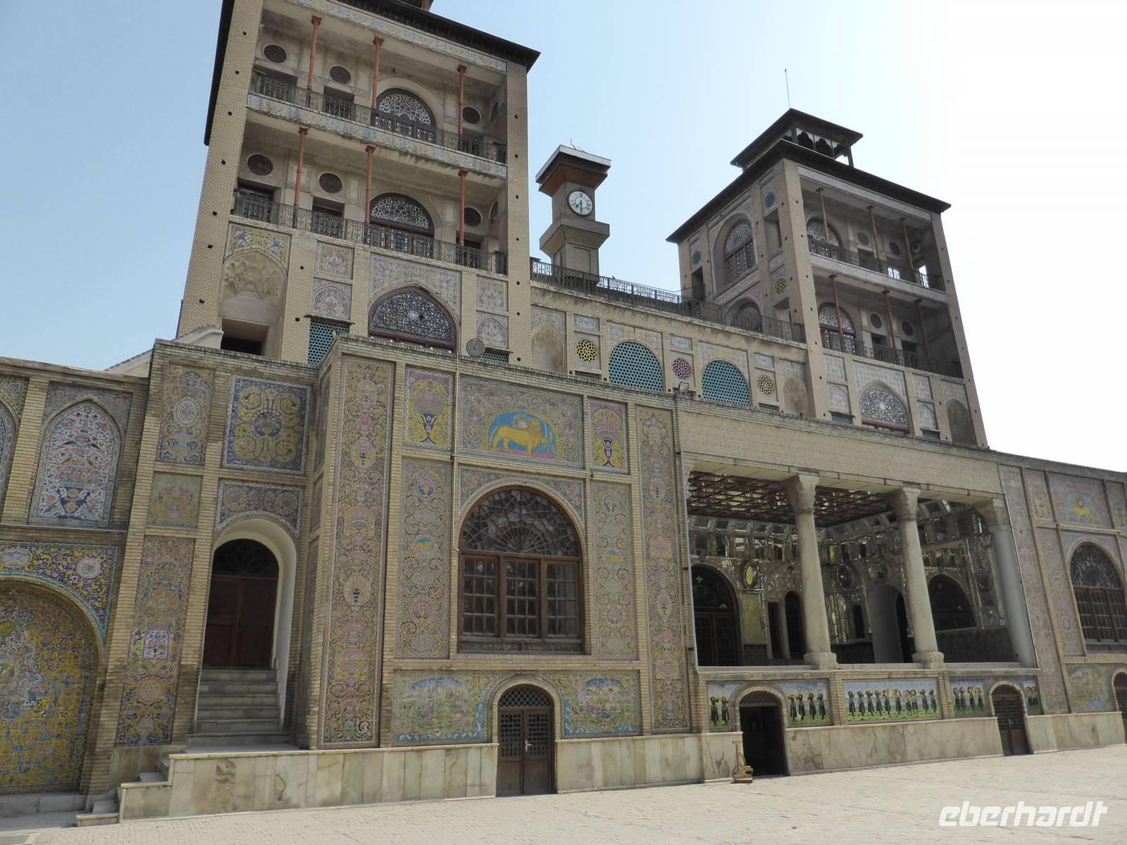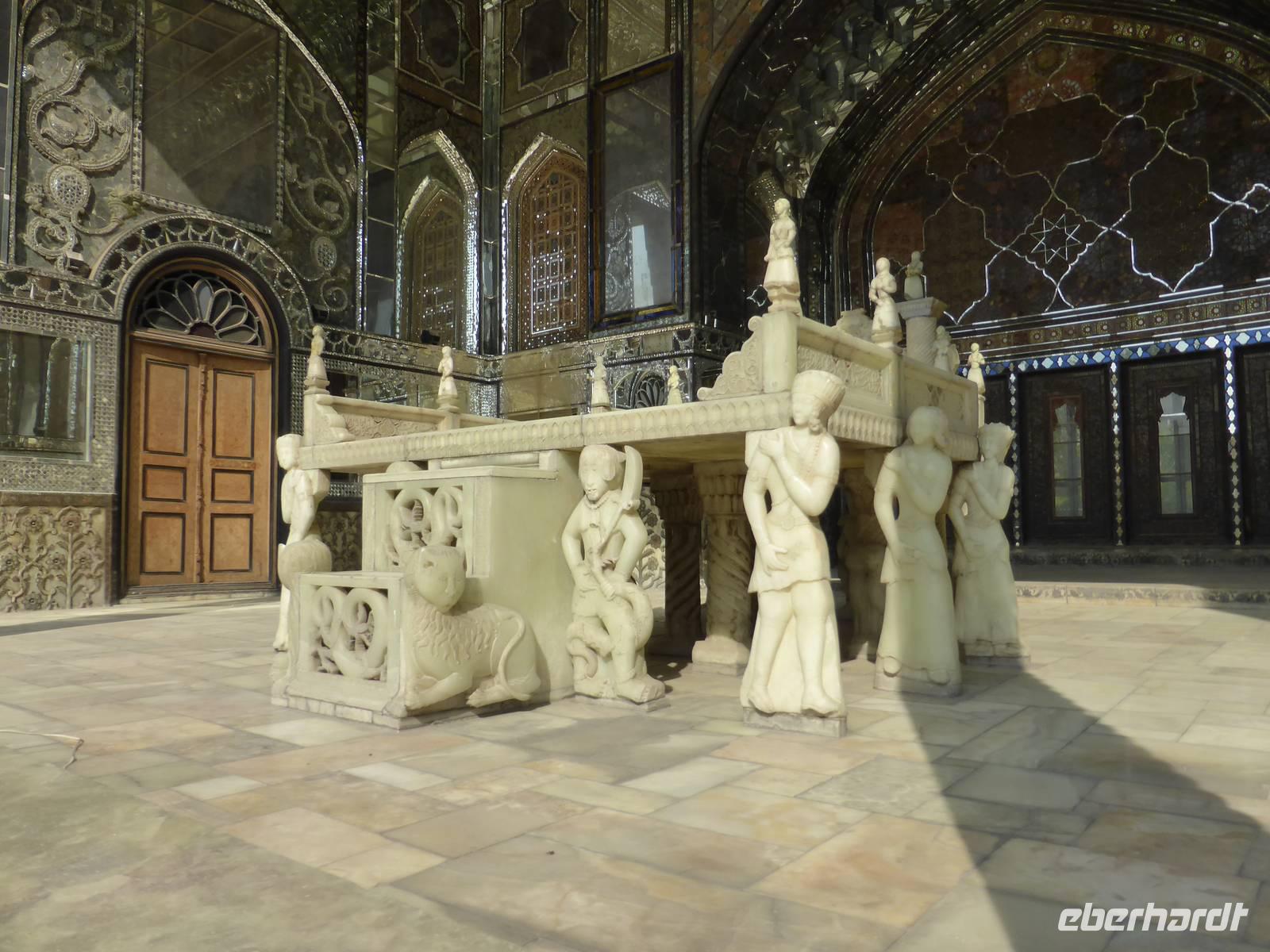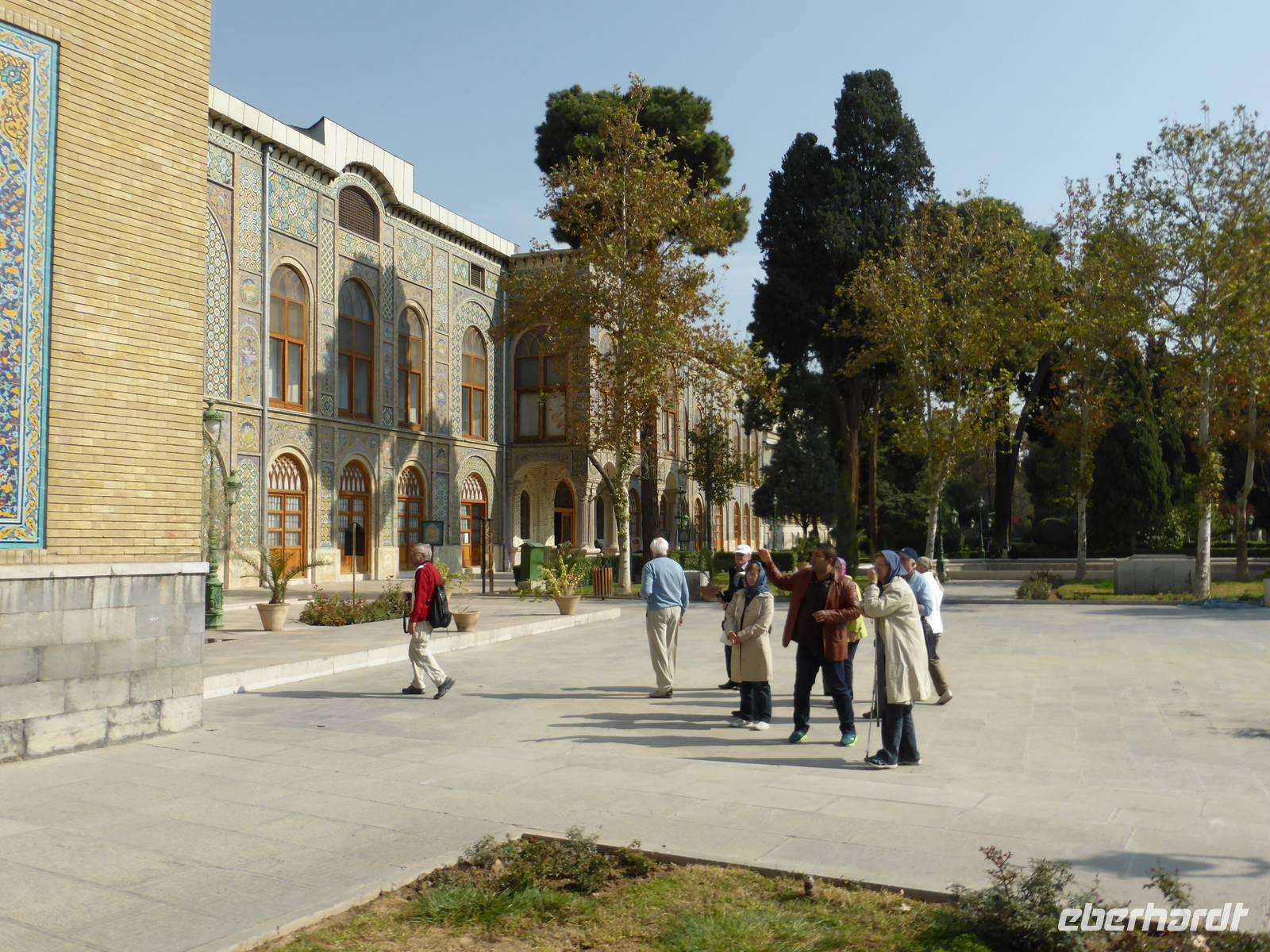 Nach einem späten Frühstück fuhren wir zum Golestan-Palast. Der Baubeginn der Palastanlage geht auf die Zeit Shah Abbas I. (1588-1629) zurück. Spätere Herrscher erweiterten die Anlage. Die letzten Krönungen der Pahlavi-Shahs fanden hier 1925 und 1967 statt. Besonders eindrucksvoll waren für uns der Marmorthron und die Residenz der qajarischen Könige im Empfangspalast (Emarat-e Salam). An die sehr großzügig angelegte Anlage schließen sich heute leider moderne Bürogebäude der 70er und 80er Jahre an, welche den Gesamteindruck etwas stören. Vom Golestan-Palast gingen wir dann zur U-Bahnstation der Linie 2 und fuhren mit dieser eine Haltestelle. Es war ein Erlebnis! Anschließend holte uns unser Bus ab und brachte uns zum Teppichmuseum, in dem Teppiche aus den verschiedenen, für die Teppichherstellung bekannten Regionen ausgestellt sind.