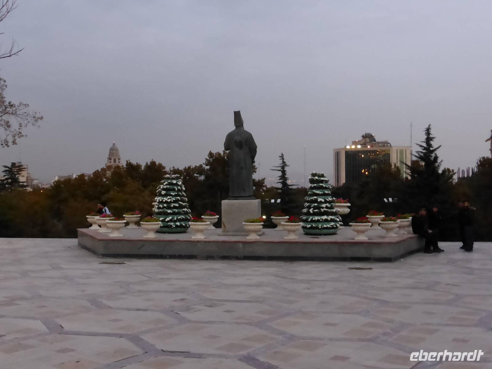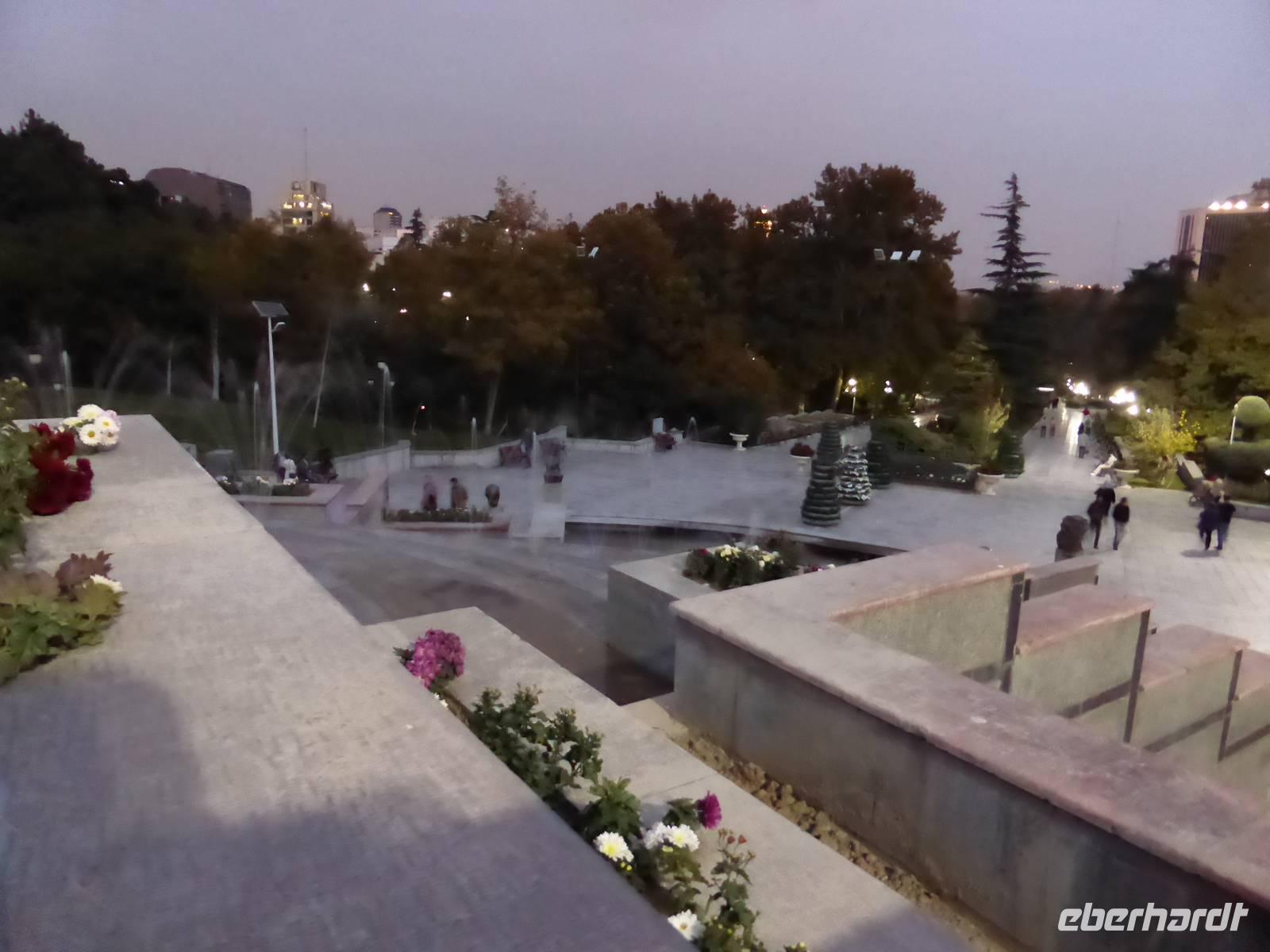 Vom Museum ging es zum Reza Abbasi-Museum, das leider noch immer geschlossen ist, und weiter zum „Zeytoon India-Classic"-Restaurant, wo wir unser gemeinsames Abschiedsessen einnahmen. Es gab eine große Auswahl an warmen und kalten Speisen, die sehr lecker schmeckten. Nach dem Essen wollten wir außerplanmäßig die Saadabad-Palastanlage besuchen, aber aufgrund des Ashura-Trauerfestes schloss auch diese Einrichtung eher als sonst üblich. Stattdessen gingen wir zum Abschluss in den Teheraner Nationalpark. Den schönsten Blick hatten wir am kleinen See vor dem Denkmal Amir Kabirs, dessen tragische Geschichte uns Ali bereits im Fin-Garten in Kashan erzählt hatte. Der Bus brachte uns danach ins Hotel zurück. Ali hatte noch eine Überraschung vorbereitet! Jeder von uns bekam ein hübsch verpacktes Souvenir geschenkt! Das hatten wir nicht erwartet! Gegen 23.00 Uhr wurden wir dann vom Hotel abgeholt und fuhren zum Flughafen.