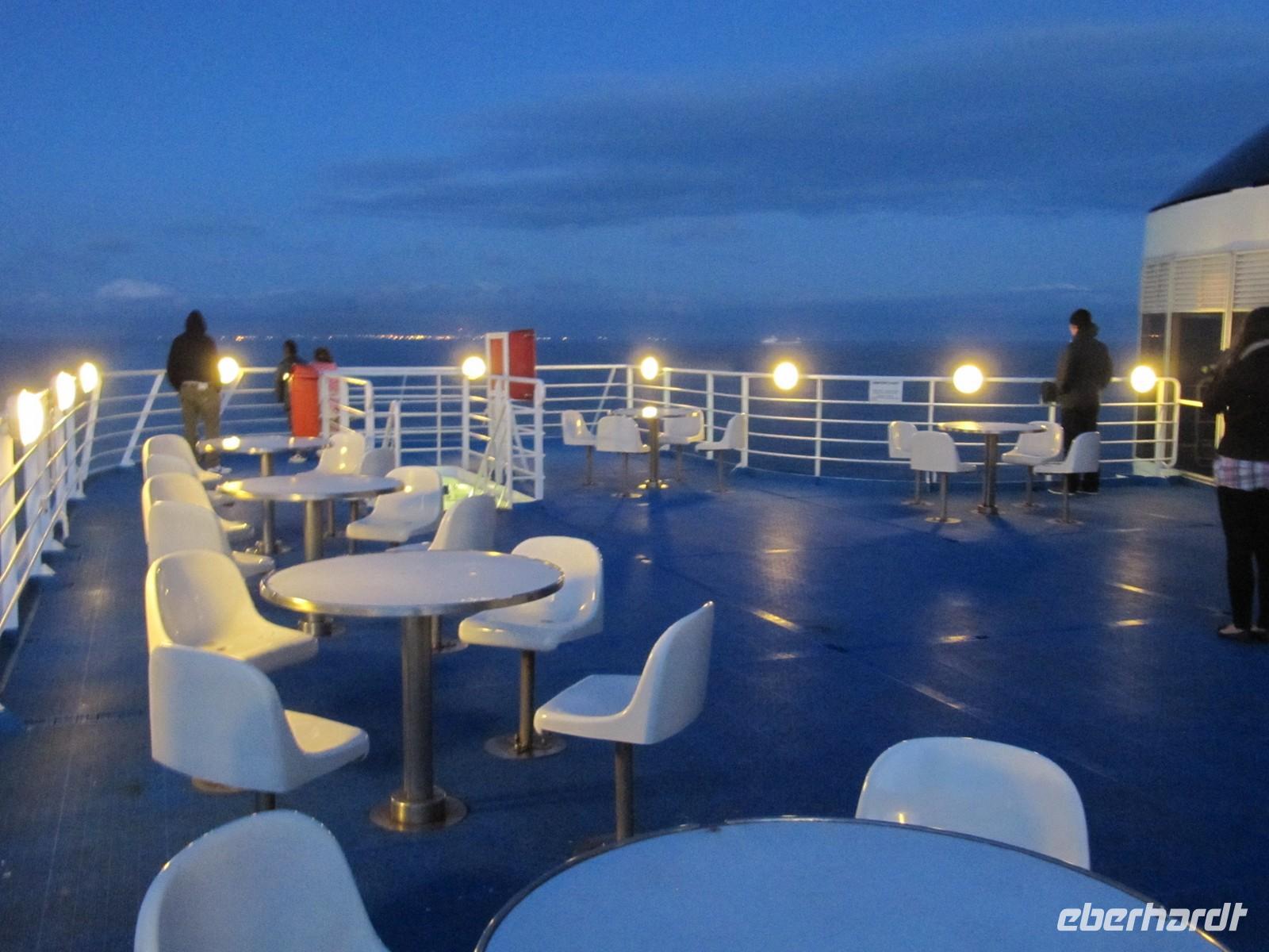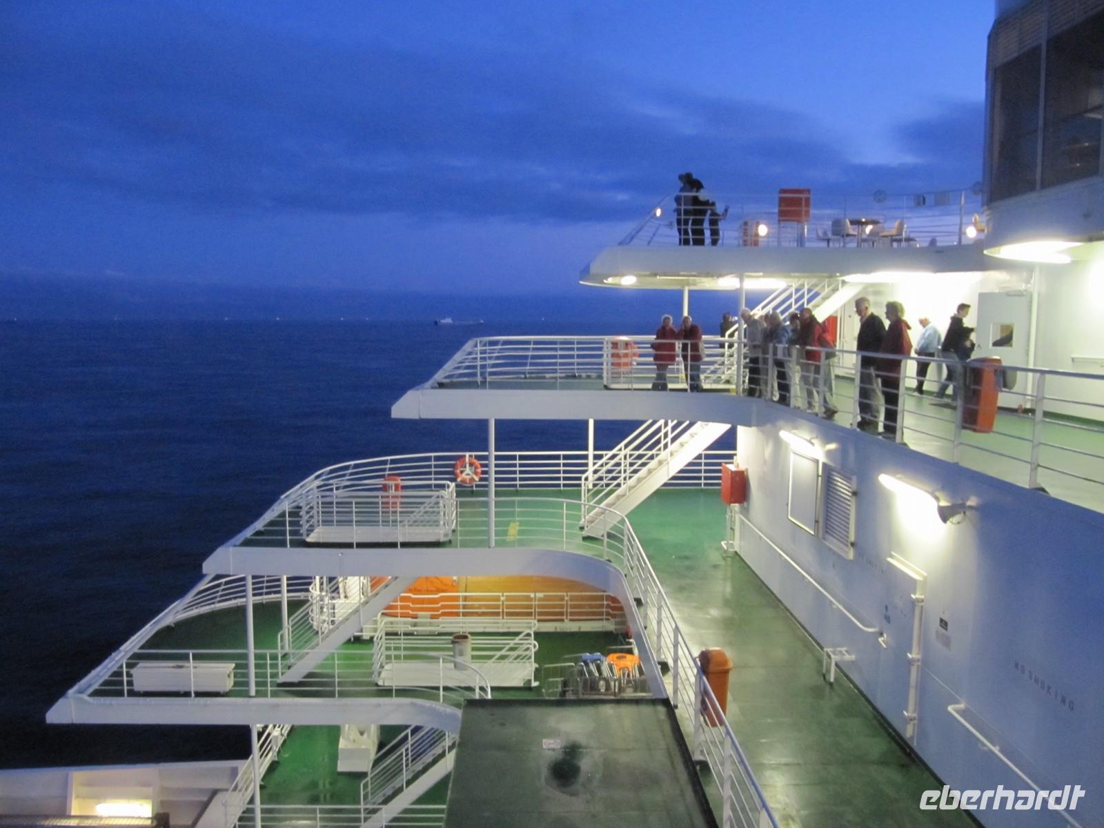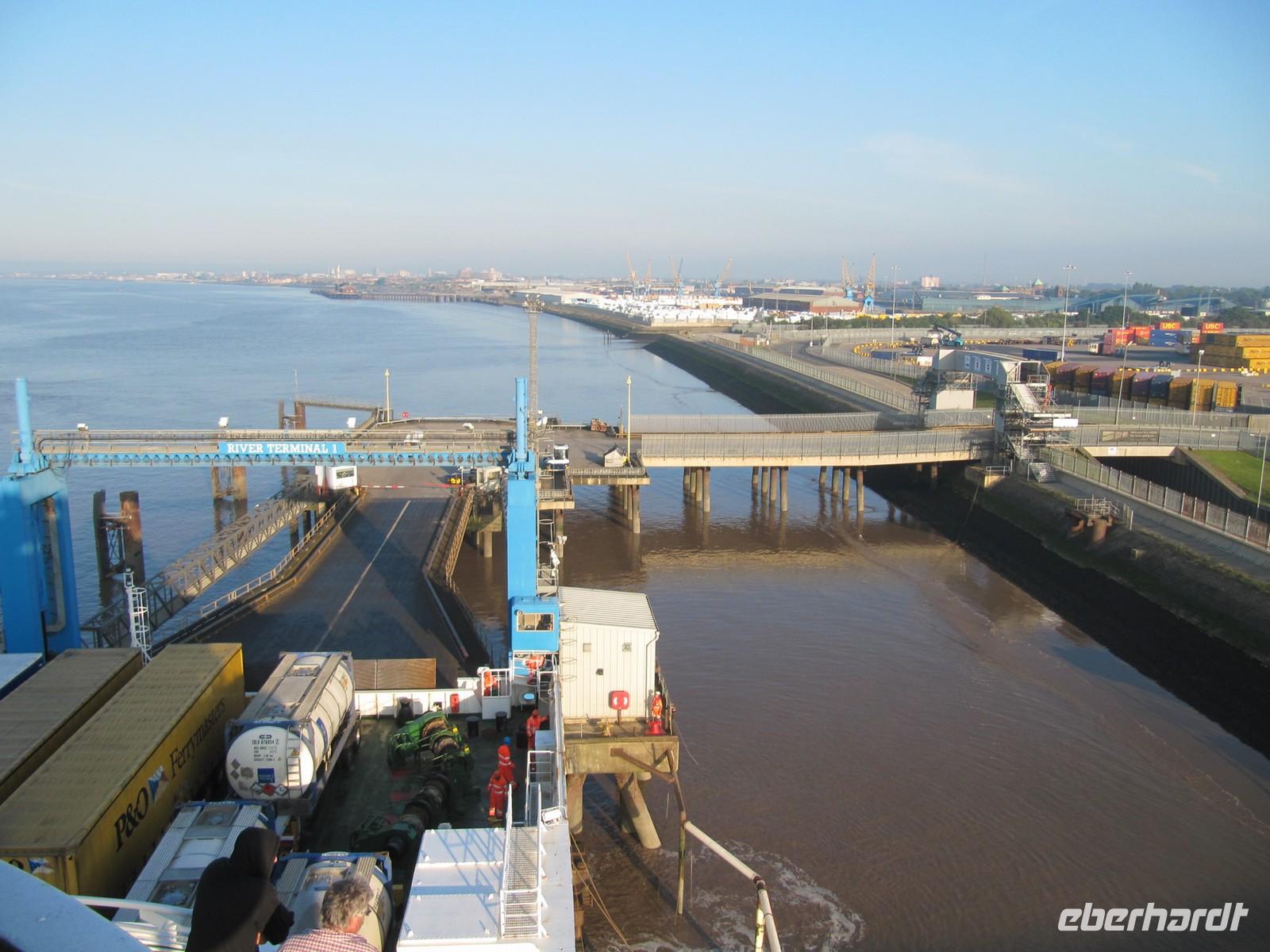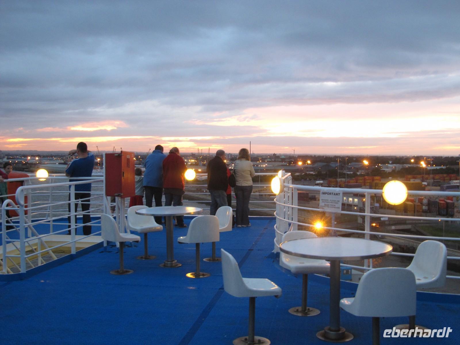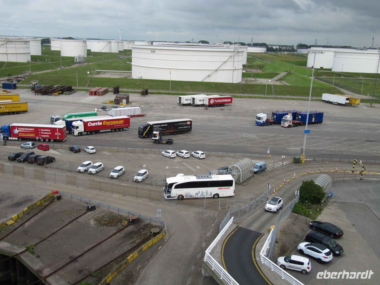 Gäste zusteigen zu lassen. In Teufelstal kam dann unser Fahrer Lutz, um uns die nächsten Tage durch Deutschland, die Niederlande, Großbritannien und Irland zu chauffieren. Die Fahrt führte uns über Eisenach zum Rasthof Reinhardshain, wo noch einige Gäste von Eberhardt-Reisen Pforzheim zustiegen. Weiter ging es über Siegen durch das Ruhrgebiet und Arnheim zum Fährhafen nach Rotterdam. Ohne Stau erreichten wir vor 18 Uhr unsere Fähre und konnten ein ausgiebiges Abendessen an Bord genießen. Vom Heck beobachteten wir die Ausfahrt aus dem Euro-Port Rotterdam und über Nacht brachte uns die Fähre gemütlich nach Hull in England.