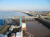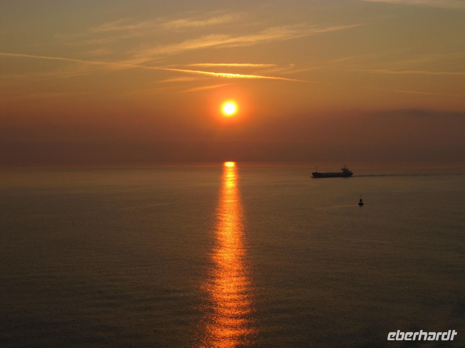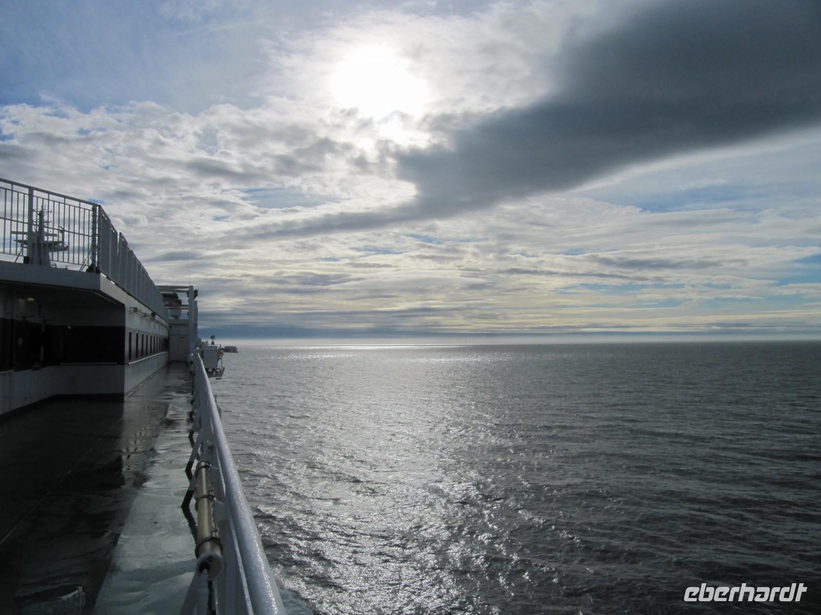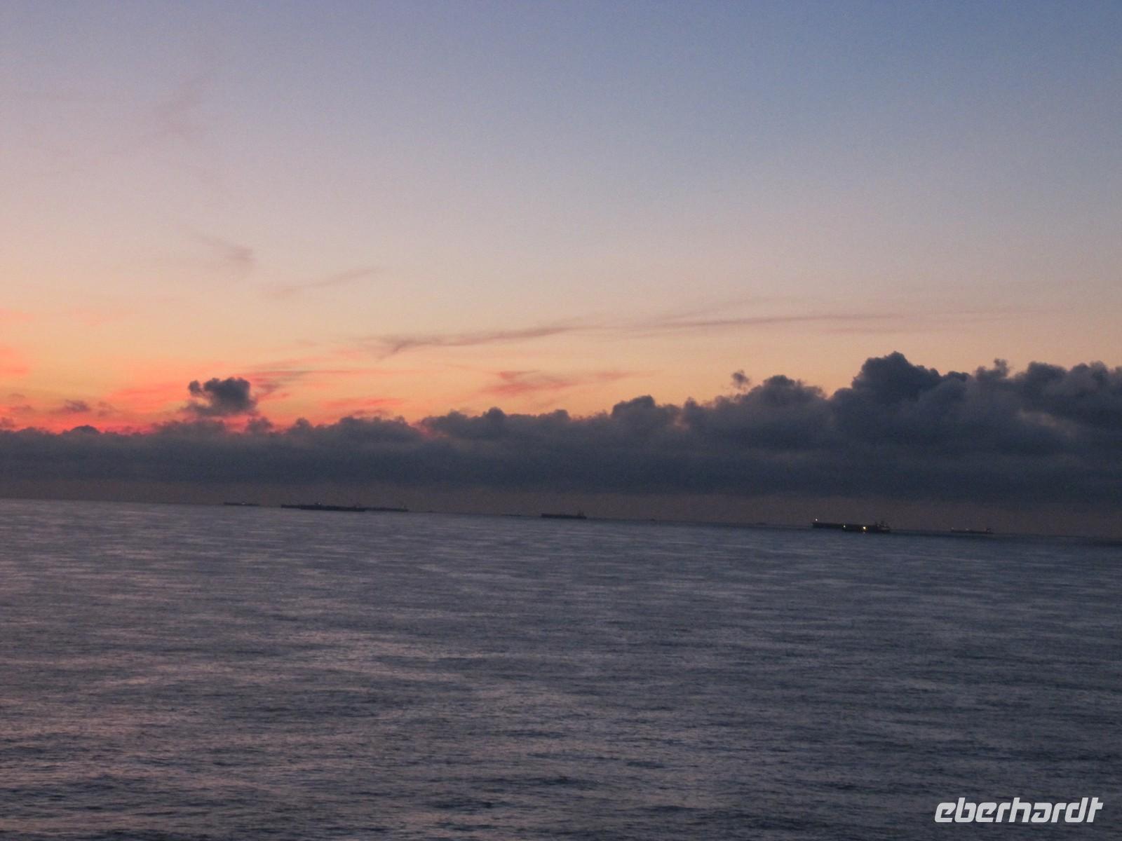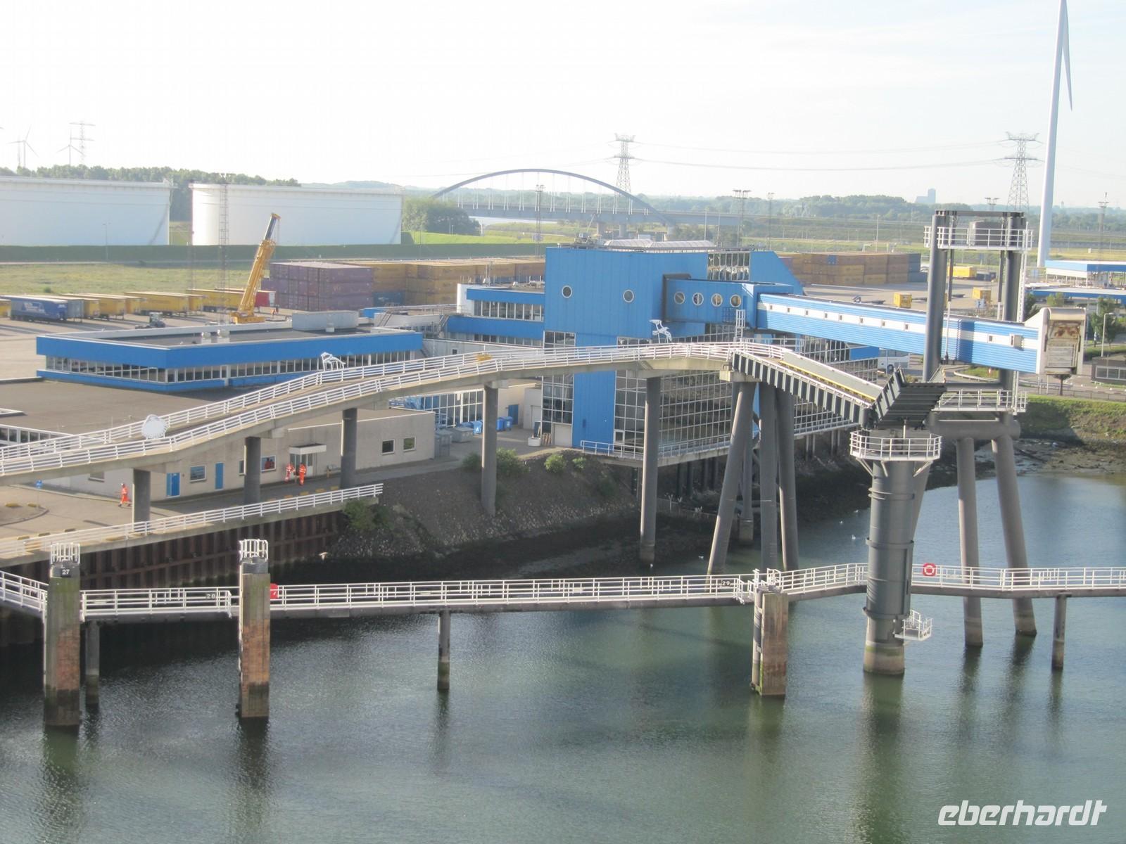 Gäste zusteigen zu lassen. In Teufelstal kam dann unser Fahrer Lutz, um uns die nächsten Tage durch Deutschland, die Niederlande, Großbritannien und Irland zu chauffieren. Die Fahrt führte uns über Eisenach zum Rasthof Reinhardshain, wo noch einige Gäste von Eberhardt-Reisen Pforzheim zustiegen. Weiter ging es über Siegen durch das Ruhrgebiet und Arnheim zum Fährhafen nach Rotterdam. Ohne Stau erreichten wir vor 18 Uhr unsere Fähre und konnten ein ausgiebiges Abendessen an Bord genießen. Vom Heck beobachteten wir die Ausfahrt aus dem Euro-Port Rotterdam und über Nacht brachte uns die Fähre gemütlich nach Hull in England.