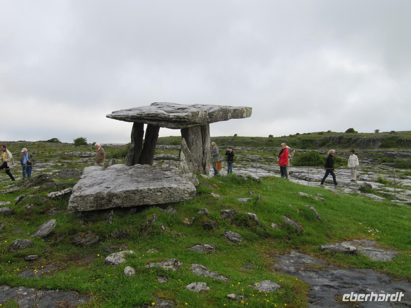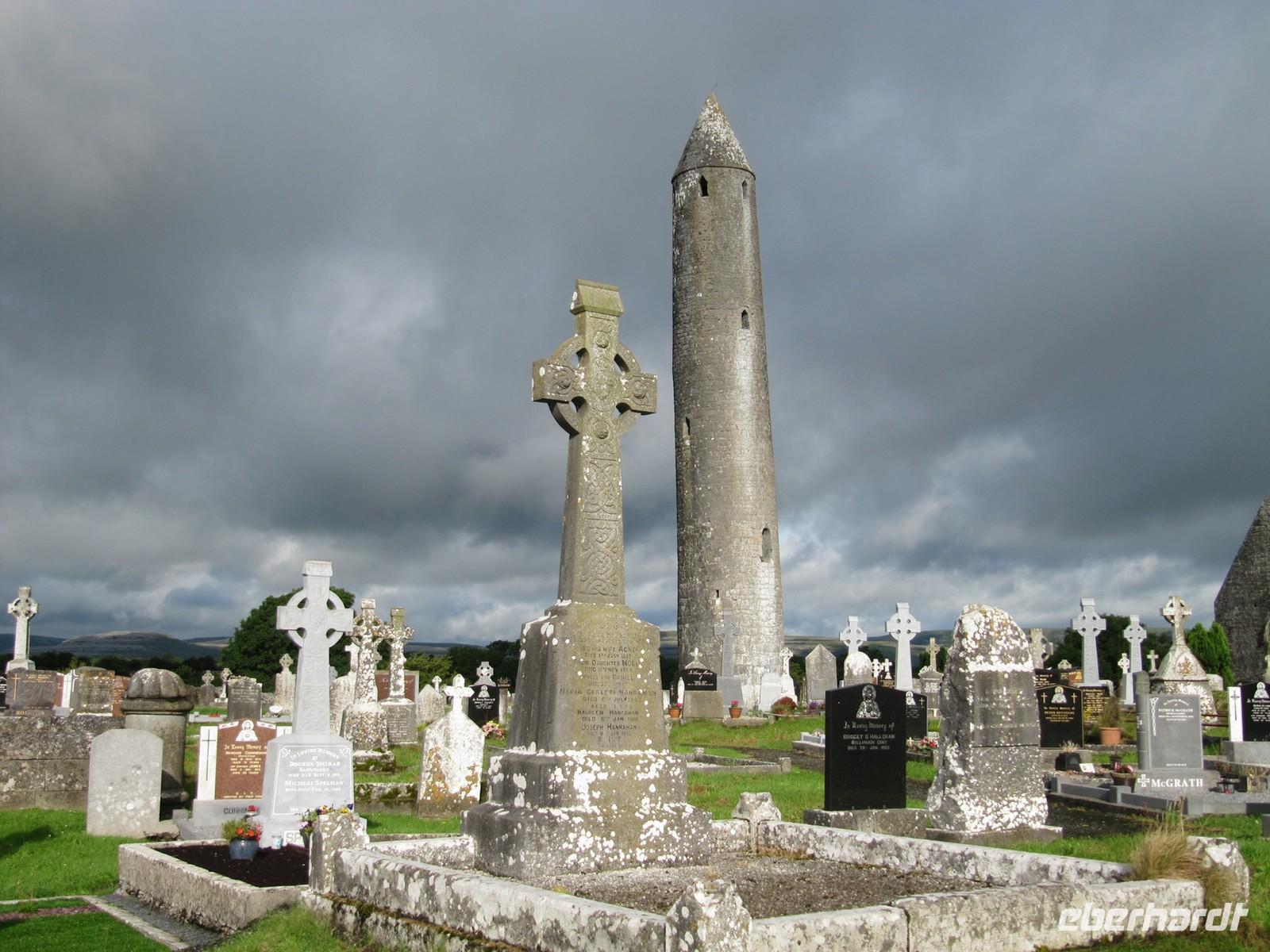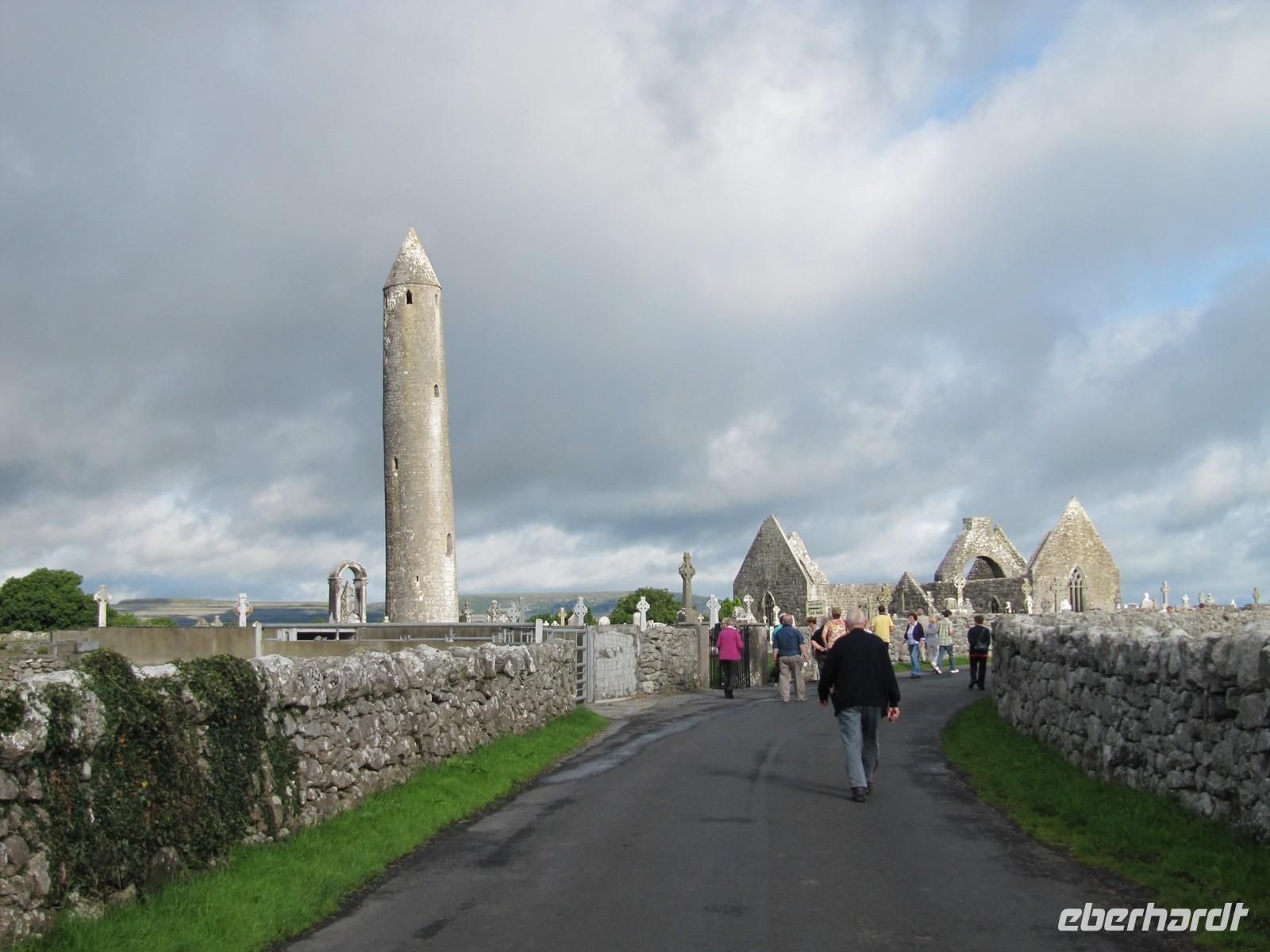 Tag 6 Leider mußten wir heute unseren geplanten Besuch beim Torfstecher absagen. Schade aber es hatte die ganze Nacht geregnet, besser gegossen! So fuhren wir zuerst nach Kilmacduagh, zur Klosteranlage vom Heiligen Colman MacDuagh, wo wir den schiefen Rundturm und die Ruinen mehrerer Kirchen bestaunten. Unser Bus brachte uns weiter durch die karge eigenartige Karstlandschaft des Burren. Wir schauten uns Irlands schönstes Megalithgrab, den Poulnabrone Dolmen an. Sein Foto darf in keinem Reisebericht über Irland fehlen. Leider überraschte uns ein Regenschauer. Aber so schnell, wie der Regen in Irland kommt, ist er meist auch wieder verschwunden. Es wurde doch noch ein schöner Tag, obwohl der Wetterbericht nur Regen vorausgesagt hatte. Wir wählten den Weg über die Küstenstraße um die Klippen von Black Head. Eine gewaltige Steinwüste! Dann standen wir vor den Klippen von Moher, die bis zu 200 m zum Meer steil abfallen. Auf unserem Weg in die Grafschaft Kerry mußten wir den Shannon, den längsten und wasserreichsten Fluss Irlands, überqueren. Die Autofähre brachte uns bequem über die Flußmündung von Killimer nach Tarbert. In Killarney bezogen wir für drei Nächte das Oaks Hotel.