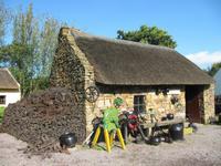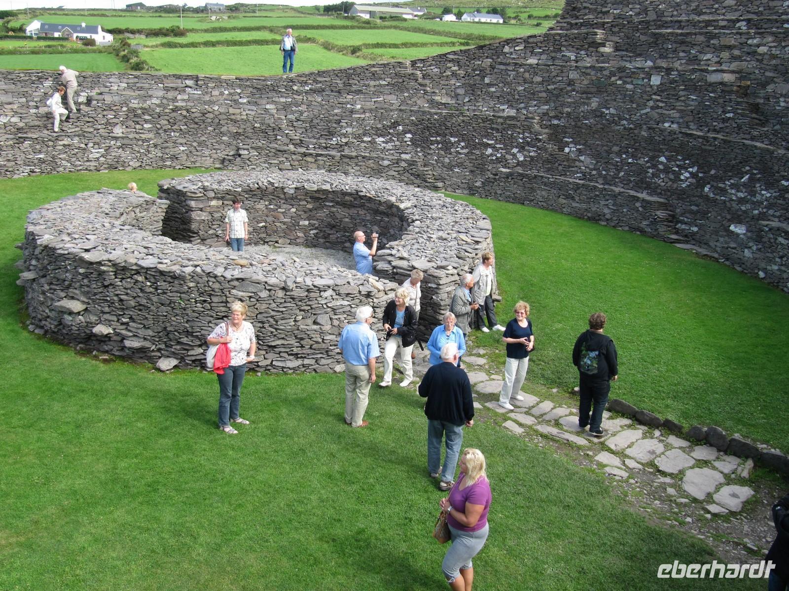 Jan erzählte uns viel über Irland. Da wir das Torfstechen absagen mußten, gab Petra einen Besuch im Torfmuseum vom Red Fox aus und wir genehmigten uns noch einen Irish Coffee. Ein Fotostopp zur Dingle Halbinsel wurde von 2 Künstlern auf der Harfe versüßt, so dass wir noch etwas länger verweilten! Den geplanten Stopp beim Schäfer Brandon haben wir dann abgesagt. Es waren zu viele Busse da und wir hätten fast eine halbe Stunde warten müssen. Jan hatte eine Alternative für den Nachmittag und so war noch Zeit, für das Ringfort Cahergall bei Cahirsirveen. Ein Fotostopp in Waterville mit Charlie Chaplin, der hier oft seinem Urlaub verbrachte, durfte nicht fehlen.