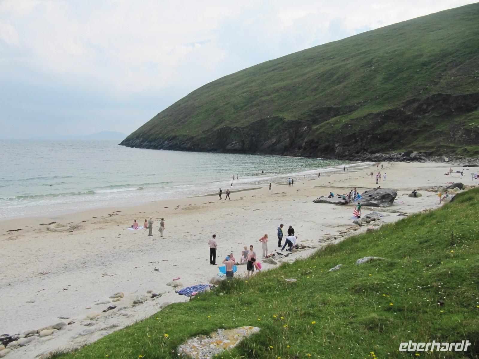 Nach der Besichtigung von Ceide Fields führte uns die Fahrt quer durch Mayo, zur Achill Island, Irlands größter Insel! Wir machten am herrlichen Strand von Keem Bay einen längeren Stopp. Hier befinden sich Europas höchste Klippen. Einige Gäste lockte das Meer zum Baden. Durch die einsame Landschaft ging es wieder zurück zum Hotel nach Ballina, nicht ohne vorher noch dem Lough Conn, dem größten See im County Mayo, einen Besuch abzustatten.