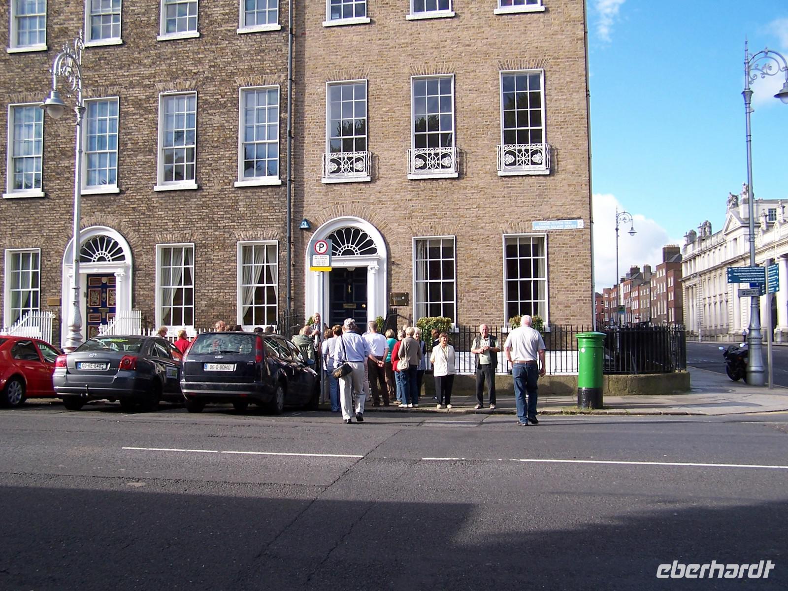 Nach der Passkontrolle und dem Einsteigen in unseren Bus mussten wir uns mit unserer Fährgesellschaft betreffs der Passage über die Irische See in Verbindung setzen. Uns wurde mitgeteilt, dass auf Grund der stürmischen See, die von uns gebuchte Schnellfähre voraussichtlich nicht fahren wird. Das bedeutete keine Zeit für Besichtigungen auf der Fahrt zum Fährhafen Holyhead, aber auch ein sicheres und zeitigeres Eintreffen in Dublin. Auf der Fahrt durch Wales wurden wir in einen Unfall mit leichtem Blechschaden verwickelt. Glücklicherweise erreichten wir unsere Fähre trotzdem rechtzeitig. Die Fluggäste unserer Gruppe waren bereits gegen Mittag auf dem Dubliner Flughafen gelandet und von unserer örtlichen Agentur abgeholt worden. Durch die Umbuchung der Fähre und die zeitigere Ankunft am Hotel bot sich nun die Gelegenheit, gemeinsam das Abendessen im Hotel einzunehmen. Auf diese Weise lernten sich unsere Irland Bus- und Fluggäste bereits am ersten Abend im Hotel kennen.