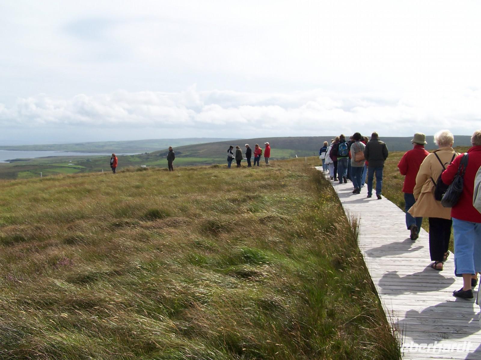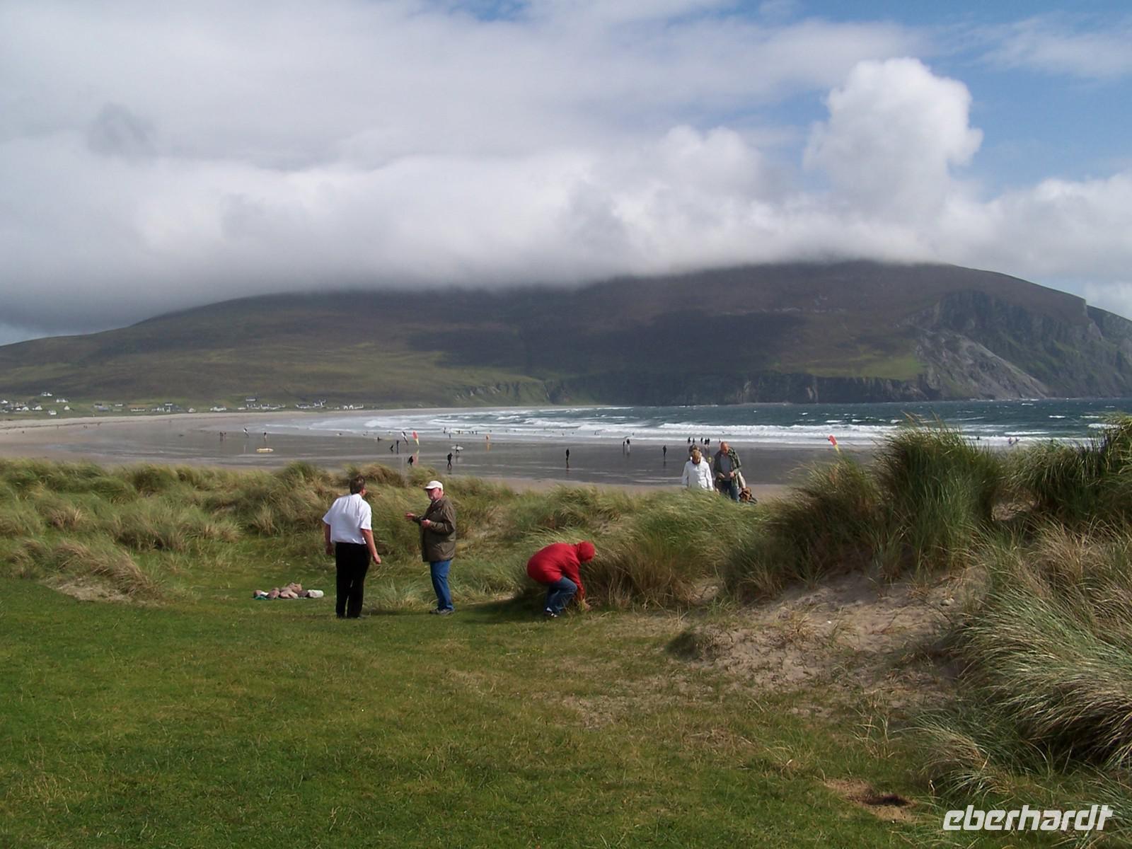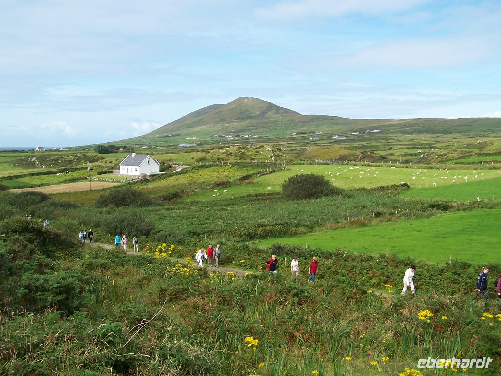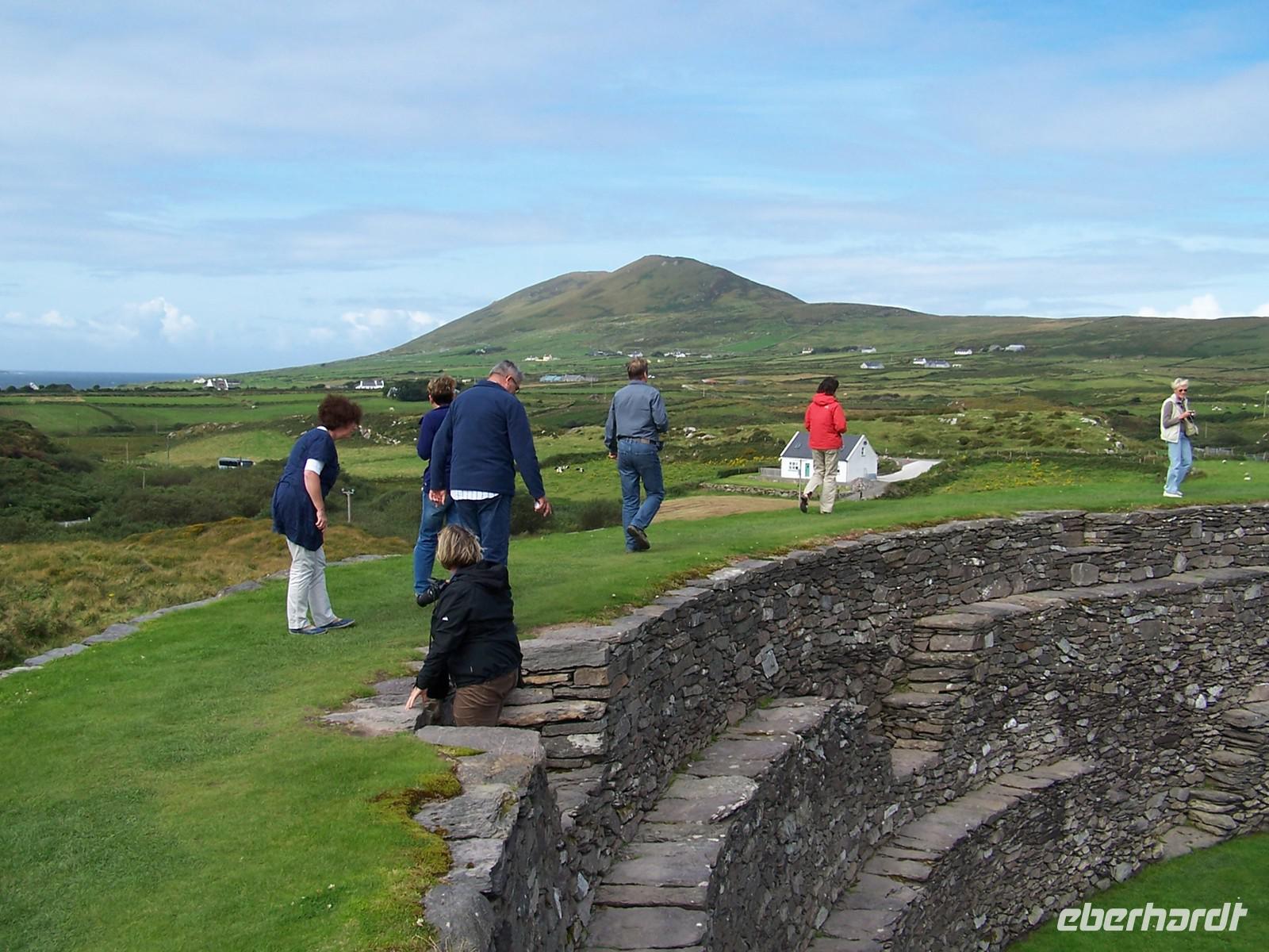 Von Killala aus fuhren wir durch eine baumlose und moorige Landschaft zu den Cèide Fields. Cèide Fields ist die flächenmäßig größte Ausgrabungsstätte der Jungsteinzeit weltweit. Bereits vor 5000 Jahren wurden hier Wälder gerodet und ummauerte Weideflächen angelegt. Bei einer Führung erhielten wir Einblicke in die damalige Zeit. Von Cèide Fields ging es auf die Insel Achill Island, auf der Heinrich Böll in den 50er Jahren mit seiner Familie lebte. In Keel besuchten wir den wohl schönsten Ort der Insel mit seinem kilometerlangen weißen Sandstrand. Von Keel aus fuhren wir über eine gewundene schmale Straße bis zur Bucht von Keem. Hier gibt es einen kleinen Strand mit einem atemberaubenden Blick auf das Meer und die felsige Landschaft. Auf unserer Rückfahrt zum Festland wählten wir die Strecke über Doogort, dem Aufenthaltsort Heinrich Bölls. Über den Achill Sound ging es dann wieder auf das Festland und über Newport zurück nach Ballina.