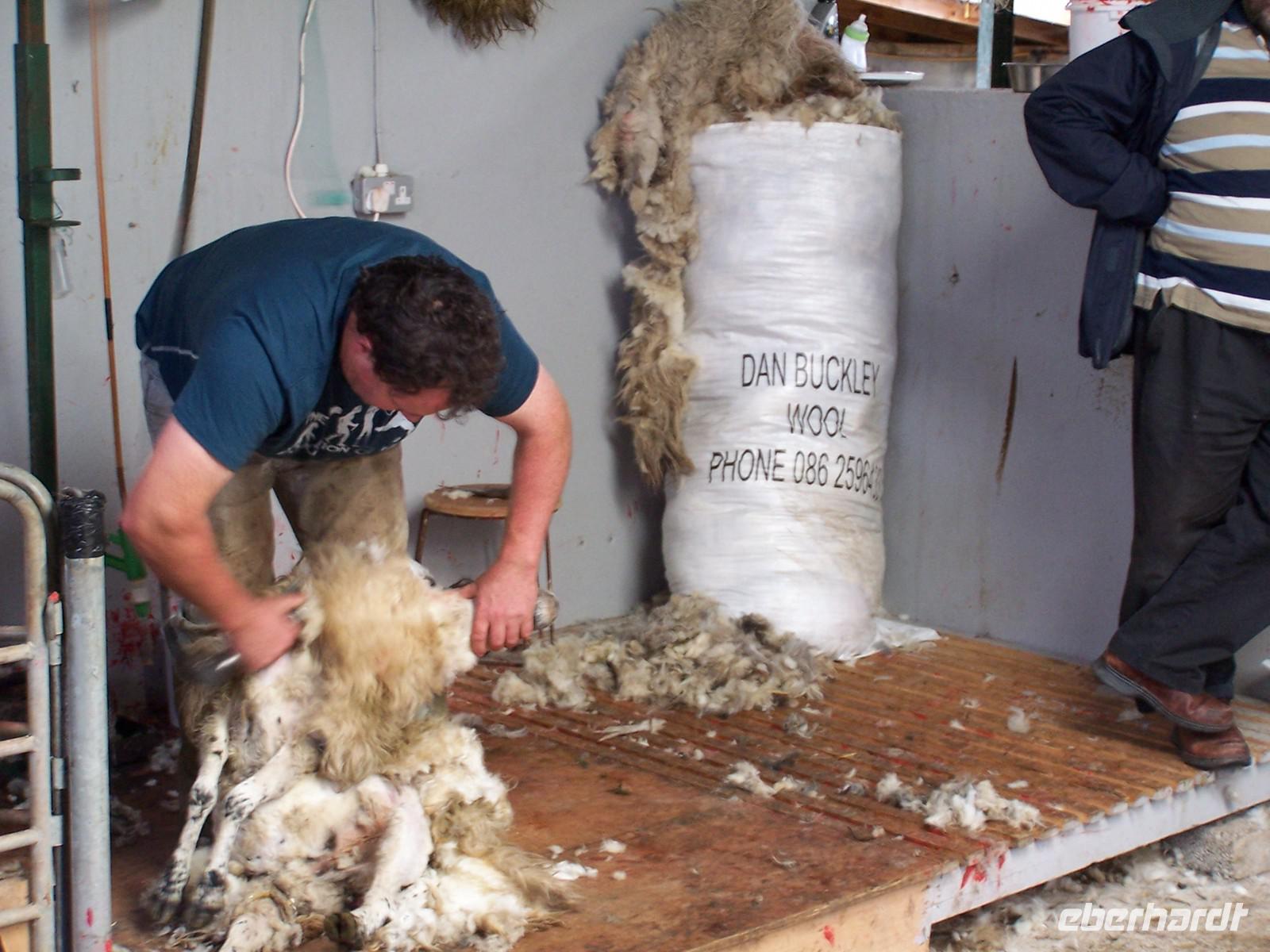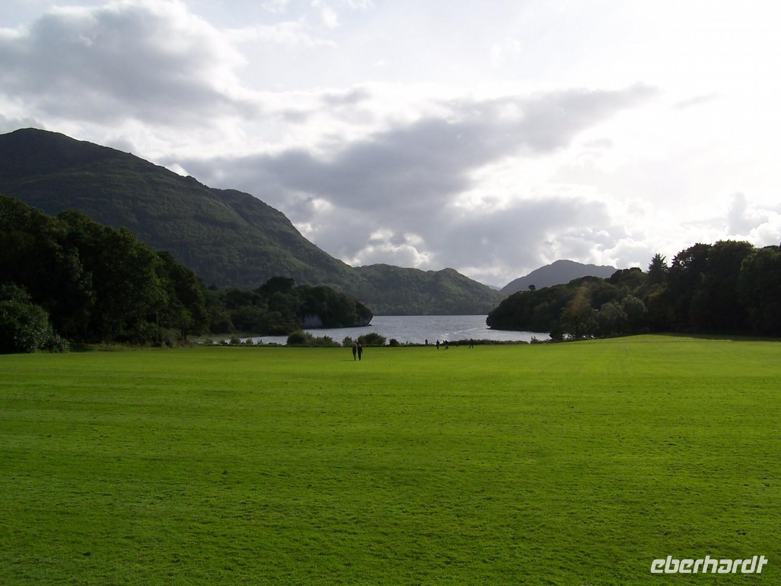 Wir begannen unsere Tagesfahrt auf dem Ring of Kerry mit einem Besuch bei King Puck in Killorglin. Jedes Jahr wird Anfang August ein Ziegenbock für drei Tage zum König von Irland gekrönt. Anschließend hielten wir an der alten Eisenbahnbrücke der Western Railway mit einem bezaubernden Blick auf die Landschaft um Glenbeigh. Der nächste Fotostopp war an der Dingle Bay. Der Himmel war etwas bedeckt und die Fernsicht beeinträchtigt. Dafür entschädigte uns die Gruppe Shambala mit Harfen- und Gitarrrenspiel. Ein schöner Spaziergang war der Weg zum Cahergall Ringfort. Keiner unserer Gäste hatte geahnt, wie massiv diese Steinforts gebaut wurden. Zur Mittagspause waren wir in Waterville, einem Städtchen an der Ballinskelligs Bay. Die beiden Skellig-Inseln sahen wir dann auch beim folgenden Fotostopp. Über den Coomakesta Pass fuhren wir anschließend auf der Panoramastraße des südlichen Rings of Kerry nach Sneem, einer hübschen irischen Kleinstadt. Dazu zeigten sich wunderschöne Regenbögen am Himmel. Glücklicherweise regnete es bei unserer Ankunft bei Kissane's Sheep Farm schon nicht mehr und so konnten wir dem Schäfer John und seinen Hirtenhunden beim Zusammentreiben der Schafe zusehen. In der Scheune erlebten wir dann direkt vor unseren Augen die Schafschur in einem unglaublich schnellen Tempo. Wer wollte, konnte auch gleich ein Schaf adoptieren. Auf unserer Weiterfahrt hielten wir am Aussichtspunkt Ladies View, von wo aus wir einen fantastischen Blick auf den Upper Lake und die umliegenden Berge hatten. Den krönenden Abschluss unserer Rundfahrt bildete der Spaziergang durch das Gelände von Muckross House. Das herrschaftliche Gebäude liegt in einer traumhaften Landschaft, umgeben von einer englischen Parkanlage am Muckross Lake.