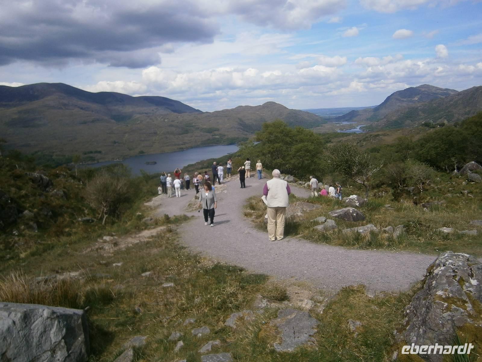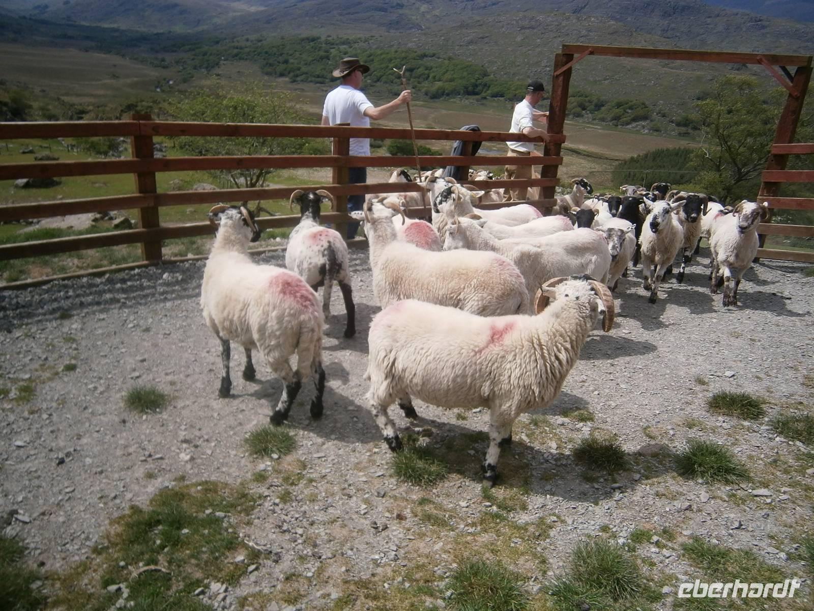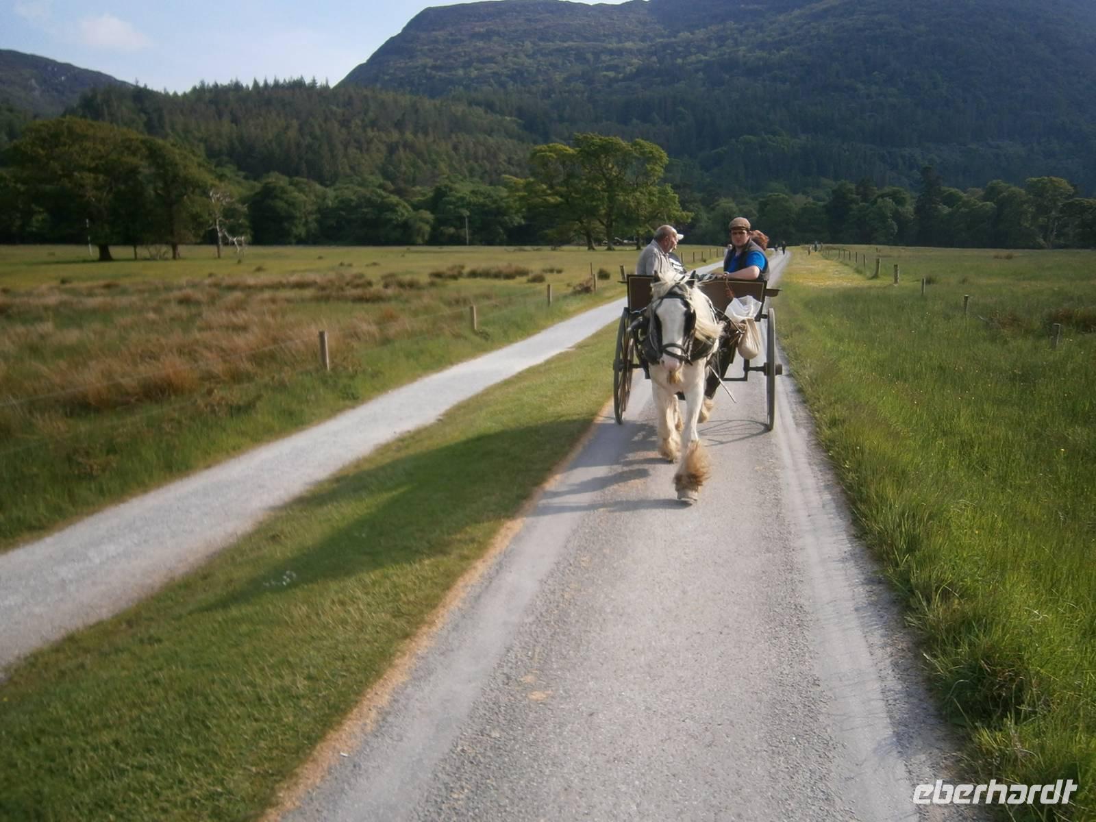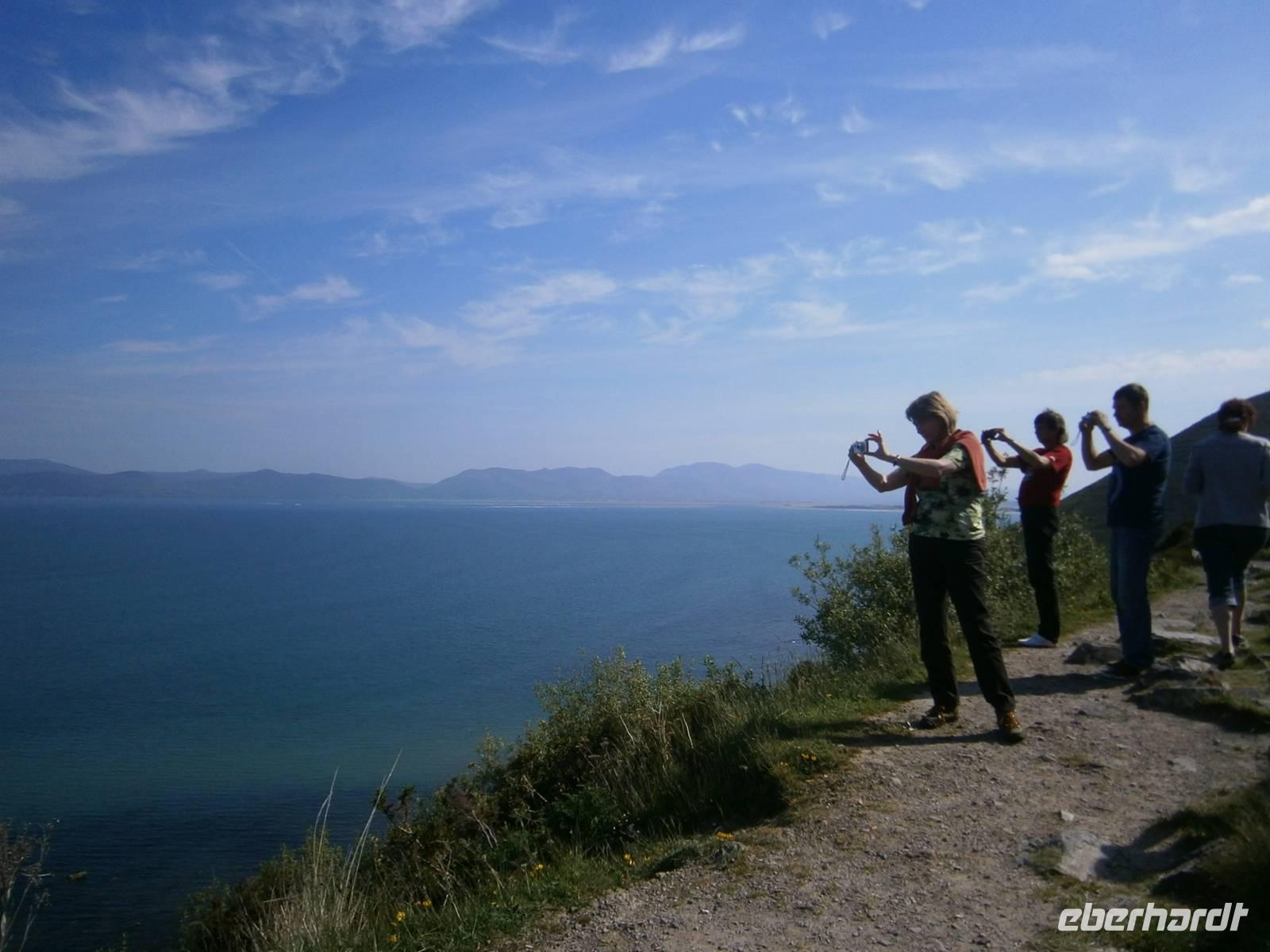 Wieder begrüßt uns der Sonnenschein, schon glauben wir an das Sprichwort: „Wenn Engel reisen, die Sonne."Alles ist perfekt! Der örtliche Reiseleiter begleitet uns heute den ganzen Tag bei der Rundfahrt auf dem Ring von Kerry. Hier dürfen Busse nur entgegen des Uhrzeigerverlaufs den Ring befahren. Wir genießen die Panoramafahrt durch eine der schönsten Landschaften Irlands. Immer wieder machen wir Fotostopps, um die herrliche Gegend festzuhalten. Wir halten in Glenbeigh mit Blick auf die Dingle Bay, in Cahergall, wo wir zum alten Stone Fort laufen. Mutige Gäste erklimmen sogar die äußeren Mauern. Weitere Fotostopps folgen - so in Waterville, wo wir uns neben Charly Chaplin stellen, in Caherdaniel mit einem phantastischen Blick auf den Kenmare River und den Atlantik. Der vor uns liegende White Beach und die strahlende Sonne locken uns zu einem kurzen Bad im kühlen Wasser. Erfrischt und stolz über unseren Mut geht es weiter auf dem Ring von Kerry nach Seem, mehrfach ausgezeichnet im Wettbewerb „Tidy Towns". Wir spazieren durch das kleine Ortszentrum, genießen ein Eis oder einen Kaffee oder kaufen ein Souvenir für die Freunde und Familie zuhause. Am frühen Nachmittag erreichen wir den Schaffarm von Keesane. Schäfer John demonstriert uns seine trainierten Hirtenhunde, die scheinbar nicht müde werden, wenn sie die Schafe zur Herde zusammentreiben. Bei der Vorführung des Schafescheren muss ein altes Tier seine Wolle lassen bevor es wieder in die Natur entlassen wird. Vielleicht trifft Schäfer John es im Oktober wieder. Wir können noch kleine Lämmer auf den Arm nehmen und mit diesen kuscheln oder die Flasche geben. Ein interessanter Besuch, der zu empfehlen ist. Nun geht es weiter und der nächste Stopp ist kurz vor Ladies View mit einem herrlichen Blick auf drei Seen und die sie umgebenden Berge. Wir sind voller schöner Eindrücke und wollen noch nicht gleich zum Hotel zurück. So verlassen die meisten Gäste den Bus im Stadtzentrum, gehen dort noch spazieren, besuchen einen Pub und fahren dann mit der Pferdekutsche zum Hotel zurück. Nach dem Abendessen sitzen alle vor dem Hotel im Abendsonnenschein bei einem Irish Coffee oder einem Guinness zusammen. Wieder neigt sich ein sehr schöner Tag dem Ende zu.