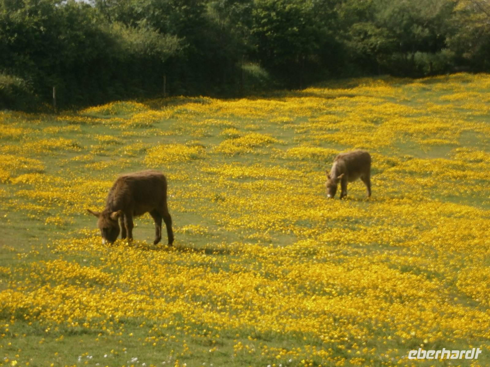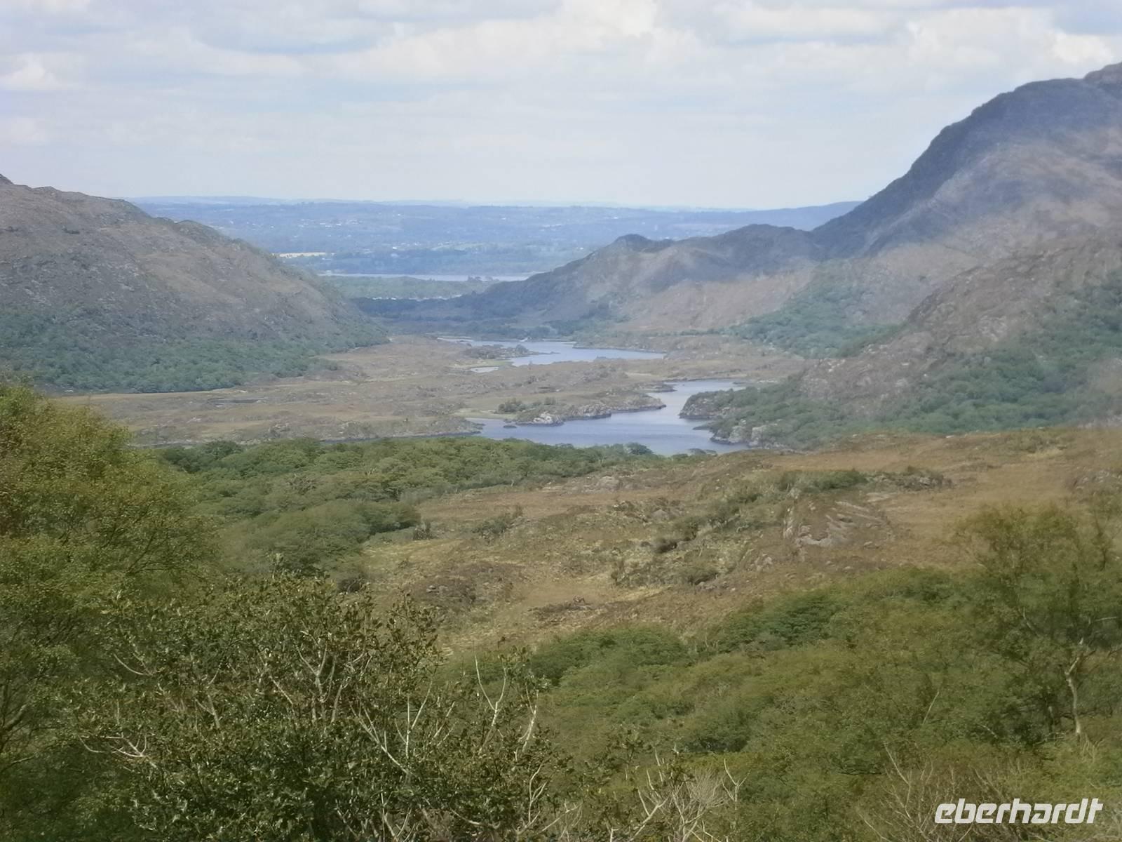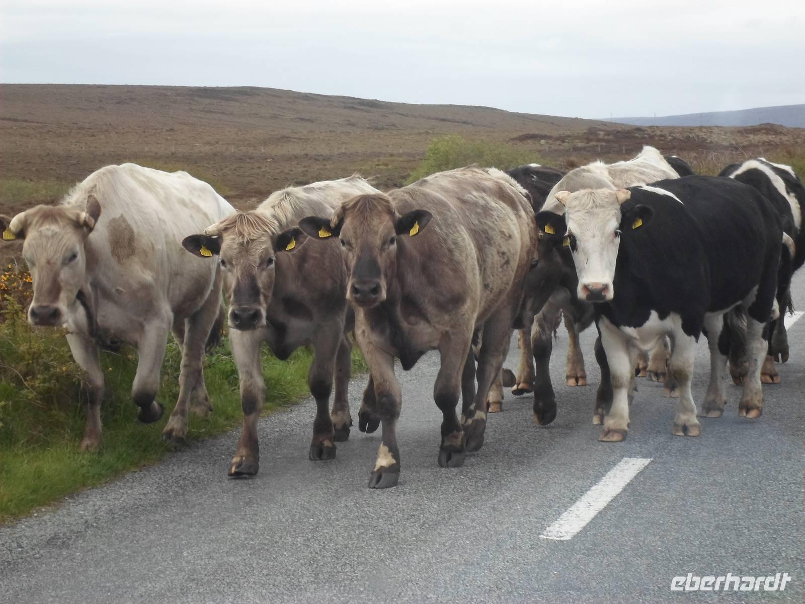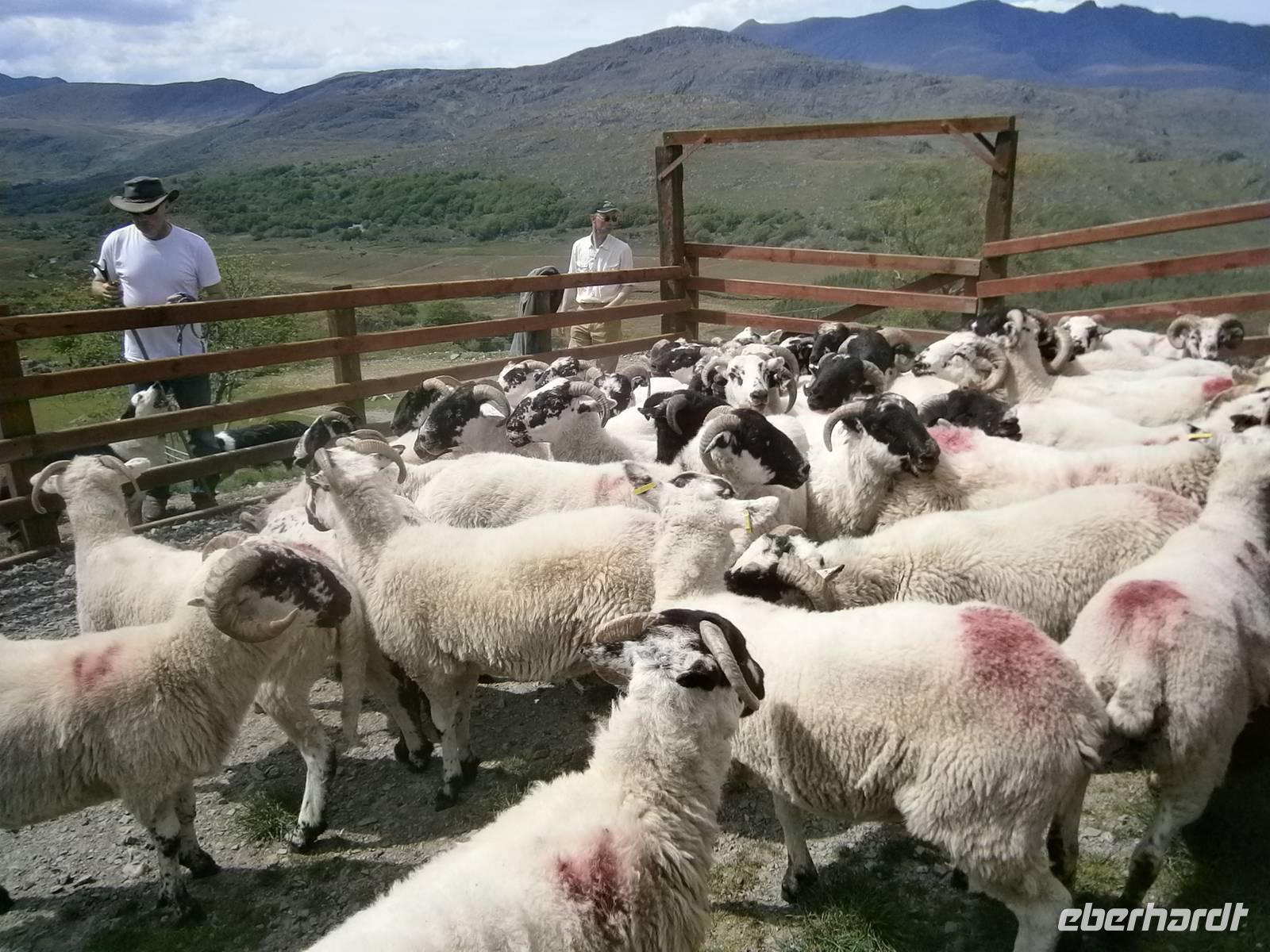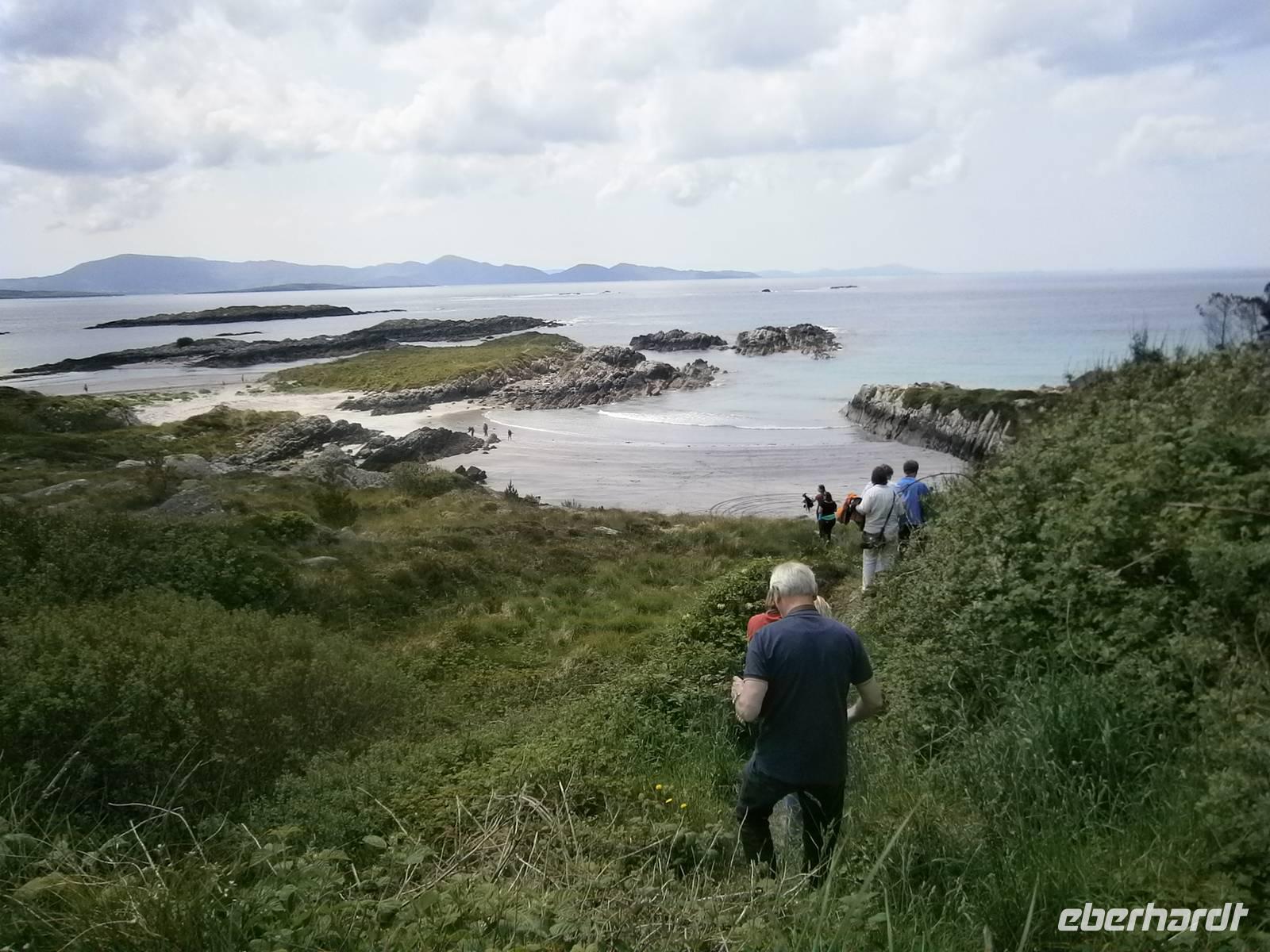 Wieder begrüßt uns der Sonnenschein, schon glauben wir an das Sprichwort: „Wenn Engel reisen, die Sonne."Alles ist perfekt! Der örtliche Reiseleiter begleitet uns heute den ganzen Tag bei der Rundfahrt auf dem Ring von Kerry. Hier dürfen Busse nur entgegen des Uhrzeigerverlaufs den Ring befahren. Wir genießen die Panoramafahrt durch eine der schönsten Landschaften Irlands. Immer wieder machen wir Fotostopps, um die herrliche Gegend festzuhalten. Wir halten in Glenbeigh mit Blick auf die Dingle Bay, in Cahergall, wo wir zum alten Stone Fort laufen. Mutige Gäste erklimmen sogar die äußeren Mauern. Weitere Fotostopps folgen - so in Waterville, wo wir uns neben Charly Chaplin stellen, in Caherdaniel mit einem phantastischen Blick auf den Kenmare River und den Atlantik. Der vor uns liegende White Beach und die strahlende Sonne locken uns zu einem kurzen Bad im kühlen Wasser. Erfrischt und stolz über unseren Mut geht es weiter auf dem Ring von Kerry nach Seem, mehrfach ausgezeichnet im Wettbewerb „Tidy Towns". Wir spazieren durch das kleine Ortszentrum, genießen ein Eis oder einen Kaffee oder kaufen ein Souvenir für die Freunde und Familie zuhause. Am frühen Nachmittag erreichen wir den Schaffarm von Keesane. Schäfer John demonstriert uns seine trainierten Hirtenhunde, die scheinbar nicht müde werden, wenn sie die Schafe zur Herde zusammentreiben. Bei der Vorführung des Schafescheren muss ein altes Tier seine Wolle lassen bevor es wieder in die Natur entlassen wird. Vielleicht trifft Schäfer John es im Oktober wieder. Wir können noch kleine Lämmer auf den Arm nehmen und mit diesen kuscheln oder die Flasche geben. Ein interessanter Besuch, der zu empfehlen ist. Nun geht es weiter und der nächste Stopp ist kurz vor Ladies View mit einem herrlichen Blick auf drei Seen und die sie umgebenden Berge. Wir sind voller schöner Eindrücke und wollen noch nicht gleich zum Hotel zurück. So verlassen die meisten Gäste den Bus im Stadtzentrum, gehen dort noch spazieren, besuchen einen Pub und fahren dann mit der Pferdekutsche zum Hotel zurück. Nach dem Abendessen sitzen alle vor dem Hotel im Abendsonnenschein bei einem Irish Coffee oder einem Guinness zusammen. Wieder neigt sich ein sehr schöner Tag dem Ende zu.