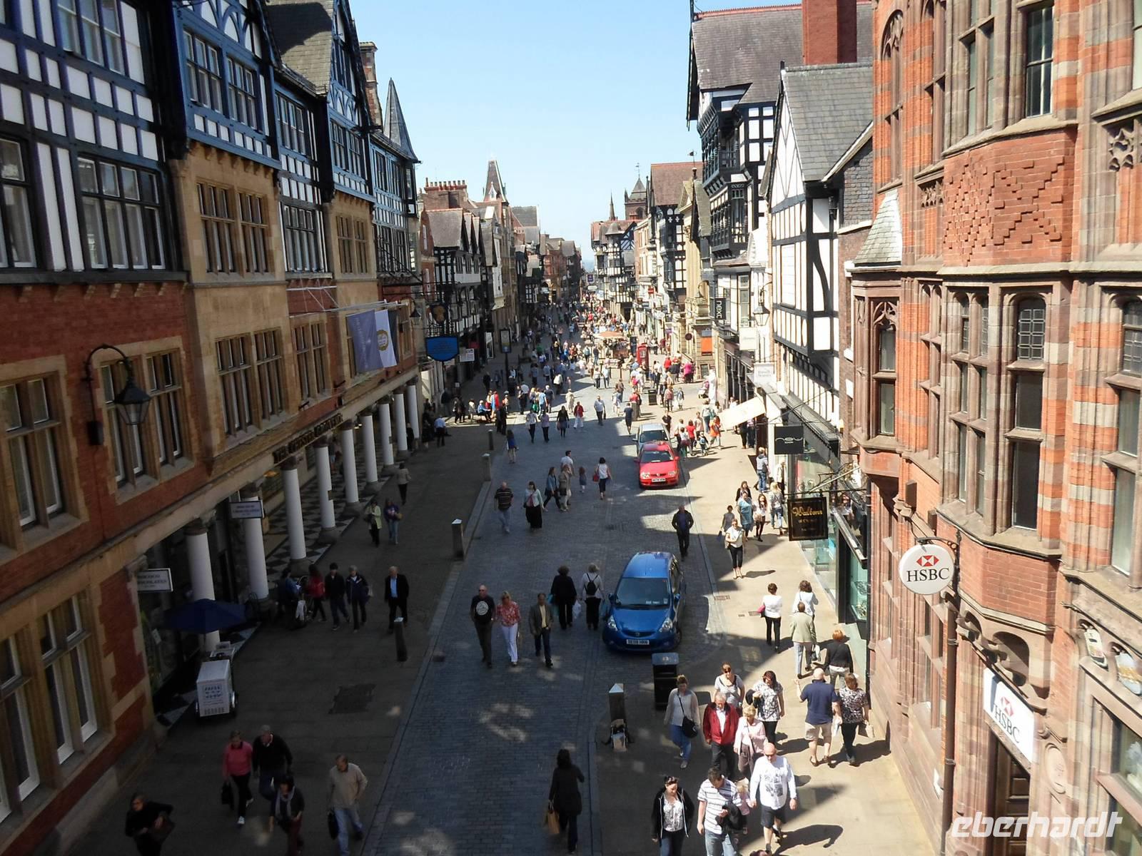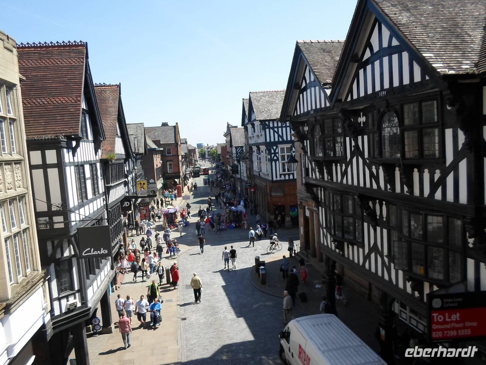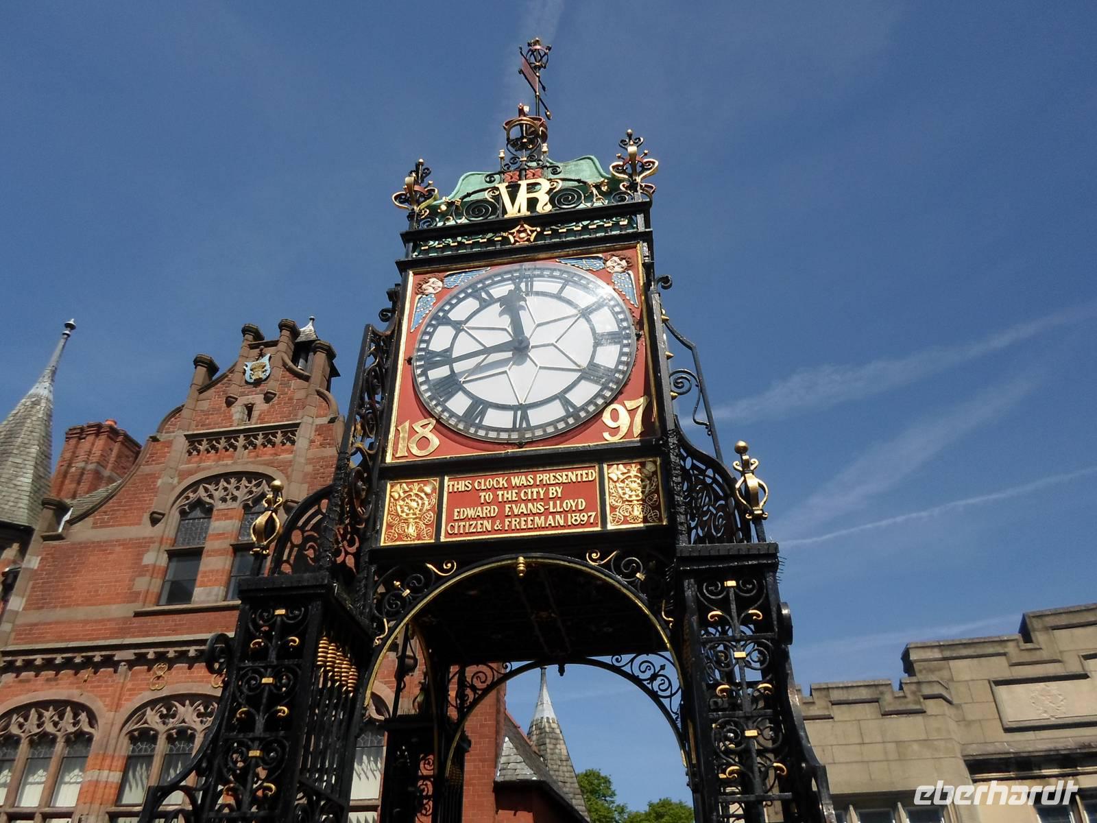 passieren. Leeds, Manchester bevor wir die historische Altstadt von Chester besuchen. Natürlich staunen wir über unseren Busfahrer, wie schnell er sich an den Linksverkehr angepasst hat und scheinbar überhaupt keine Probleme hat zu überholen. Angekommen in Chester laufen wir auf der Stadtmauer bis zur Uhr, die anlässlich des 60jährigen Thronjubiläums von Queen Victoria hier errichtet wurde. Dann machen wir einen Spaziergang durch die von wunderschönen Fachwerkhäusern gesäumten Straßen, werden vom Stadtschreier in seinem historischen Kostüm persönlich begrüßt und laufen dann weiter zur Kathedrale und dem historischen Rathaus, wo wir uns als Eberhardt -Gruppe im Gästebuch verewigen. Viele Straßenmusiker erfreuen uns auf unserem Spaziergang durch das wunderbare Chester. Wir wollen aber nach Irland. So setzen wir unsere Reise durch Nordwales fort, um die Fähre von Holyhead nach Dublin zu bekommen. Mit der Schnellfähre erreichen wir schon kurze Zeit später die irische Hauptstadt und unser Hotel, das nicht weit vom Hafen und dem Stadtzentrum gelegen ist. Zuerst begrüßen wir unsere anderen Gäste, die mit dem Flugzeug anreisten. Nun sind wir vollzählig und es kann morgen richtig losgehen. Alle freuen sich über einen gelungenen Start unserer Reise über die grüne Insel.
