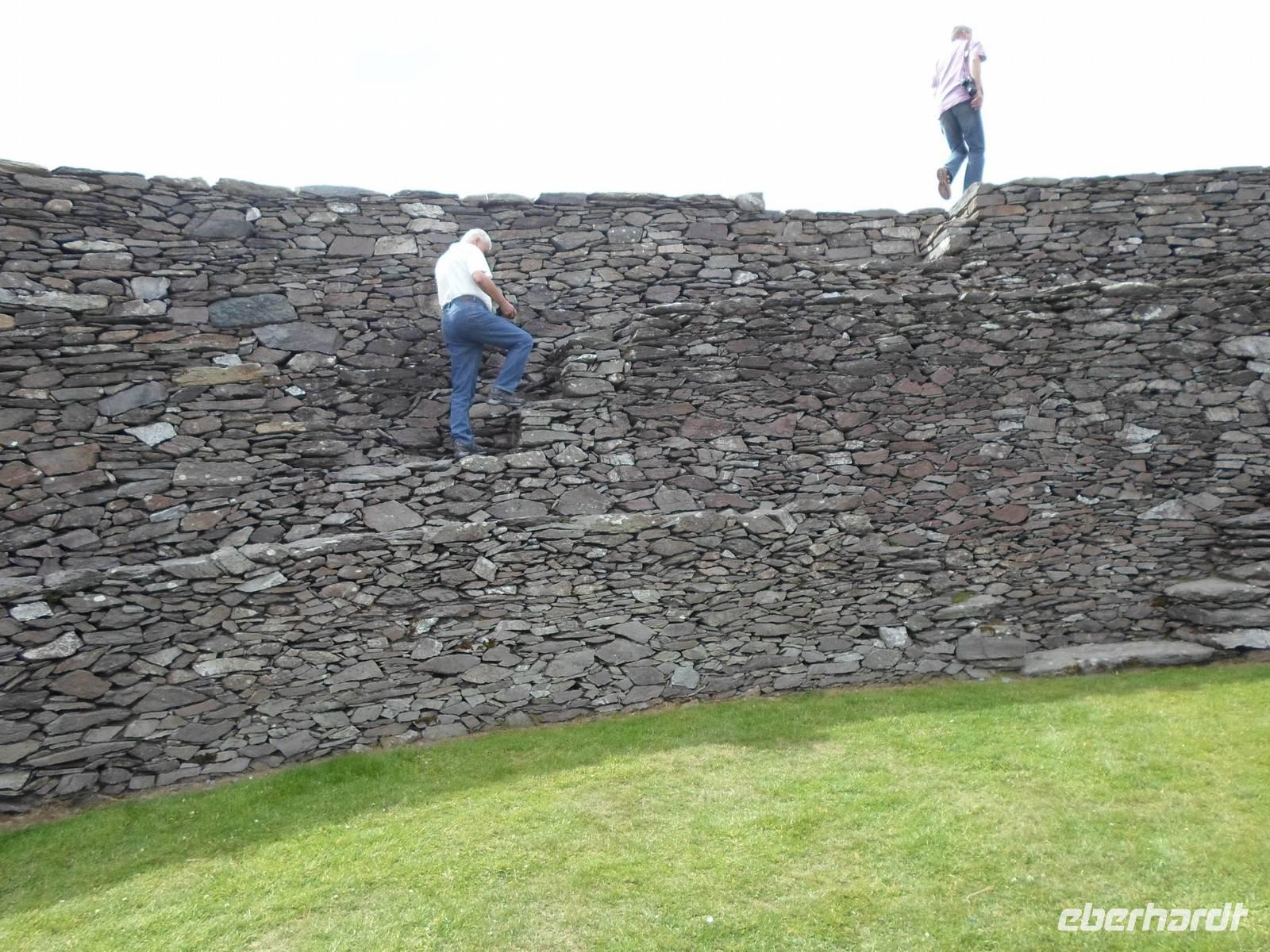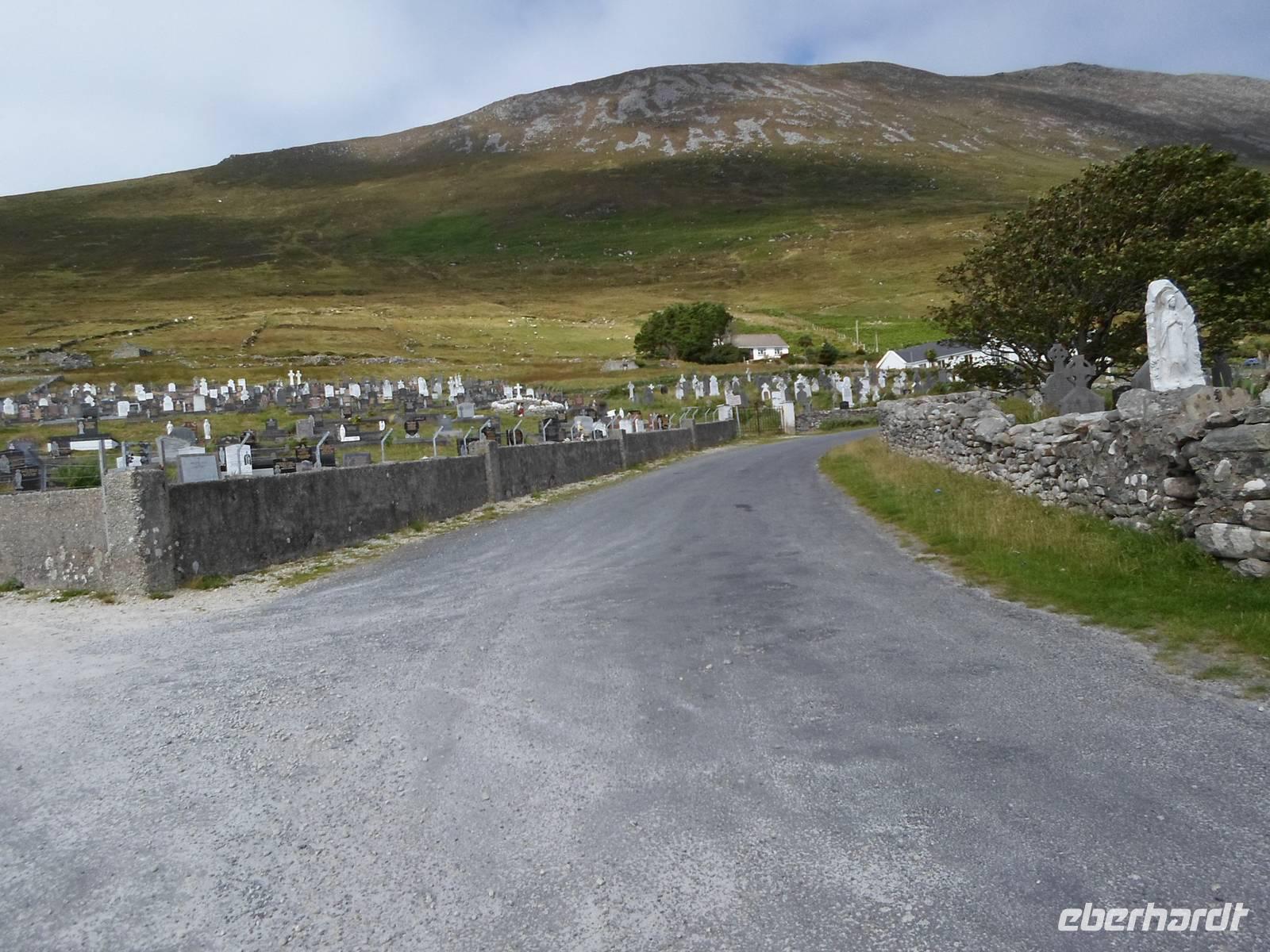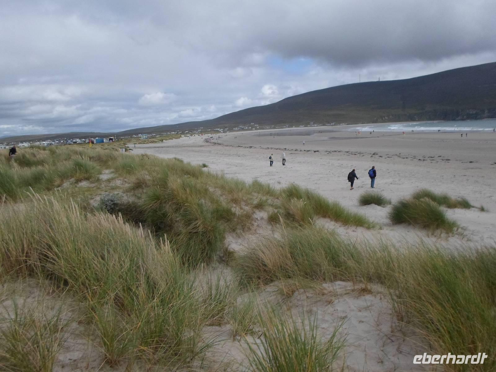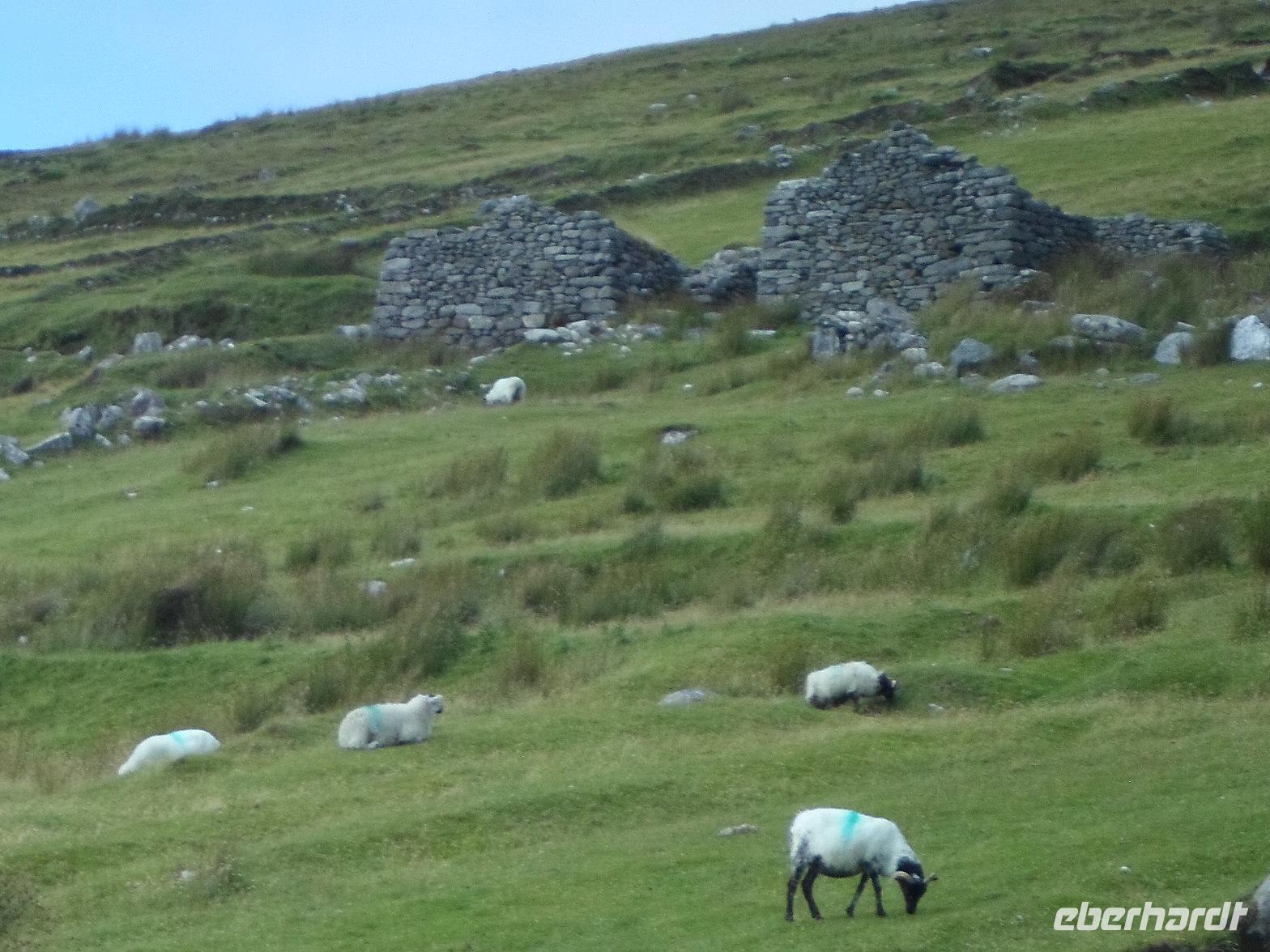 Heute werden wir die Grafschaft Mayo erkunden. Zuerst fahren wir zur kleinen Stadt Killala mit ihrem Rundturm und dem herrlichen Blick auf die Killala Bay. Wild und romantisch erscheint uns die Natur hier. Etwas später besuchen wir die Ausgrabungsstätten in den Céide Fields, wo eine 5000 Jahre alte Bauernsiedlung von dem Leben der Menschen jener Zeit erzählt. Schließlich fahren wir zur größten irischen Insel, Achill Island. Hier finden wir in Doogart das Ferienhaus von Heinrich Böll, das jetzt von Künstlern genutzt wird. Dann laufen wir durch das „Deserted Village" mit seinen 70 verlassenen Häusern, die verfallen am Berghang stehen und vor diesen ahnen wir noch die für den Anbau von Kartoffeln genutzten Flächen. Viele Missernten führten im 19. Jahrhundert zur Hungersnot und zum Verlassen der Häuser. In welcher Not müssen diese Menschen gewesen sein, dass sie mit den Familien ihr Zuhause zurücklassen mussten? Jetzt wollten wir eigentlich am Strand von Keel schwimmen gehen, aber es ist zu kalt. Nur ein ganz mutiger Mann wagt sich mit den Füßen ins Wasser. Wir verlassen Keel und es geht zurück zu unserem Hotel in Ballina. Dort beenden wir diesen schönen Tag bei einem Glas Guinness.