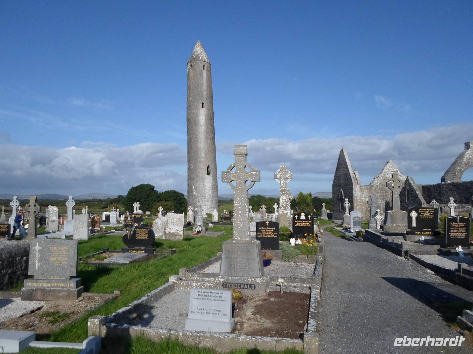 Wir verabschieden uns von Gort früh am Morgen. Zuerst geht es nach Kilmacduagh. Hier steht eine der ältesten Klosterruinen Irlands mit dem höchsten Rundturm der Insel. Außerdem ist er fast so schief wie der Turm in Pisa. Auf dem hiesigen Friedhof ruht der Heilige Colman, der wegen der Heilung von Rückenproblemen verehrt wurde. Weiter fahren wir durch das silbergraue Steinmeer der Burren zum Poulnabrona Dolmen. Etwas enttäuscht sind wir doch von diesem. Wir hatten ihn uns viel größer vorgestellt. Gegen Mittag treffen wir Joe. Er wird uns in die Geheimnisse und Anstrengungen des Torfstechens einweihen. Vorher geht es aber erst auf einen Waldspaziergang zum Torffeld. Natürlich probieren einige Gäste das Stechen des Torfes selbst. Es ist schon interessant zu sehen, wie mühsam die Arbeit ist, bis der Torf als Heizmaterial genutzt werden kann. Die Sonne scheint als wir dann entlang der Cliffs von Moher laufen. Wir sind beeindruckt von der Schönheit der Cliffs und der Kraft des azurblauen Meeres, das seine Wellen an den Klippen bricht und weiße Schaumkronen hinterlässt. Nun geht es entlang der Küste, durch hübsche Ortschaften, Richtung Süden. Wir sehen Sonnenbadende am Sandstrand, viele Golfspieler und Wassersportler. Schade, dass die Zeit drängt. Wir müssen nach Killimer, wo wir mit der Fähre den größten Fluss Irlands, den Shannon, überqueren. Gespannt schauen wir auf das Wasser, um Delphine zu entdecken. Leider haben wir kein Glück. Nach unserer „Kreuzfahrt" erreichen wir schon bald Killarney, unseren Übernachtungsort für die nächsten drei Tage.