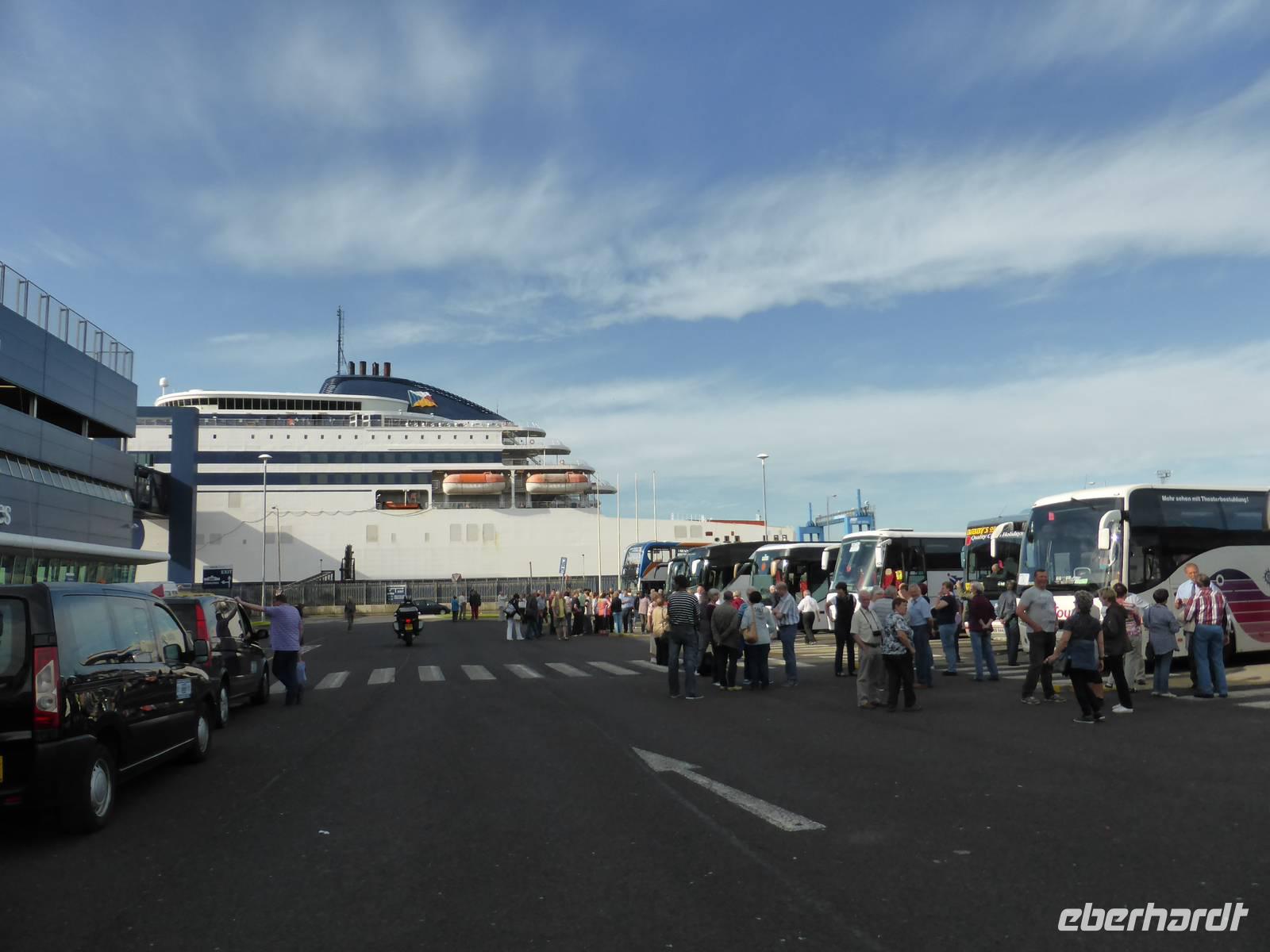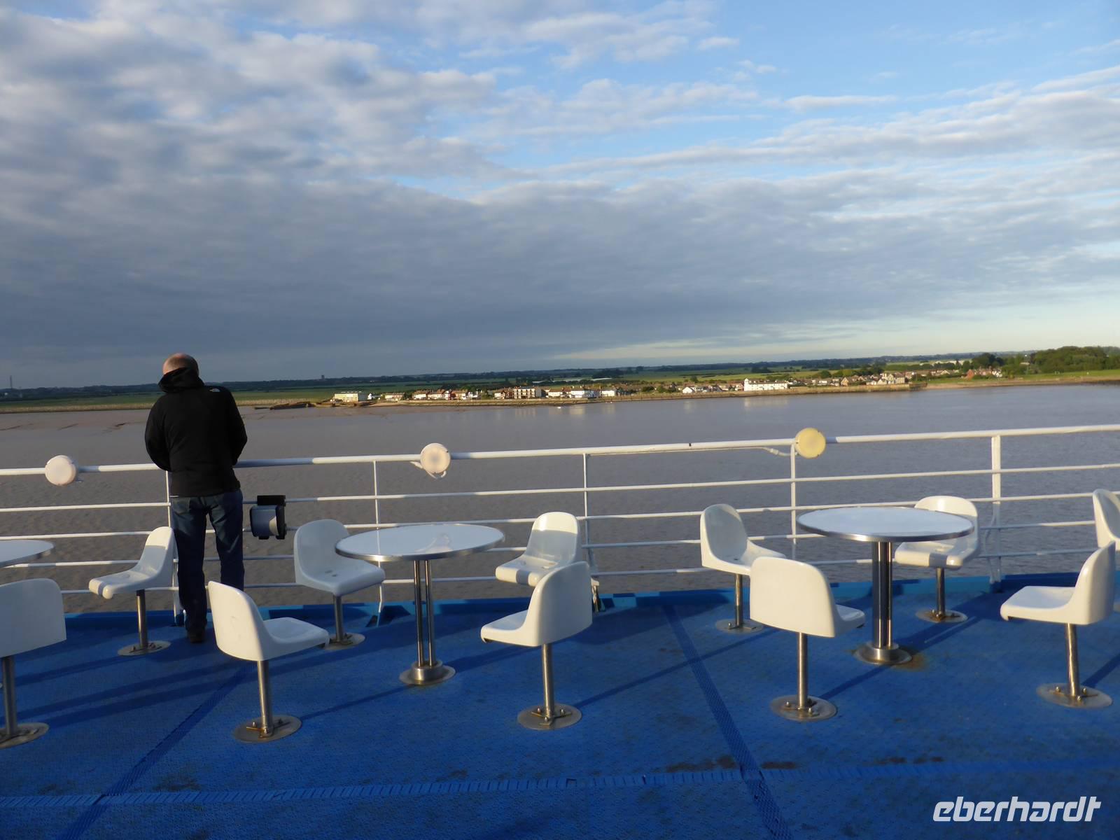 Unsere Reise begann mit der pünktlichen Abfahrt vom Flughafen Dresden. Durch die Sperrung der Autobahnauffahrt Meerane und der damit verbundenen Umleitung kamen wir mit Verspätung an den beiden folgenden Zustiegsstellen an. Am RH Eisenach war unsere Bus-Reisegruppe komplett. Als Fahrtroute hatten wir uns die Strecke über Hessisch Lichtenau, Kassel und Dortmund ausgewählt. Es war eine angenehme Fahrt auf freien Autobahnen, nur in den Niederlanden gerieten wir in den Berufsverkehr. Gegen 19.10 Uhr kamen wir im Rotterdamer Europort am Fährterminal von P&O an. Nach dem Check In auf der Fähre „Pride of Hull" bezogen wir unsere Kabinen und gingen ins Restaurant zum Abendessen. Pünktlich legte die Fähre ab und wir sahen noch einmal die gewaltigen Ausmaße des Rotterdamer Hafens.