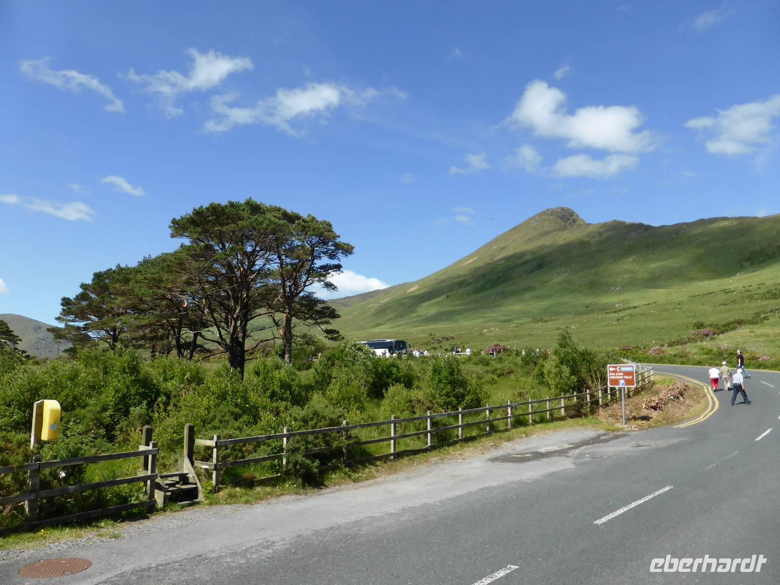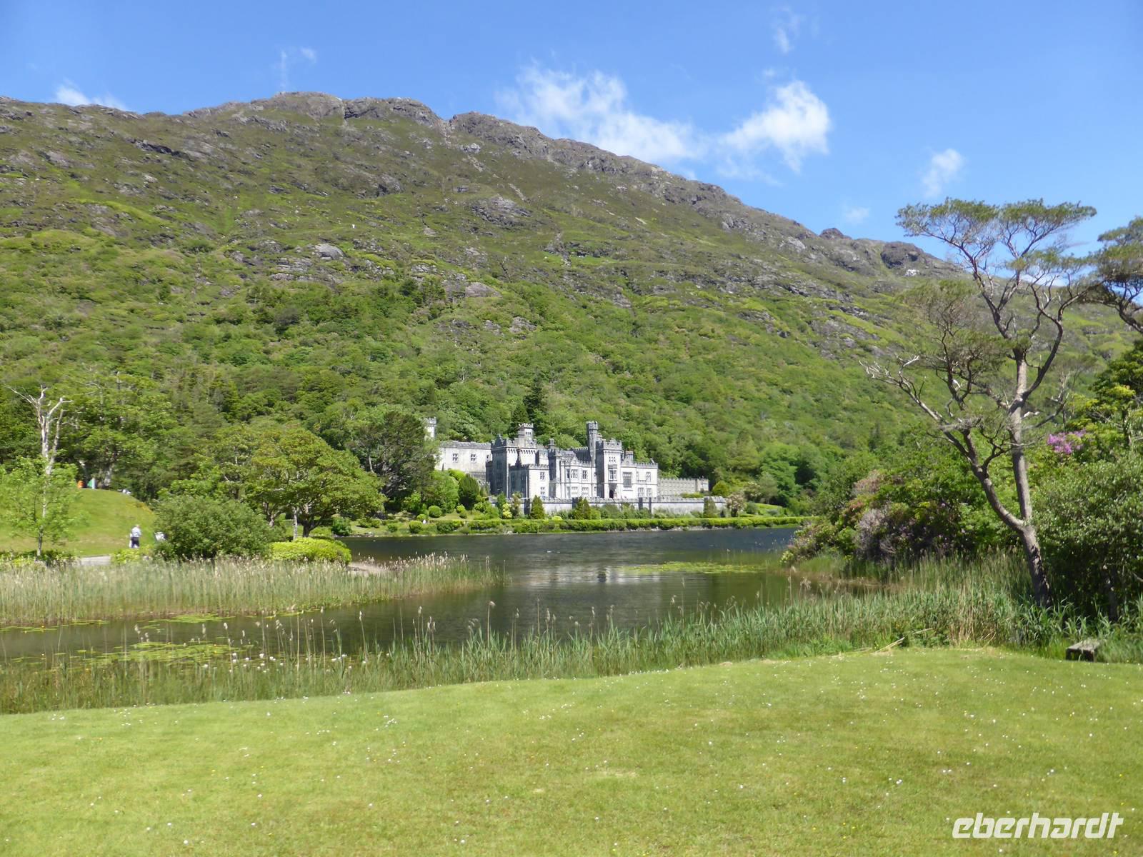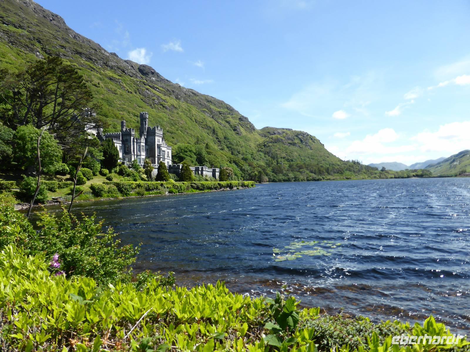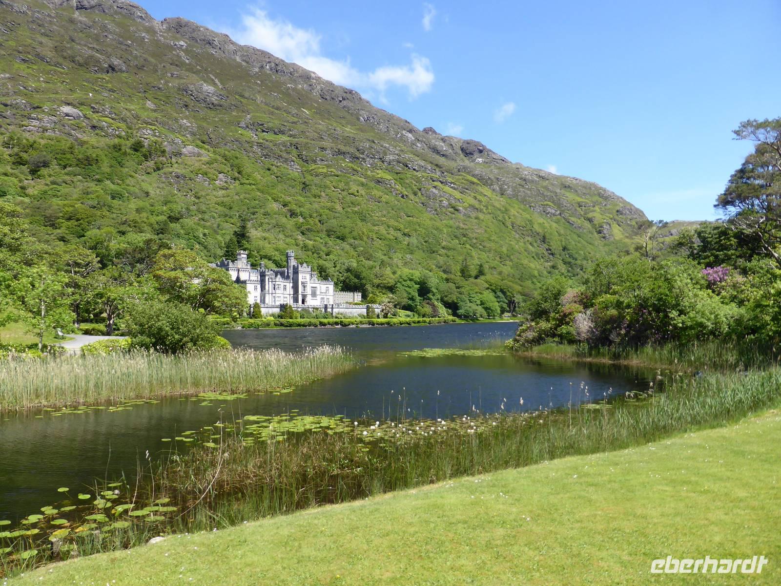 Am Morgen hieß es Abschied nehmen von unserem Hotel in Ballina und Weiterfahrt in Richtung Connemara. An der Pontoon Bridge, zwischen den beiden Seen Lough Conn und Lough Cullin, legten wir einen ersten Fotostopp ein. Anschließend fuhren wir in die schöne Stadt Westport zu Füßen des Croagh Patrick, Irlands heiligen Berg. Die Stadt Westport wurde planmäßig auf dem Reißbrett entworfen, basierend auf einem Achteck im Zentrum. Inmitten dieses Achteckes steht auf einer Säule die Statue des Heiligen St. Patrick. Von Westport aus ging es zu unserem nächsten Fotostopp zu den Aasleagh Falls am River Erriff und von dort zur Kylemore Abbey. Das Schloss wurde in der 2.Hälfte des 19. Jahrhunderts vom wohlhabenden Prominentenarzt Henry als Landsitz für seine Frau erbaut. Seit Anfang des 20. Jahrhunderts befand sich das Anwesen im Besitz eines Benediktinerordens und seit einigen Jahren wird das Anwesen staatlich verwaltet. Zur herrlichen Parkanlage mit der Abbey (ehemaliges Schloss), dem See und der Kirche gehören auch die victorianischen Gartenanlagen und Gewächshäuser.