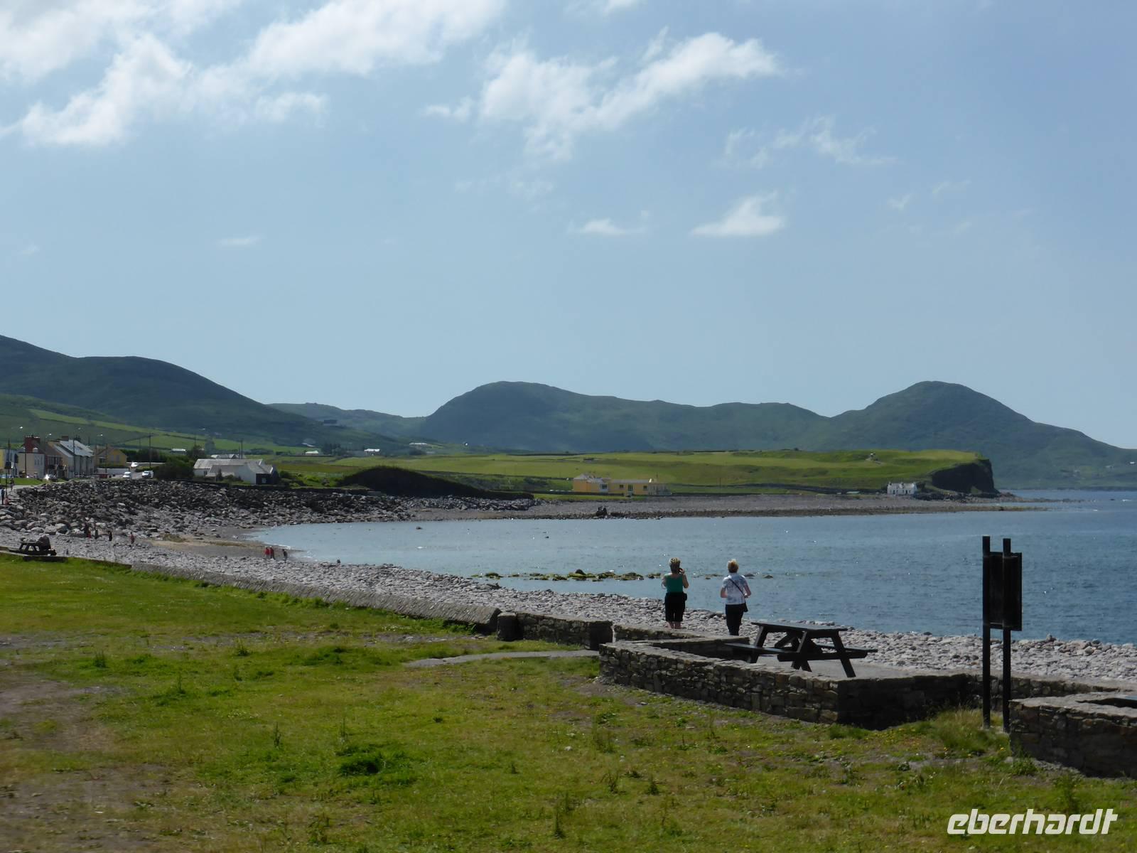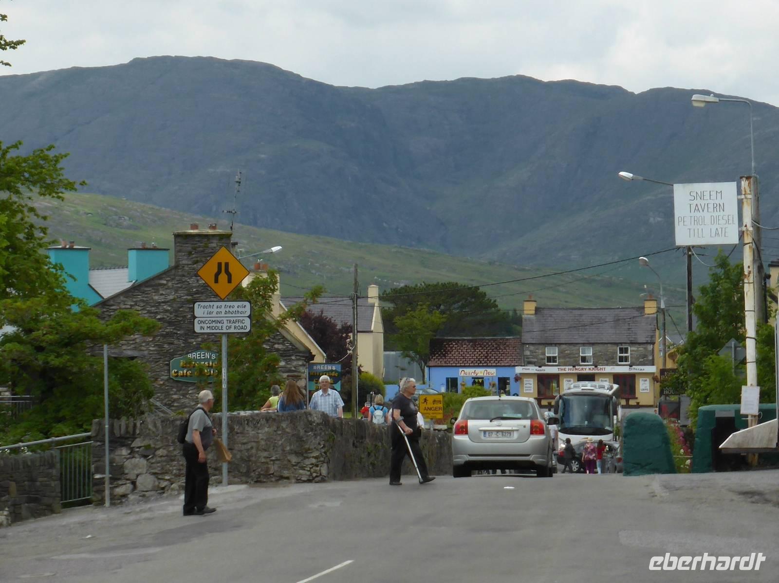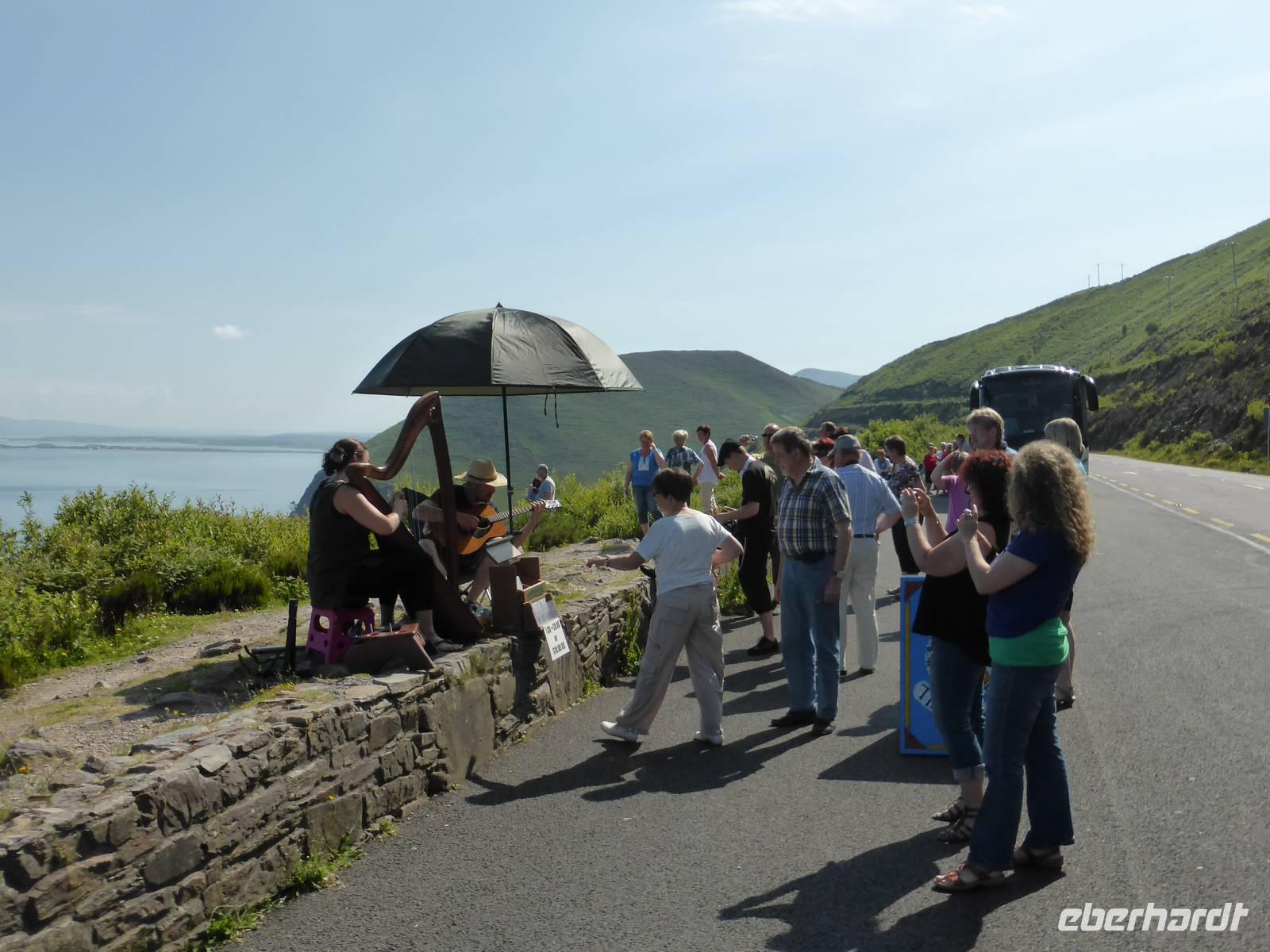 Wir begannen unsere Tagesfahrt auf dem Ring of Kerry mit einem Besuch bei King Puck in Killorglin. Jedes Jahr wird Anfang August ein wilder Ziegenbock für drei Tage zum König von Irland gekrönt. Der nächste Fotostopp war an der Dingle Bay. Die beiden Musiker der Gruppe Shambala unterhielten die Zuhörer mit Harfen- und Gitarrrenspiel und das alles vor der traumhaften Kulisse der Dingle-Bucht. Nach einem weiteren Fotostopp oberhalb von Kells fuhren wir nach Cahersiveen und stiegen dort an einem Feldweg aus, um zum Cahergall Ringfort zu spazieren. Keiner von uns hatte geahnt, wie massiv diese Steinforts gebaut worden sind .Erst wenn man im Inneren ist oder auf die Mauern klettert, wird das einem bewusst. Unsere Mittagspause verbrachten wir in Waterville, einem Städtchen an der Ballinskelligs Bay, in dem sich auch Charly Chaplin gern aufhielt. Später sahen wir bei einem kurzen Fotostopp auch noch die beiden Skellig-Inseln. Mit einem kurzen Halt auf dem Coomakesta Pass fuhren wir anschließend auf der Panoramastraße des südlichen Rings of Kerry nach Sneem, einer hübschen irischen Kleinstadt, in der jedes Jahr der „Women Carrying"- Wettbewerb ausgetragen wird, der Wettbewerb im „Frauentragen".