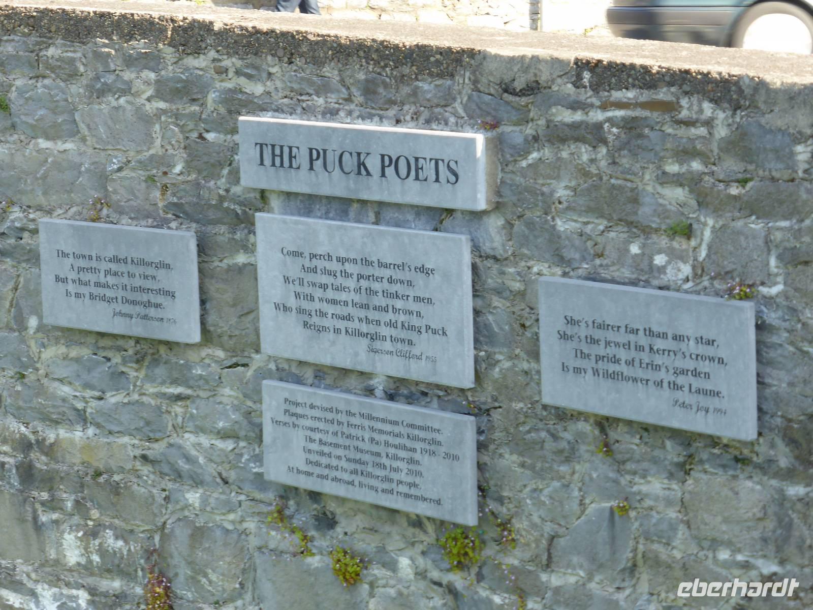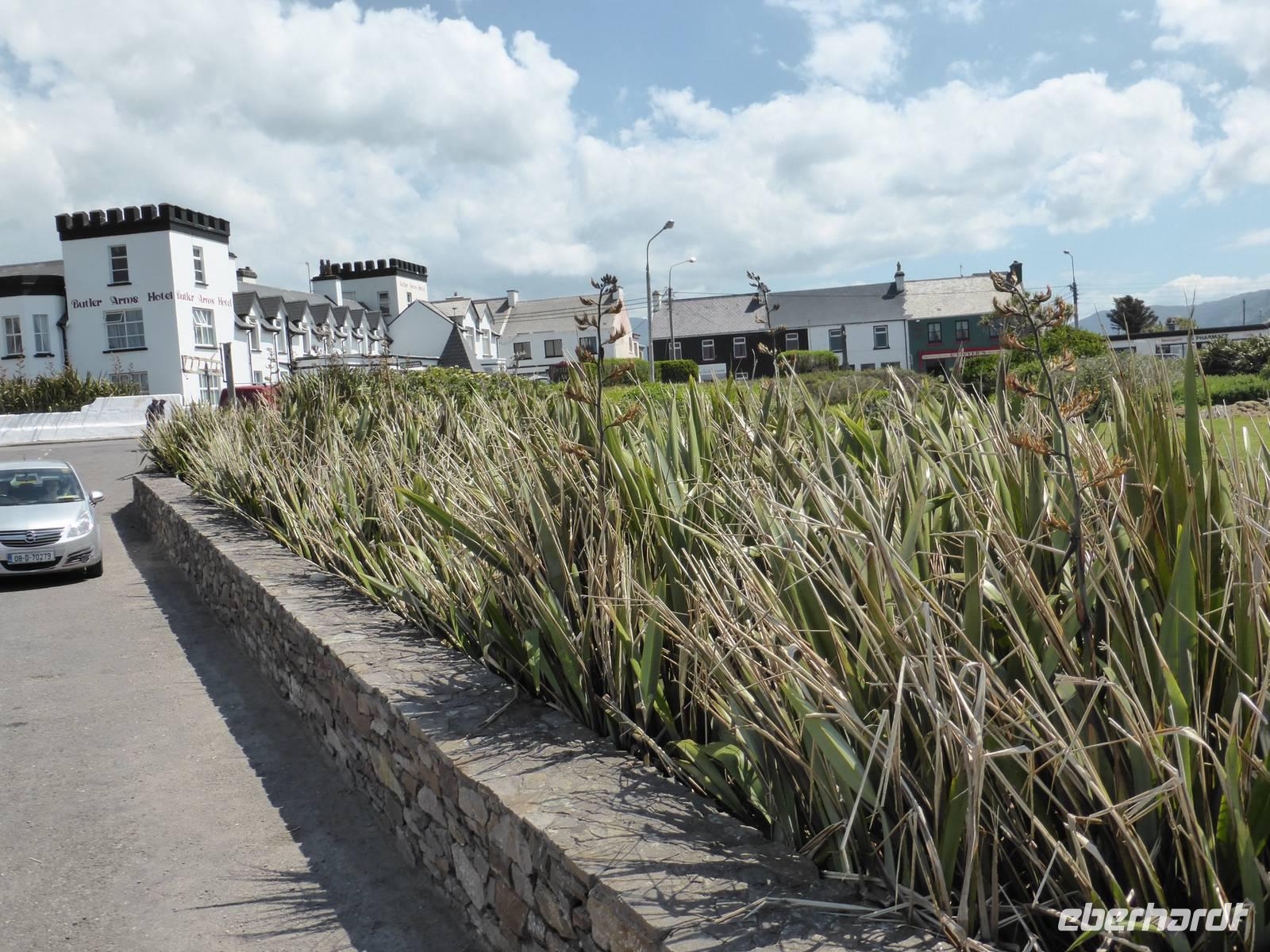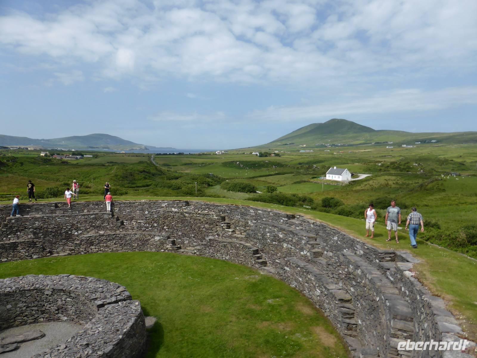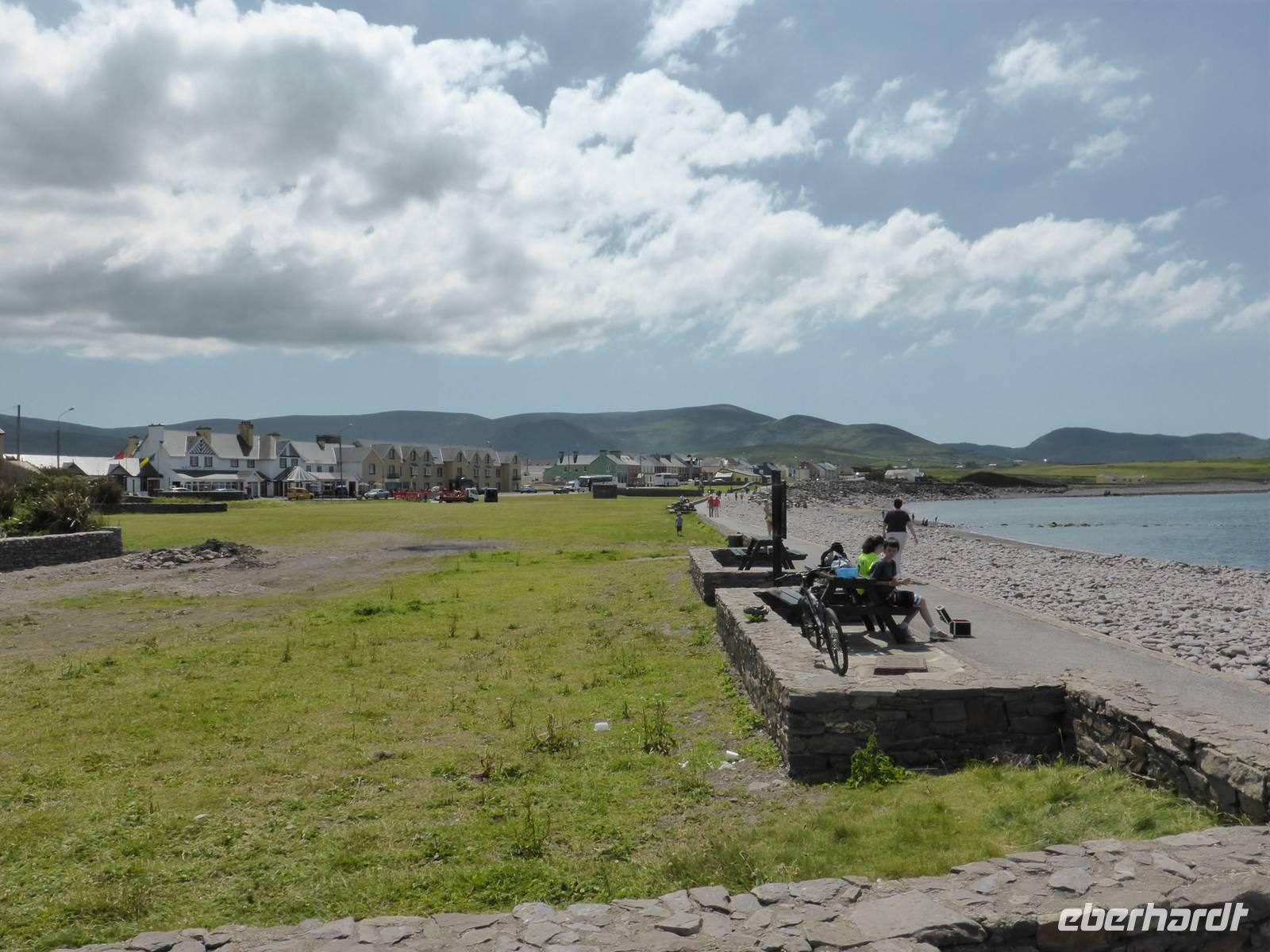 Wir begannen unsere Tagesfahrt auf dem Ring of Kerry mit einem Besuch bei King Puck in Killorglin. Jedes Jahr wird Anfang August ein wilder Ziegenbock für drei Tage zum König von Irland gekrönt. Der nächste Fotostopp war an der Dingle Bay. Die beiden Musiker der Gruppe Shambala unterhielten die Zuhörer mit Harfen- und Gitarrrenspiel und das alles vor der traumhaften Kulisse der Dingle-Bucht. Nach einem weiteren Fotostopp oberhalb von Kells fuhren wir nach Cahersiveen und stiegen dort an einem Feldweg aus, um zum Cahergall Ringfort zu spazieren. Keiner von uns hatte geahnt, wie massiv diese Steinforts gebaut worden sind .Erst wenn man im Inneren ist oder auf die Mauern klettert, wird das einem bewusst. Unsere Mittagspause verbrachten wir in Waterville, einem Städtchen an der Ballinskelligs Bay, in dem sich auch Charly Chaplin gern aufhielt. Später sahen wir bei einem kurzen Fotostopp auch noch die beiden Skellig-Inseln. Mit einem kurzen Halt auf dem Coomakesta Pass fuhren wir anschließend auf der Panoramastraße des südlichen Rings of Kerry nach Sneem, einer hübschen irischen Kleinstadt, in der jedes Jahr der „Women Carrying"- Wettbewerb ausgetragen wird, der Wettbewerb im „Frauentragen".