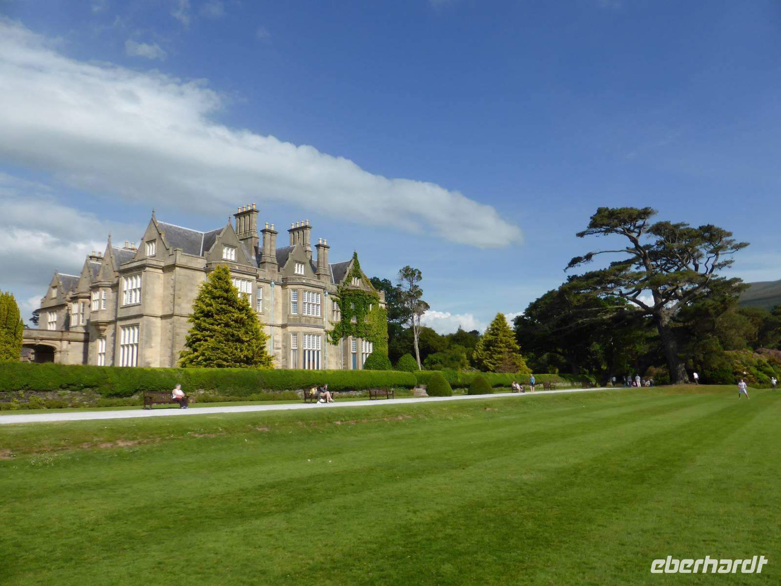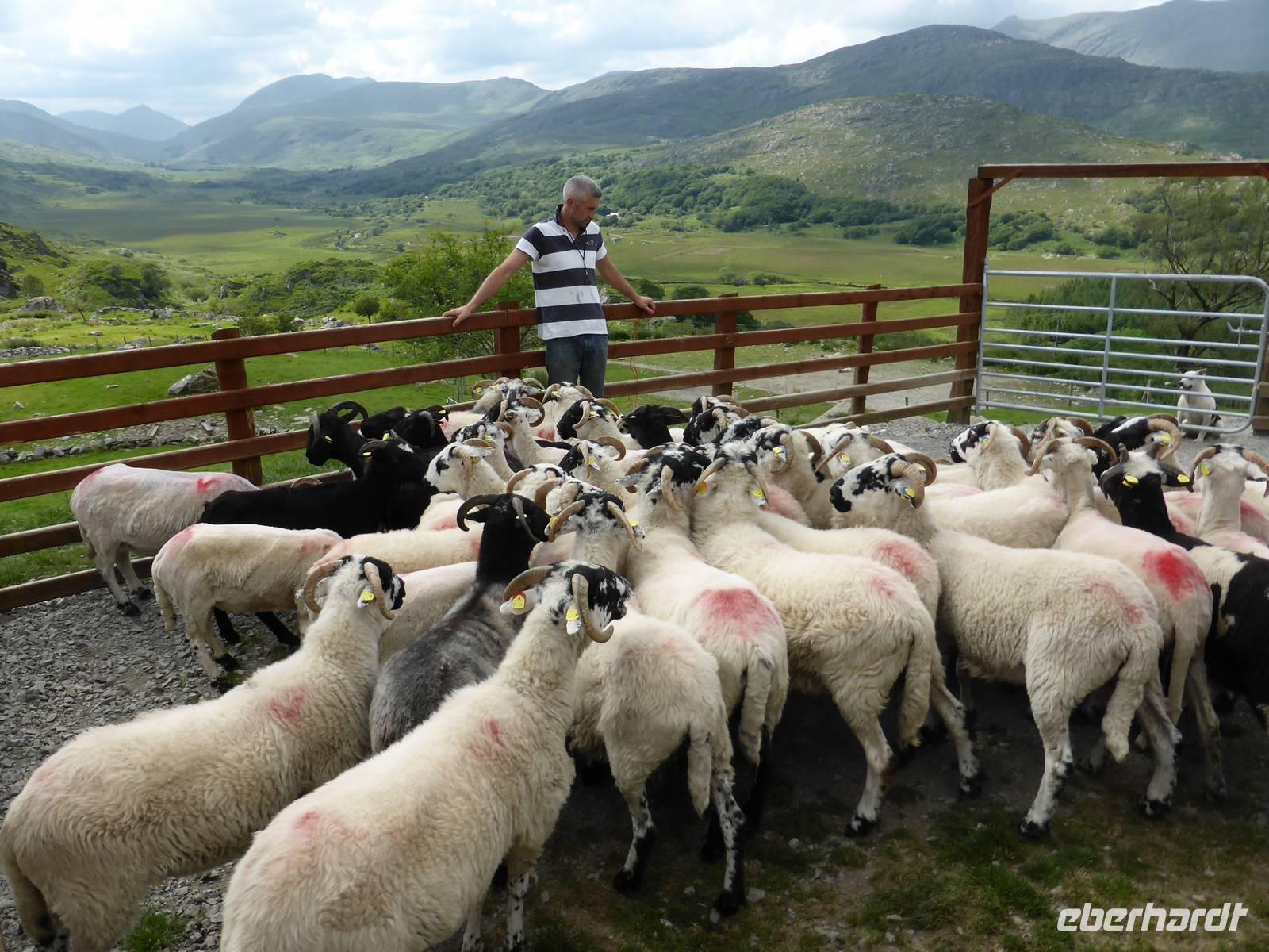 Ein besonderer Höhepunkt war anschließend der Besuch bei Kissane's Sheep Farm. Joel erklärte uns die einzelnen Phasen der Zusammenarbeit zwischen dem Schäfer John und seinen beiden Hirtenhunden Fly und Key. Von einem Podest aus konnten wir ihnen beim Zusammentreiben der Schafe zusehen. In der Scheune erlebten wir dann eine Schafschur in einem unglaublich schnellen Tempo. Wer wollte, hätte auch gleich ein Schaf adoptieren können, was aber dann doch keiner von uns tat. Auf unserer Weiterfahrt hielten wir am Aussichtspunkt Ladies View, von wo aus wir einen tollen Blick auf den Upper Lake und die umliegenden Berge des Killarney - Nationalparks hatten. Den krönenden Abschluss unserer Rundfahrt bildete der Spaziergang durch die Parklandschaft am Muckross Lake. Das herrschaftliche Gebäude Muckross House liegt in einer traumhaften Landschaft, umgeben von einer englischen Parkanlage.