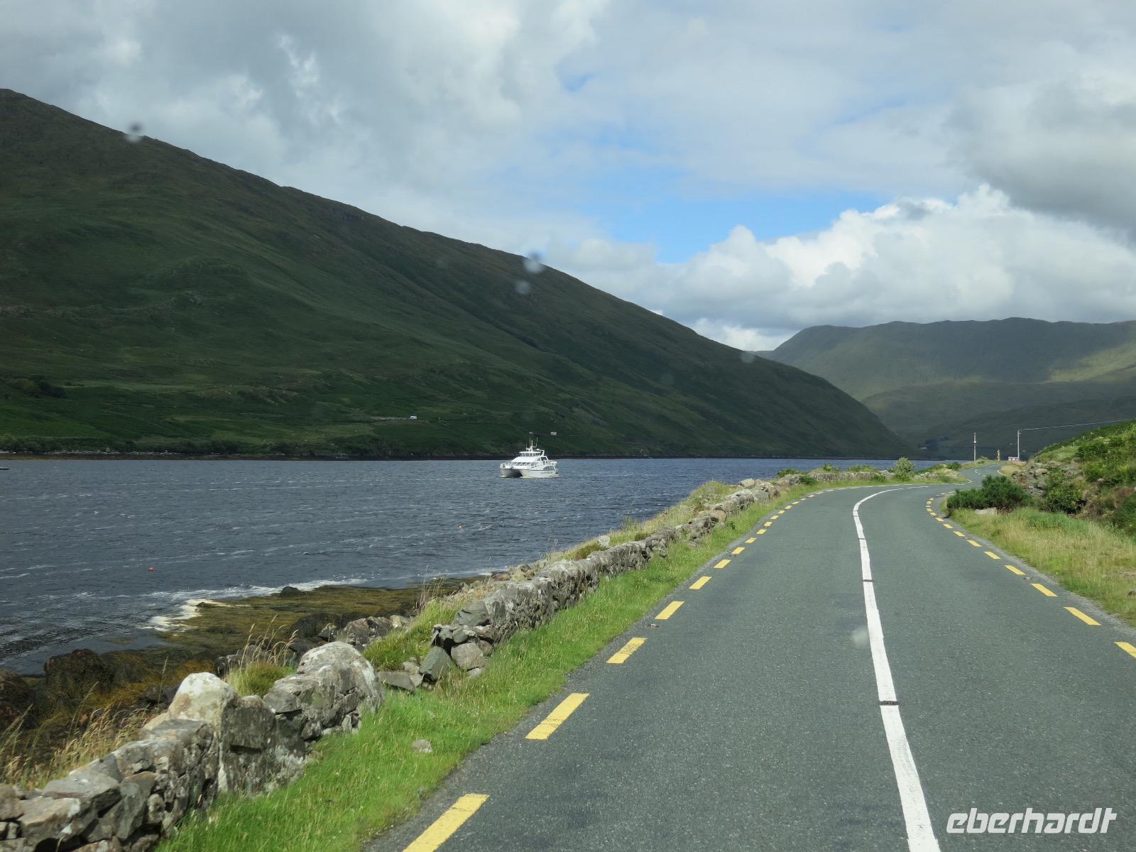 An diesem Morgen stieg unser Reiseführer Jan mit in unseren Bus. Er führte uns durch die reizvolle Landschaft der Beara Halbinsel. Zunächst jedoch hielten wir in Kenmare für einen kleinen Stadtbesuch an. Gemütliche Teestuben und viele kleine Läden und Galerien laden zu einem Bummel ein. Danach fuhren wir in den Ring of Beara hinein, verschlungene Straßen führten uns durch nahezu unberührte Natur mit Gletschertälern, kargen Bergen und unzähligen Schafen. Leider behinderten Nebel und Regen die Sicht, so dass wir auch am Healy Pass die imposante Berg- und Schluchtenlandschaft eher erahnen, denn tatsächlich gut sehen konnten. Dennoch waren wir beeindruckt von dieser großartigen Landschaft. In Castletownberehaven am Südufer der Halbinsel verbrachten wir unsere Mittagspause. Wir sahen viele Fischerboote am Kai, die tagtäglich zum Fischfang hinaus fahren. Das kleine Städtchen lud mit gemütlichen Pubs und Cafés sowie allerhand kleine Geschäften zum Verweilen ein. Danach fuhren wir wieder in Richtung Glengariff, aber nicht, um sofort ins Hotel zu fahren, sondern zunächst die Anlegestelle in der Nähe des Eccles Hotels aufzusuchen. Mit einem kleinen Fährboot setzten wir über auf die Garinish Island. Hier bestaunten wir bei einem ausgiebigen Spaziergang den suptropischen Garten, der Anfang des 20. Jahrhunderts vom Gartenspezialisten Murdock für die Adlige Familie Bryce hier angelegt worden war. Nach unserem Gartenbesuch setzten wir wieder über, um den Rest des Nachmittags nach eigenen Wünschen zu verbringen. Am Abend ließen wir uns wieder ein leckeres 3-Gänge-Menü schmecken.