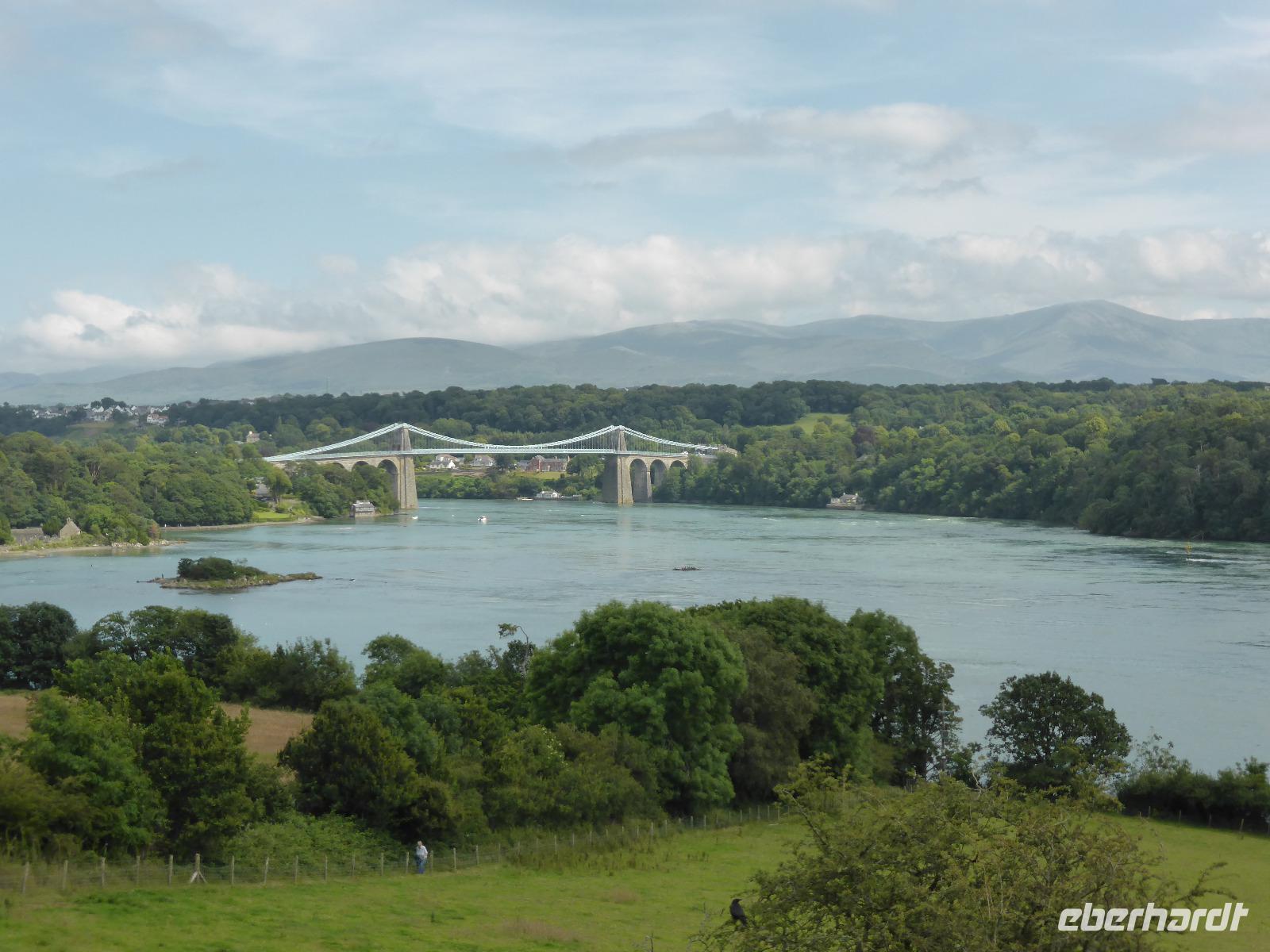 Auf der Weiterfahrt entlang der Nordküste von Wales und der Überquerung der Menai Strait über die Britannia Bridge legten wir noch einen Fotostopp mit Blick auf die Hängebrücke von Thomas Telford auf der Insel Anglesey ein.