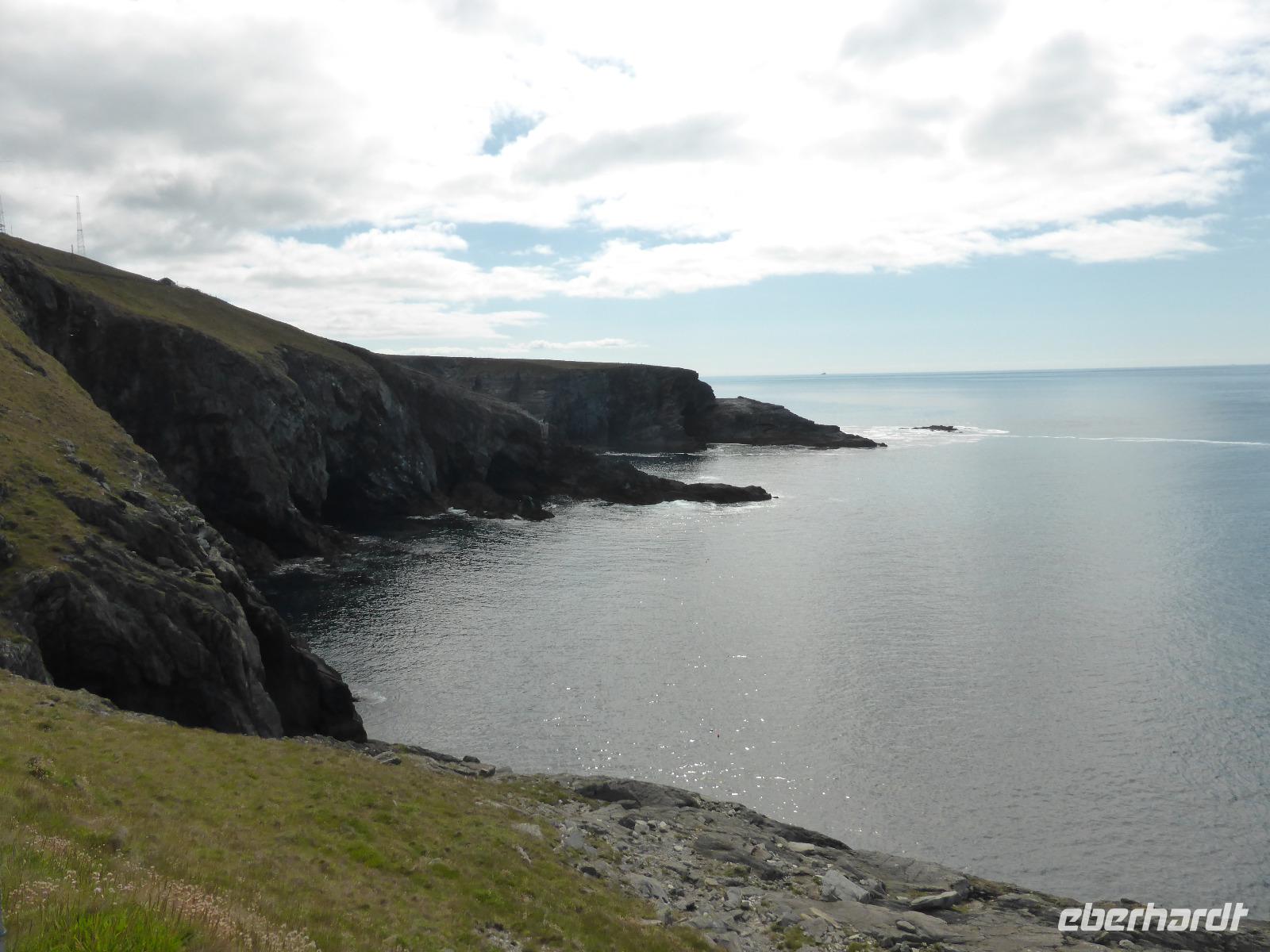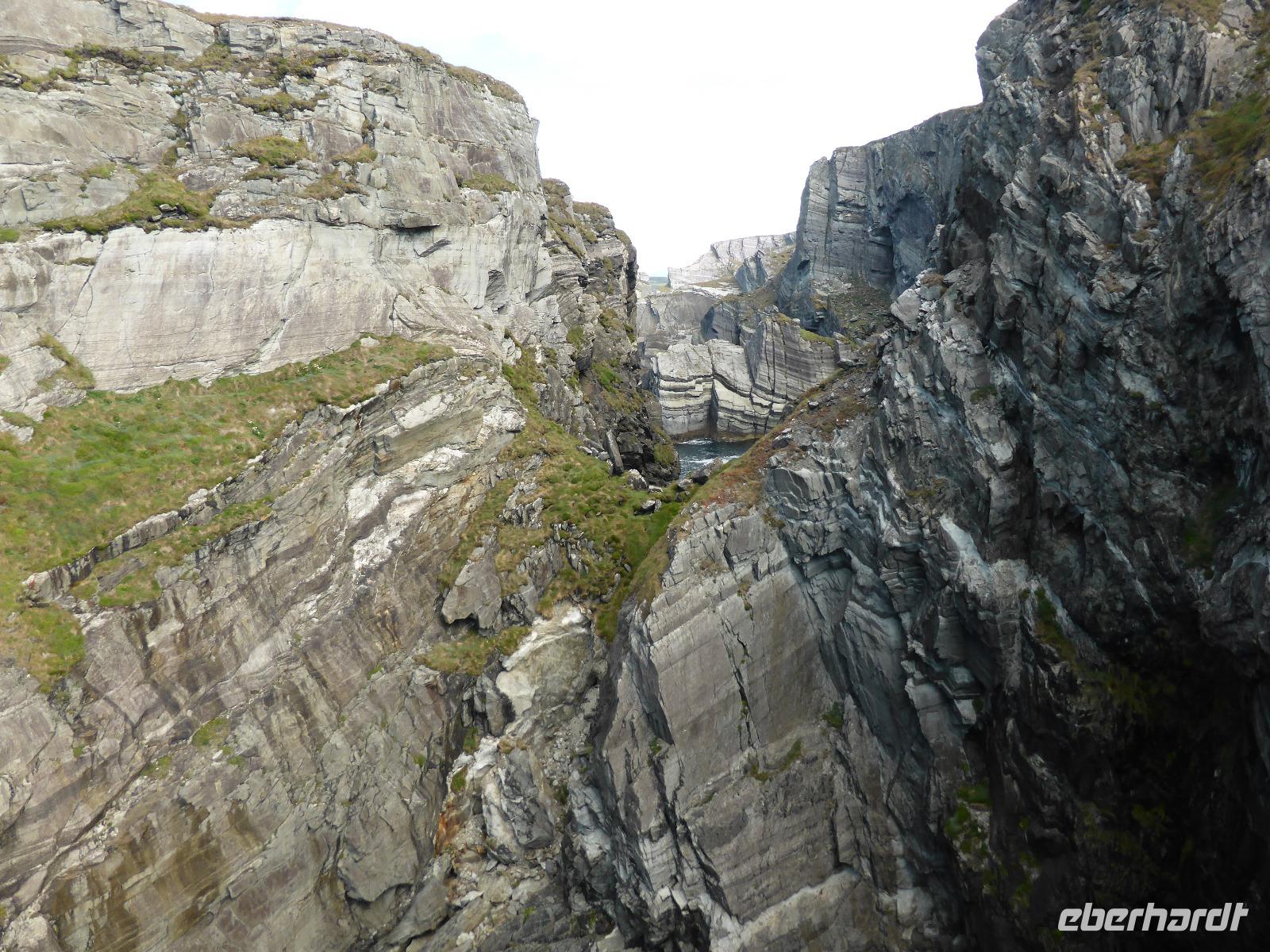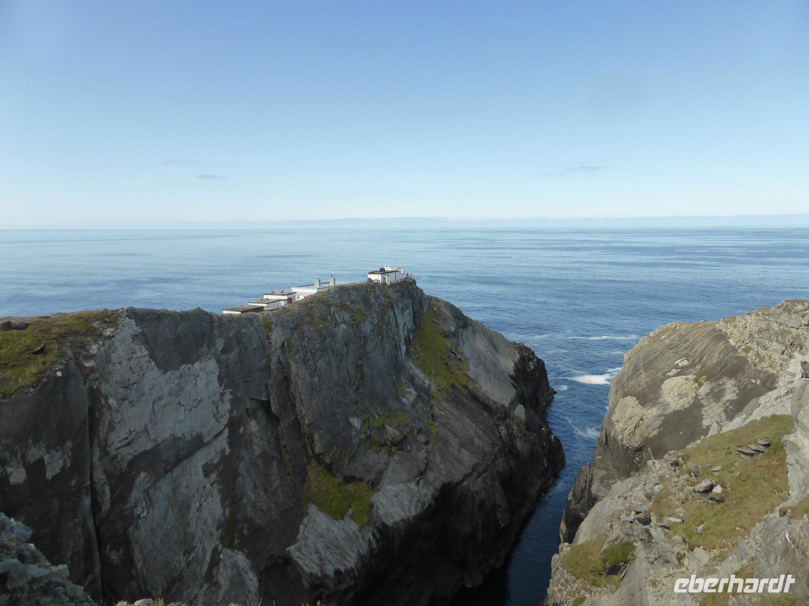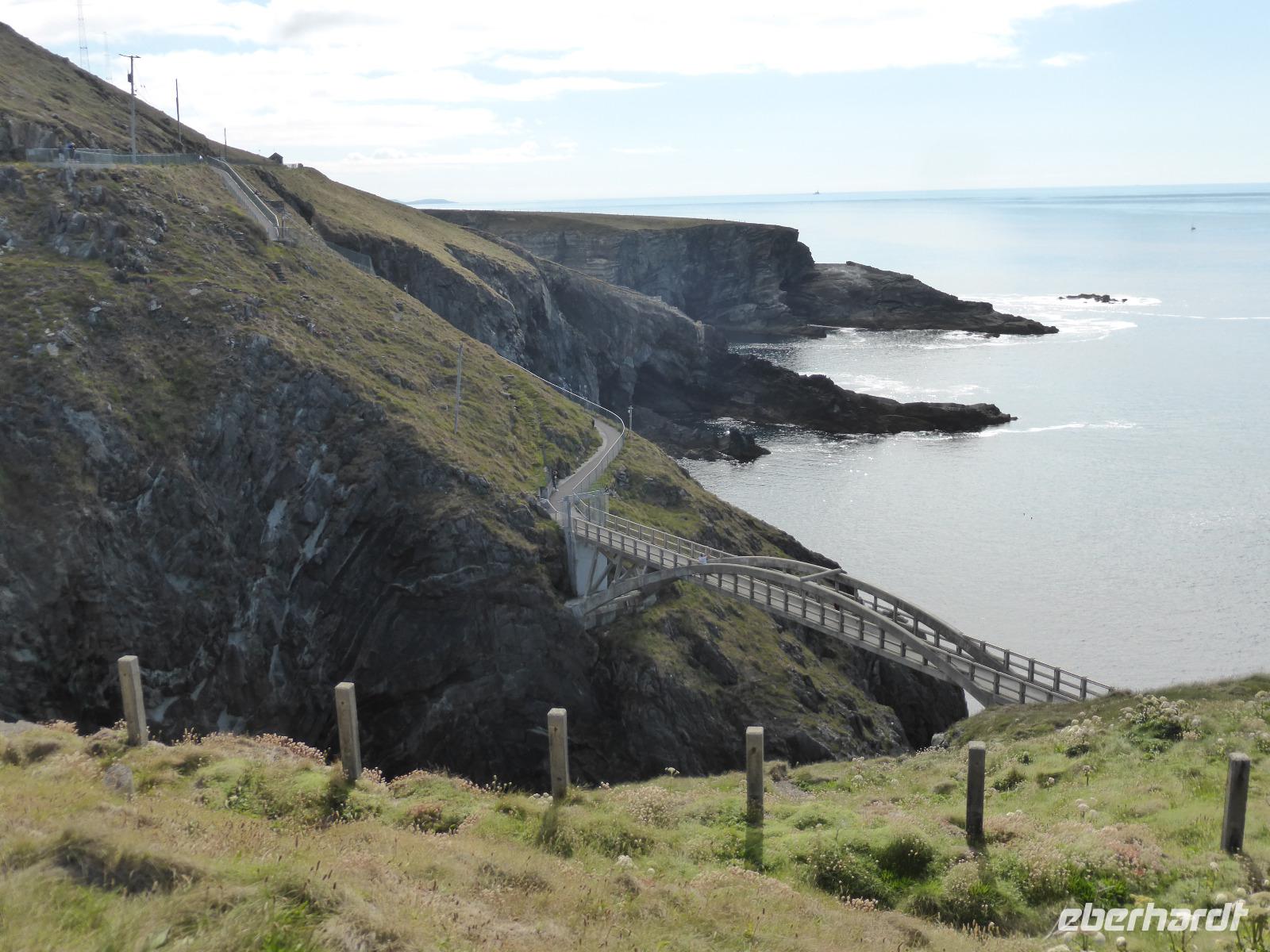 Heute stand der letzte „Finger" der südwestlichen Halbinseln Irlands - Mizen Head - auf dem Programm. Über Skull gelangten wir auf sehr engen Straßen zum Parkplatz am Mizen Head. Zum Glück waren wir sehr zeitig da, sodass wir noch ohne Probleme unseren Bus drehen konnten. Später wäre dies aufgrund der zahlreichen Autos und Fahrradfahrer nicht mehr möglich gewesen. Mizen Head besticht durch seine spektakuläre Landschaftsszenerie - schroffe Felsen und Klippen mit wunderschönen Blicken auf die Küste. Mit etwas Geduld konnten wir sogar Delphine vor der Küste springen sehen. Nach dem Besucherzentrum erschließen vier Wege die einzelnen Aussichtspunkte. Über die neue Brücke von 2011 konnten wir die alte Signalstation erreichen. Diese Station wird heute als Ausstellungsraum für Flora und Fauna sowie Leuchttürme Irlands genutzt.